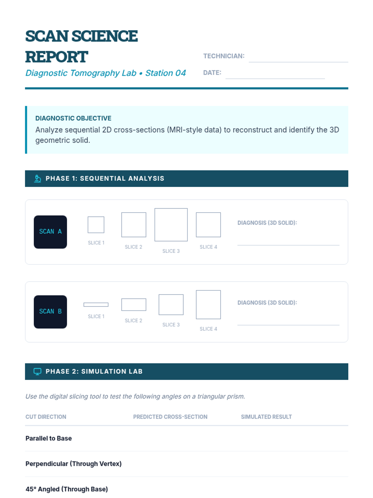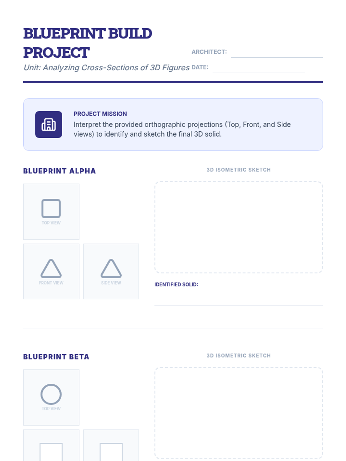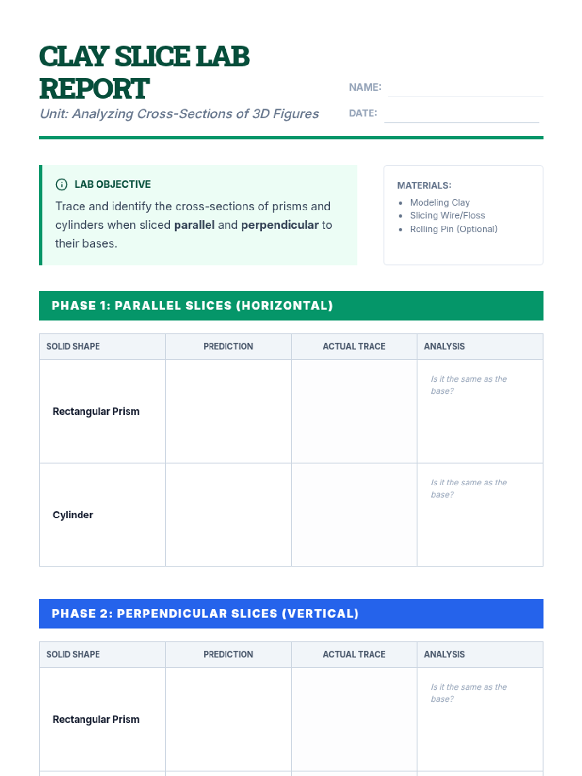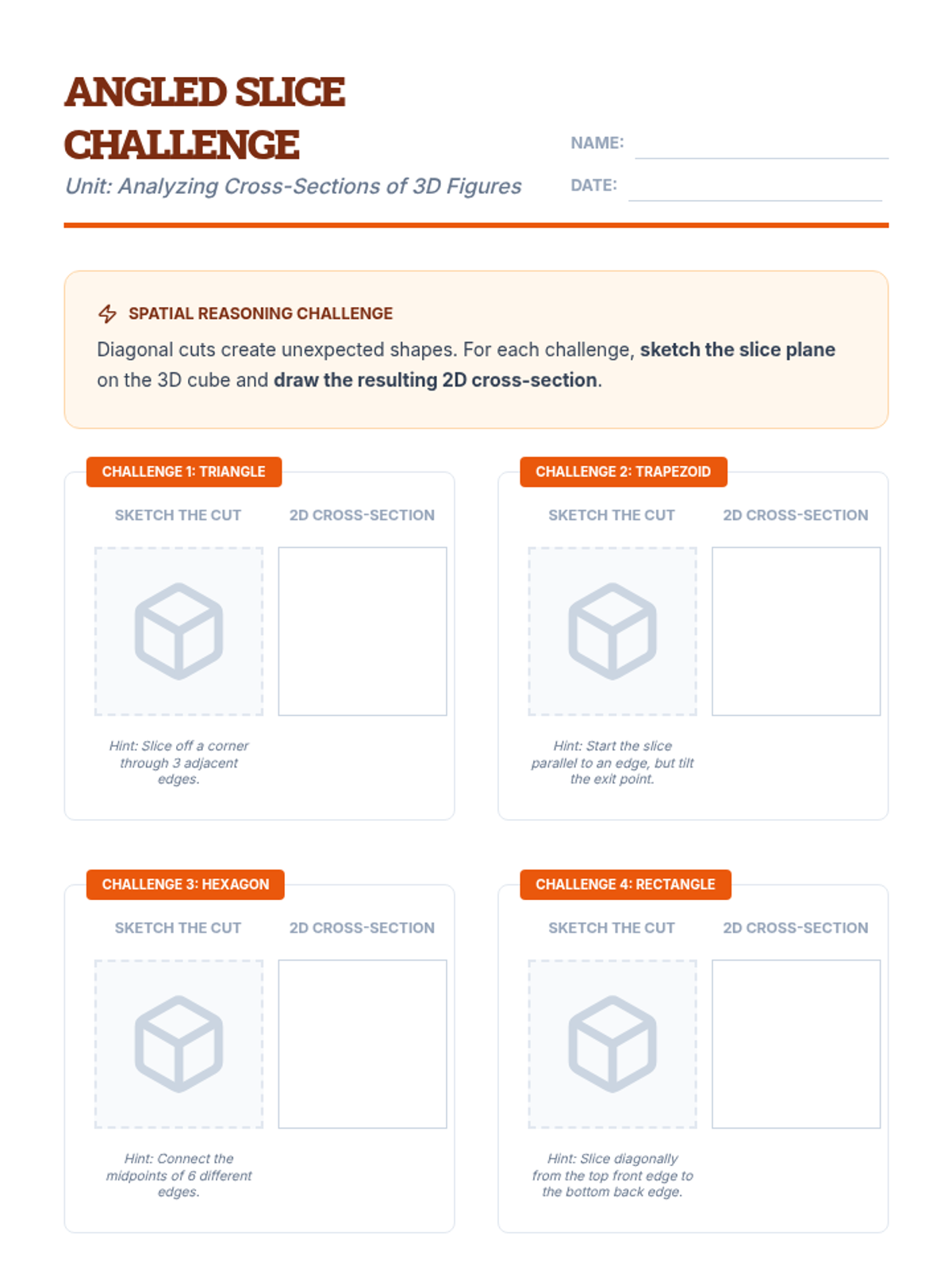 This hands-on sequence focuses on spatial visualization, specifically the relationship between three-dimensional solids and two-dimensional figures. Students explore how slicing 3D objects creates 2D cross-sections, progressing from basic classification to complex angled cuts and orthographic projections.