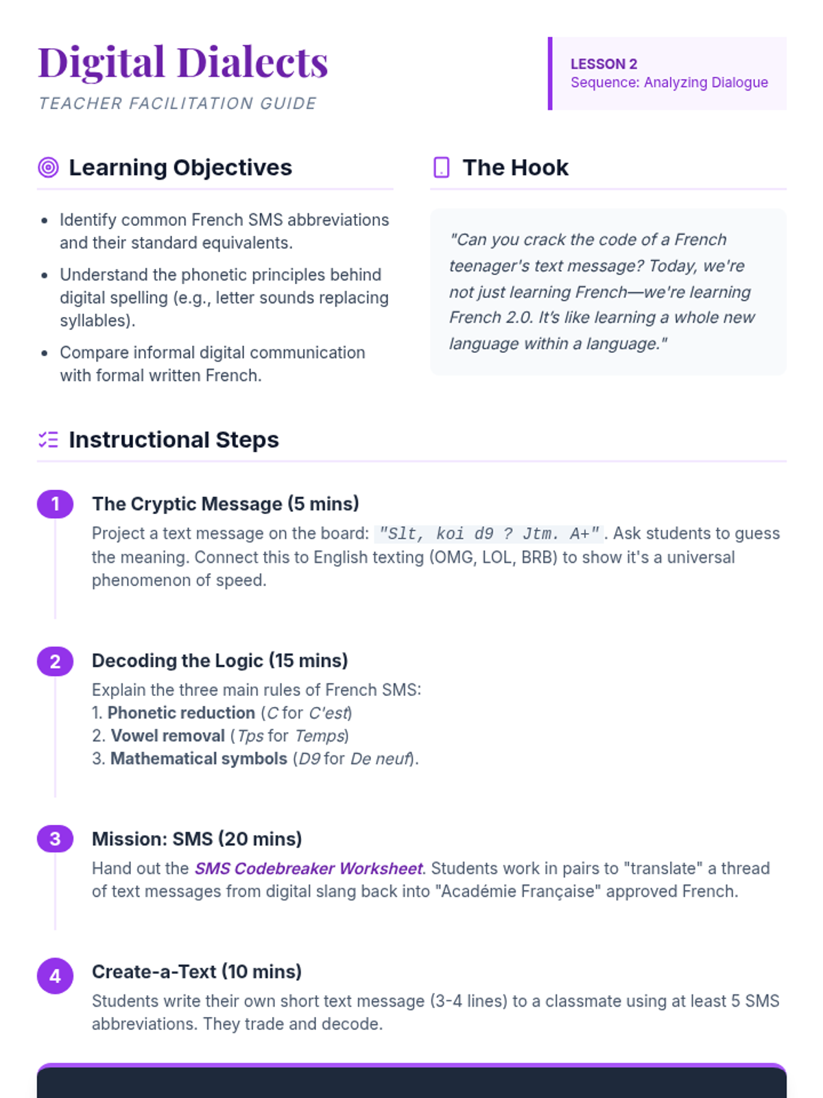 A 7th-grade French reading sequence focused on interpersonal communication, exploring formal vs. informal registers, digital slang, and emotional tone in scripts.