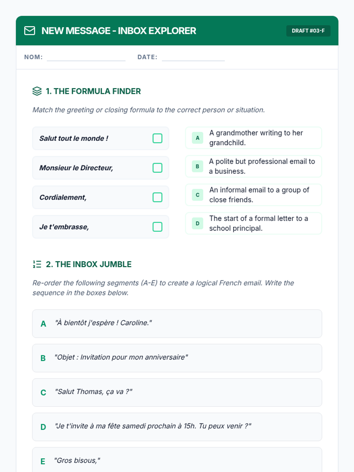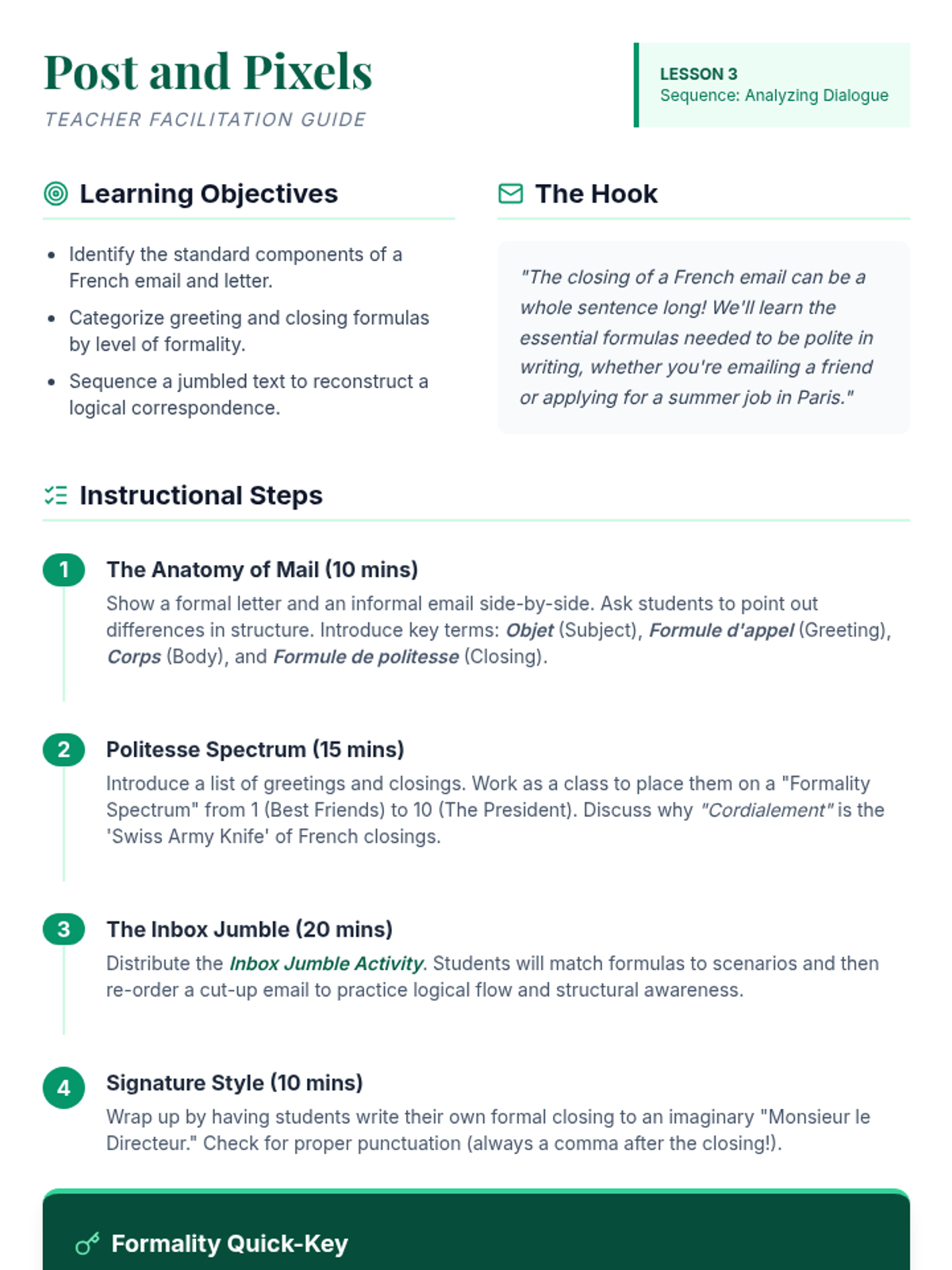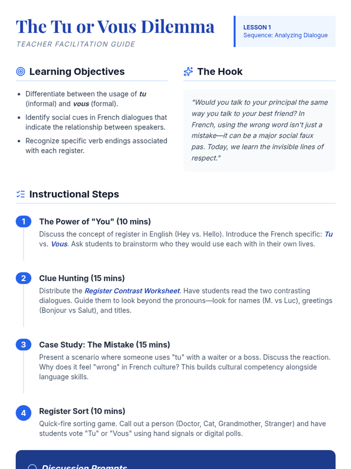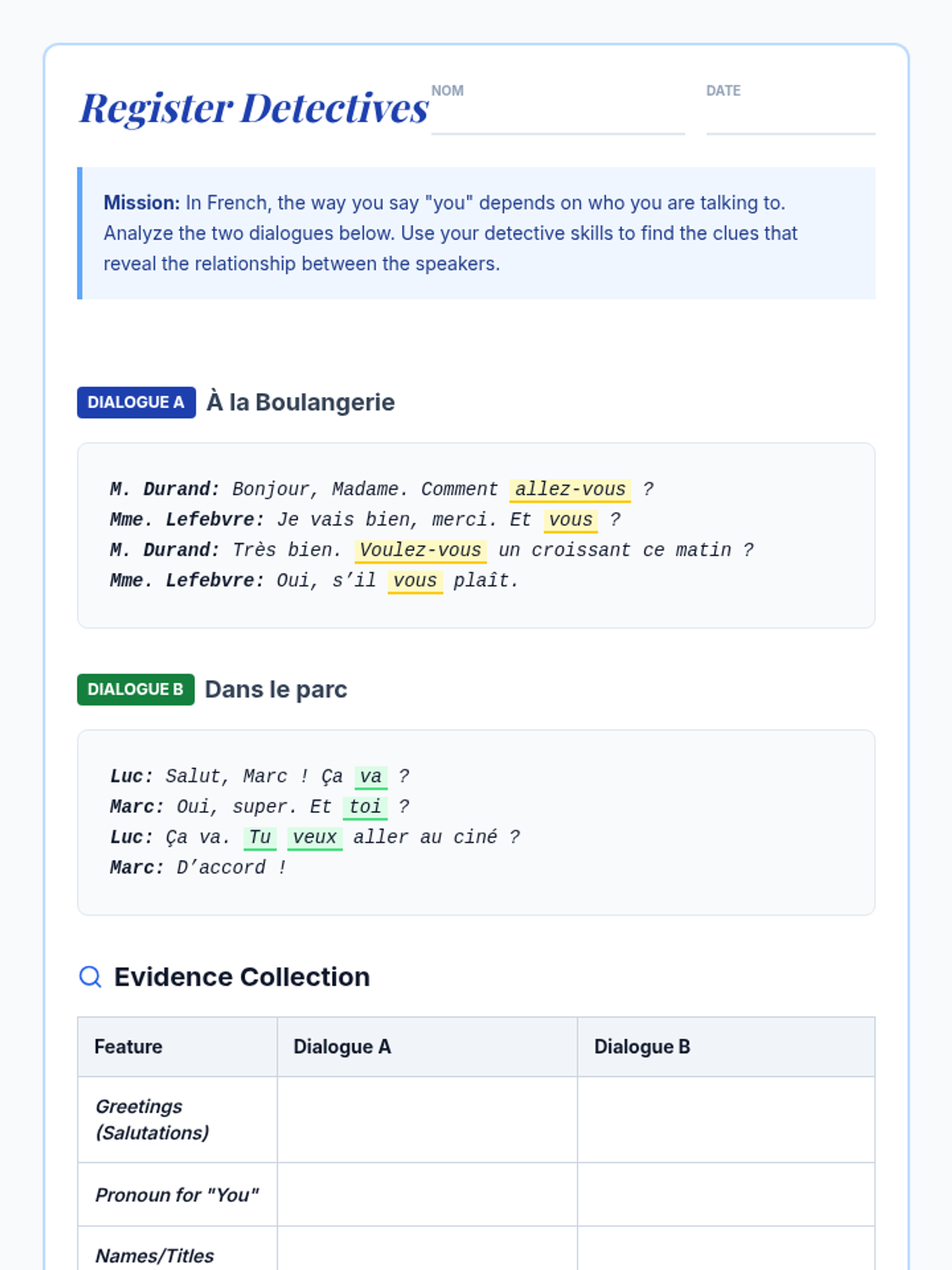 A beginner French listening sequence where students act as social observers, analyzing registers, personal details, family structures, and preferences through auditory scripts.