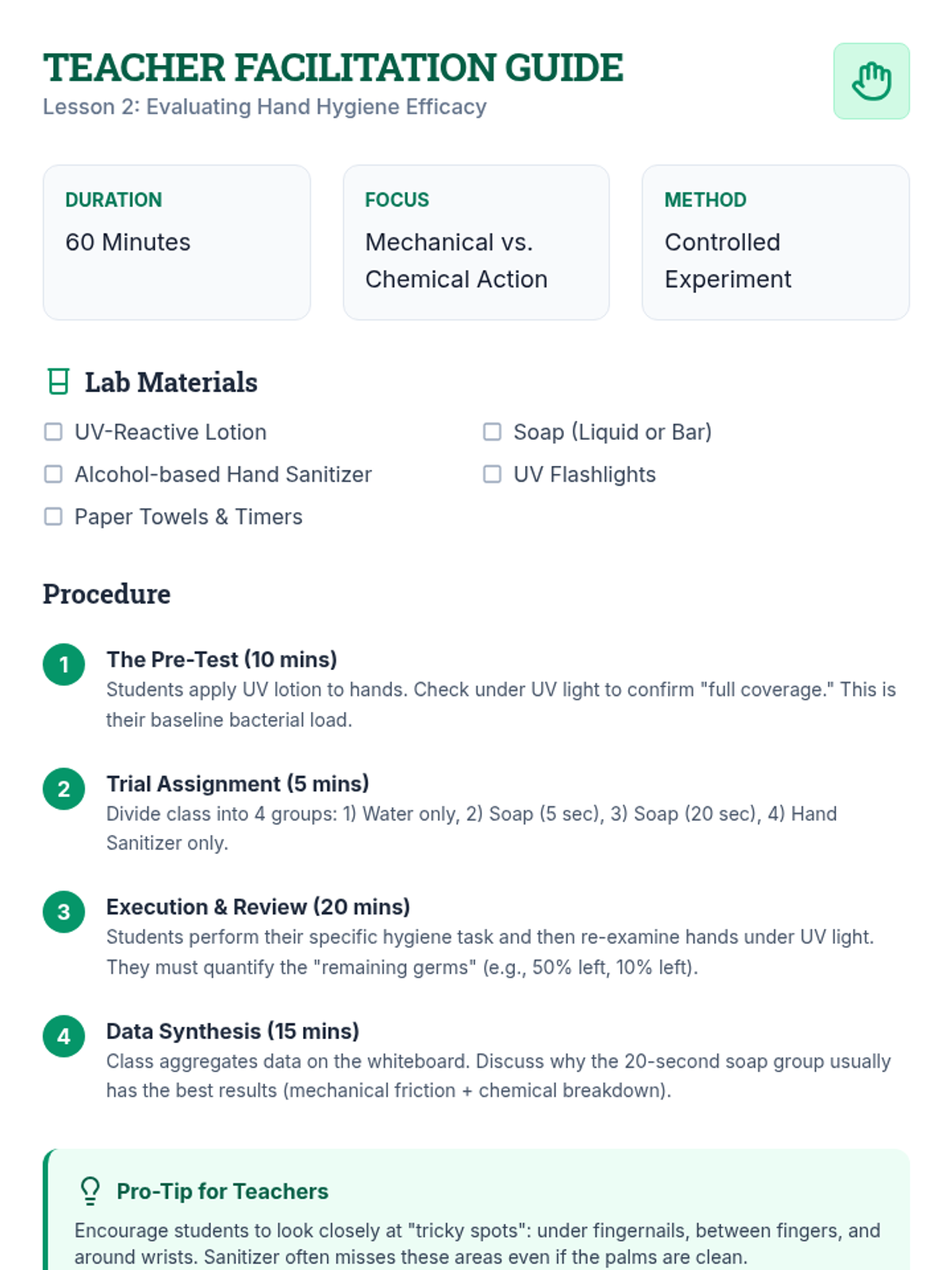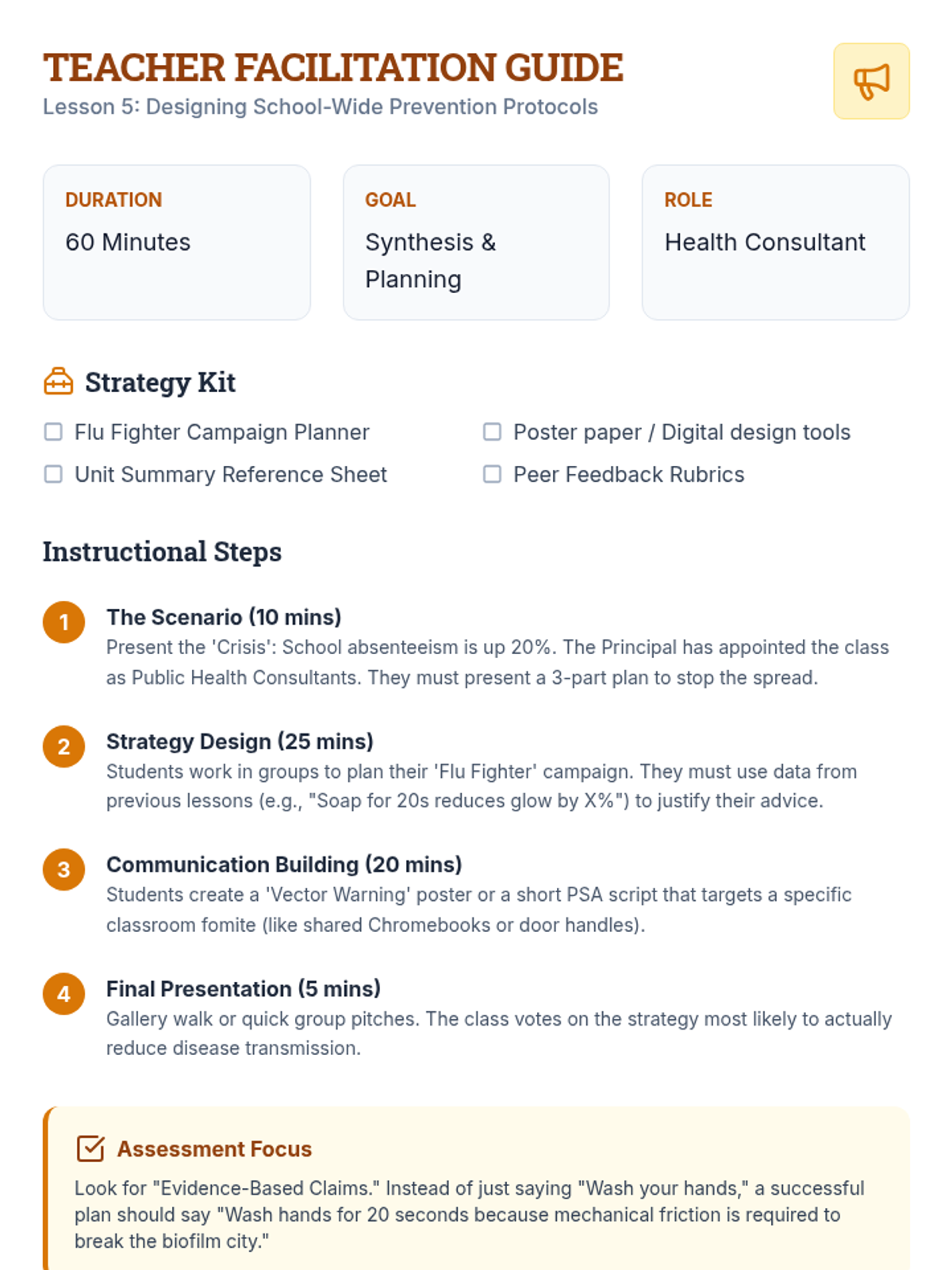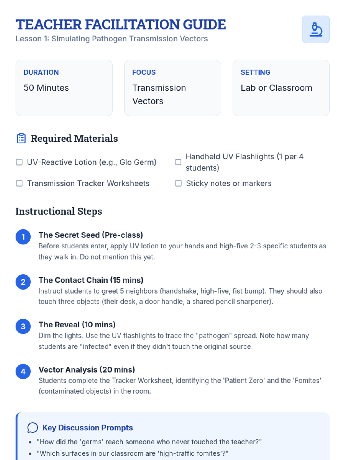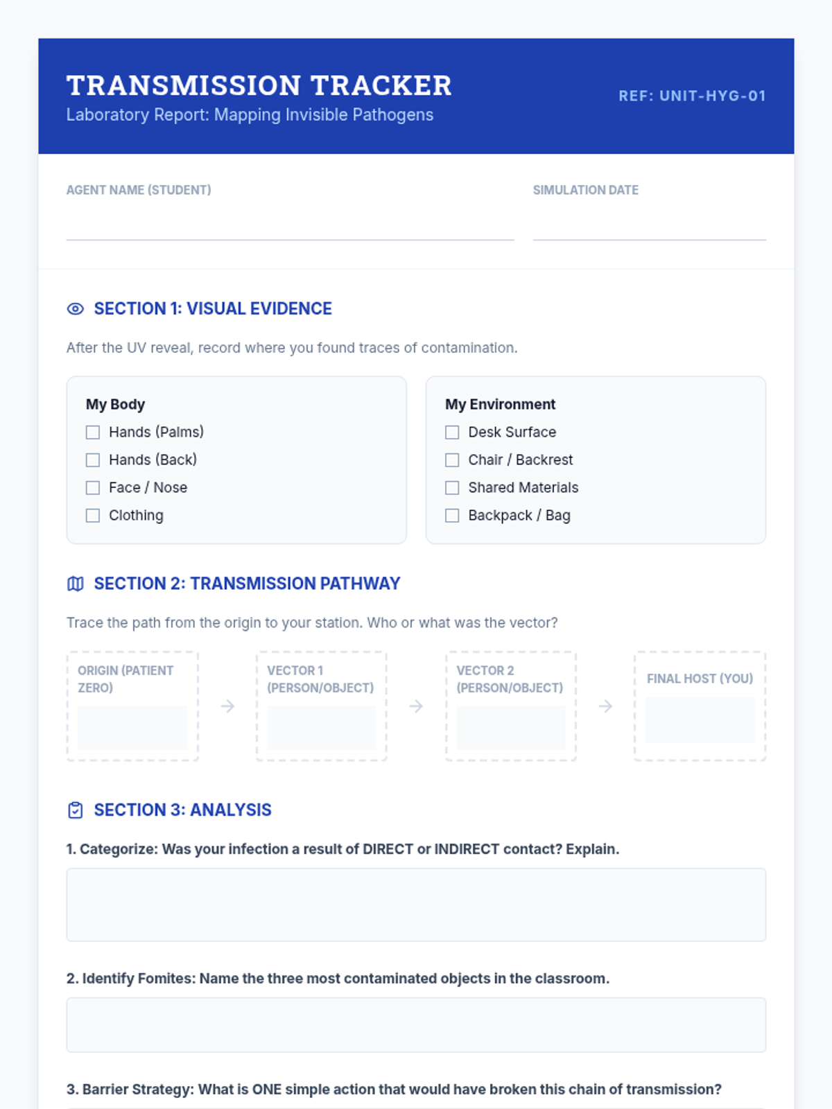 A comprehensive 7th-grade unit exploring the science of hygiene, disease transmission, and public health through simulations, experiments, and strategic planning.