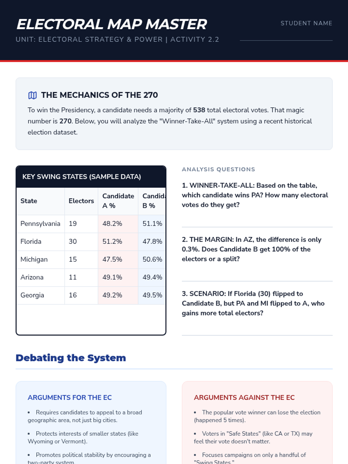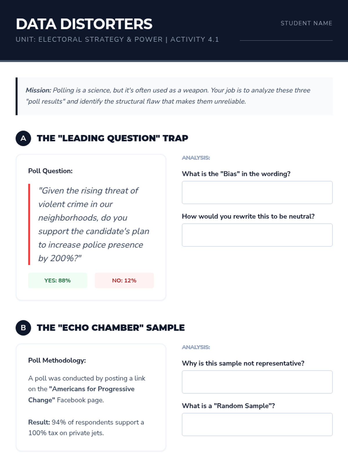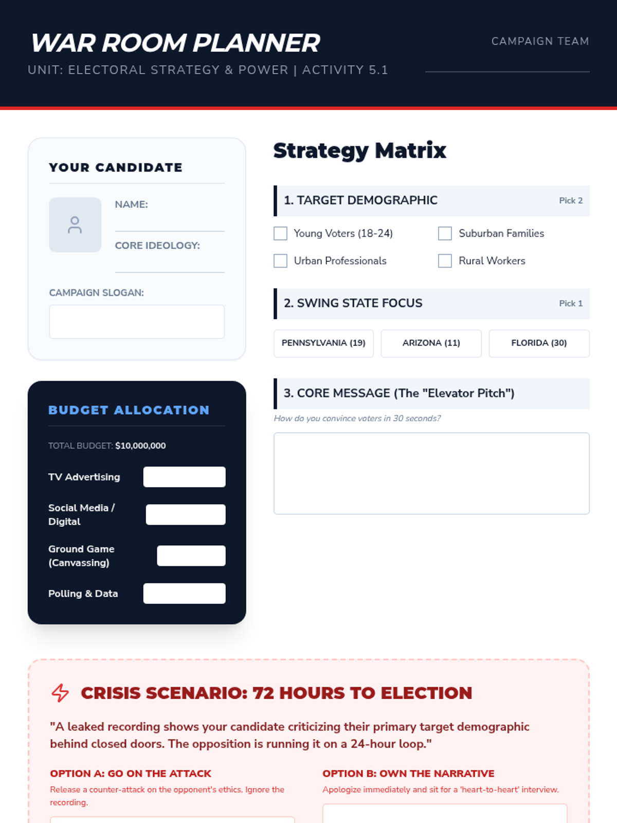 This sequence immerses 9th-grade students in the mechanics and strategy of the American electoral system. Through a blend of simulations and critical analysis, students examine political ideologies, the Electoral College, campaign finance, and polling to understand how structural mechanisms shape democratic outcomes.