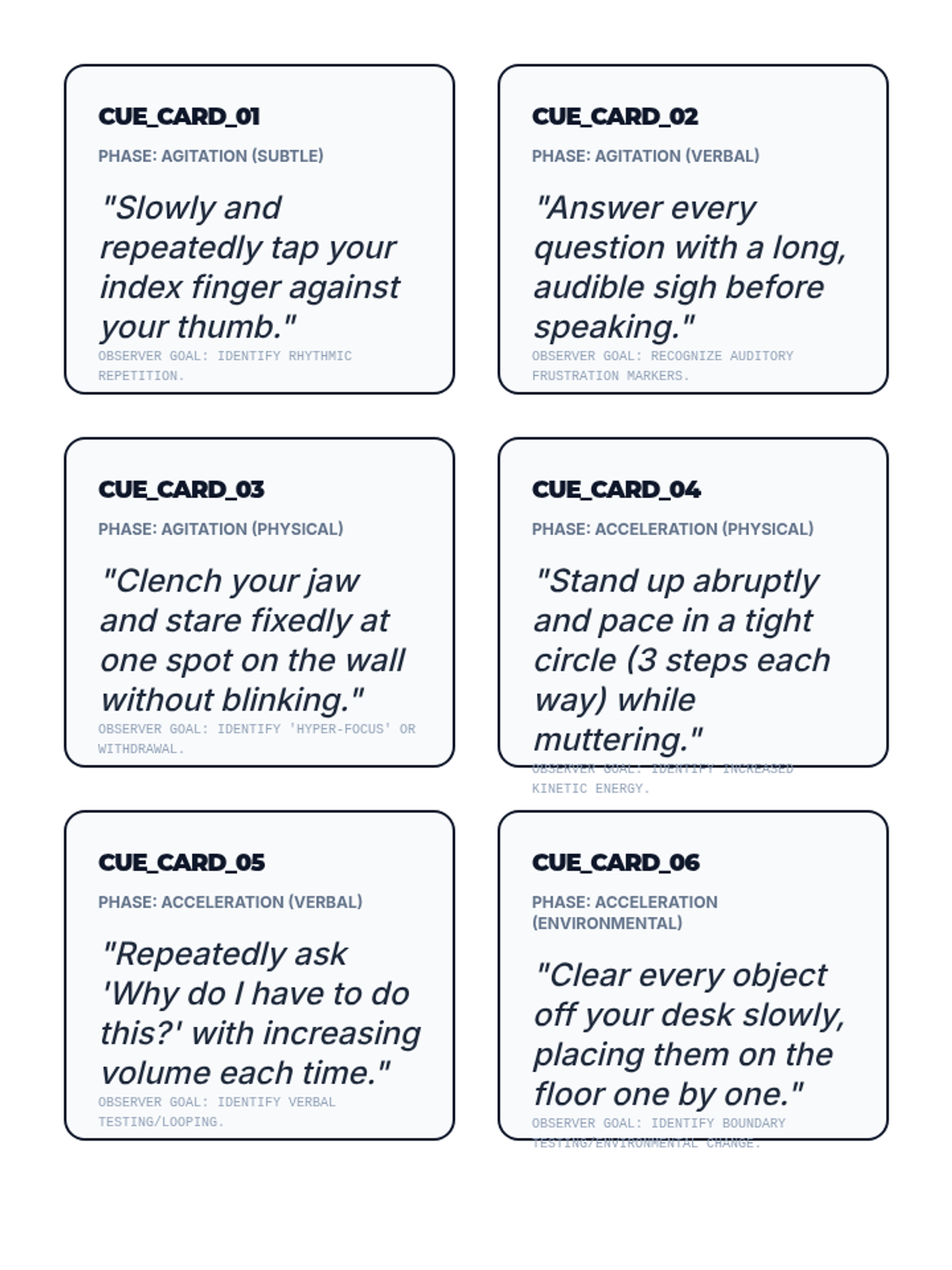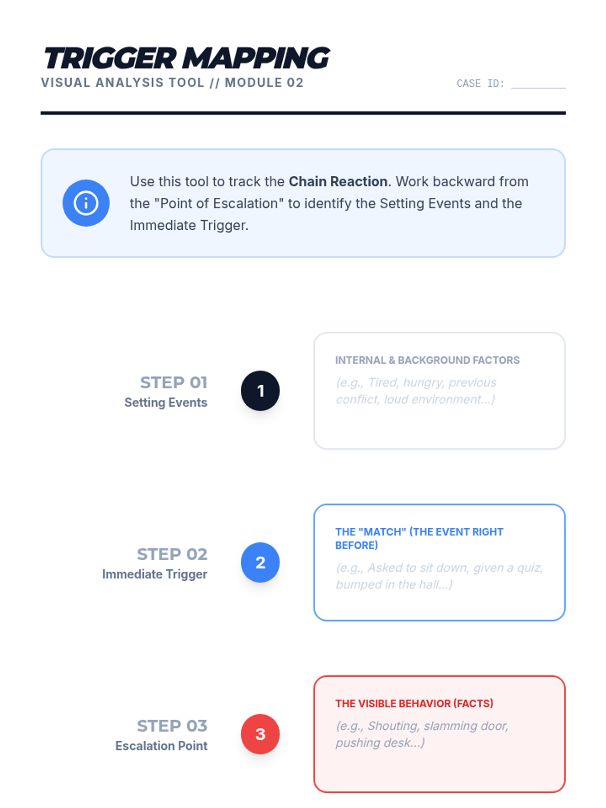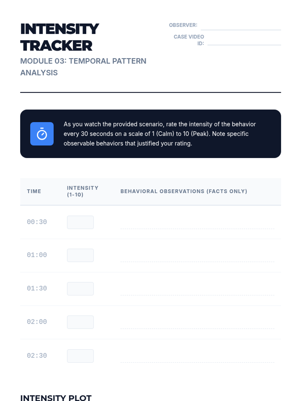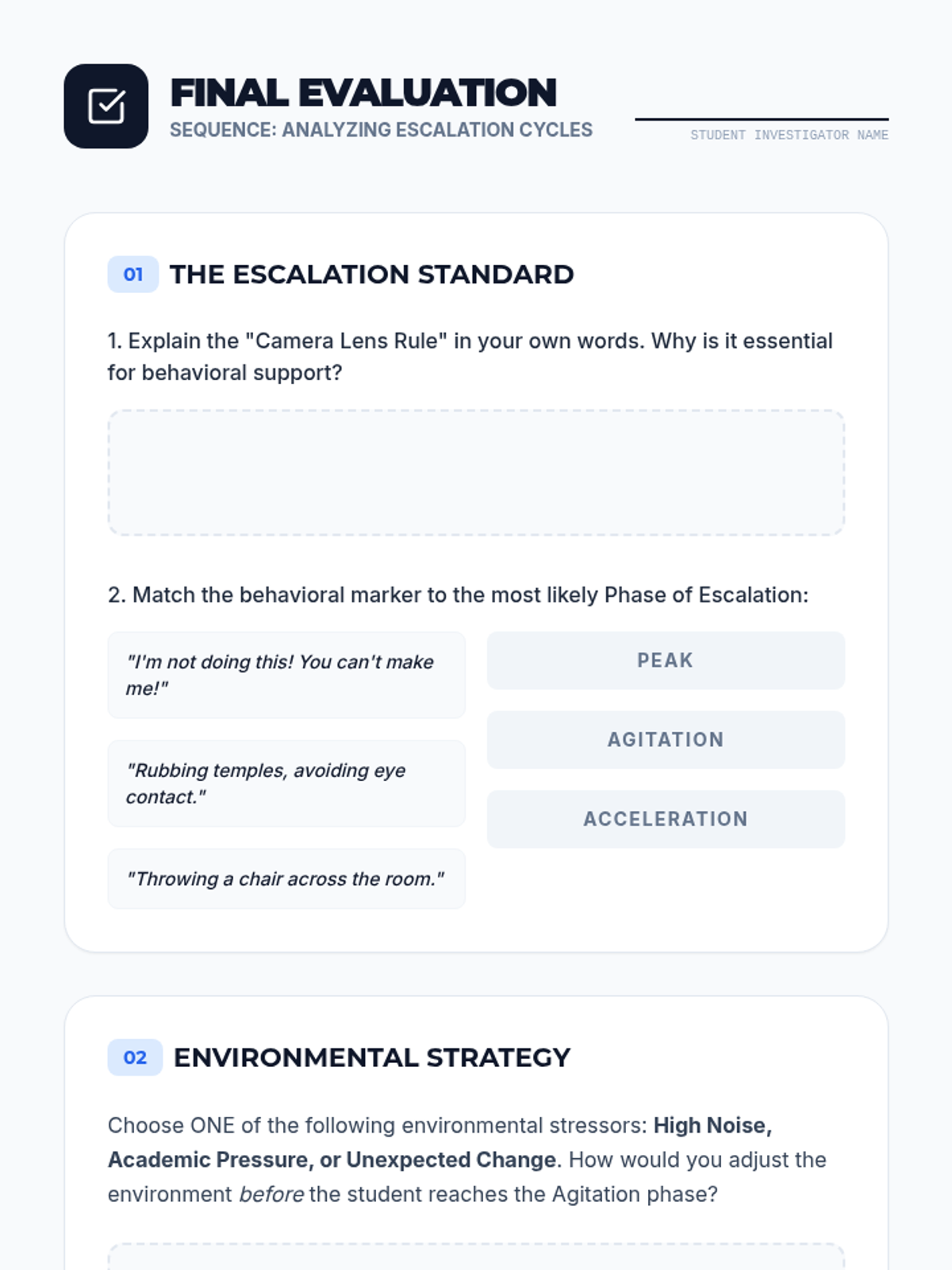 This 5-lesson sequence focuses on identifying behavioral escalation patterns through objective observation, environmental analysis, and real-time simulation. Students learn to distinguish facts from interpretations, map environmental triggers, and track the escalation curve to improve early intervention strategies.