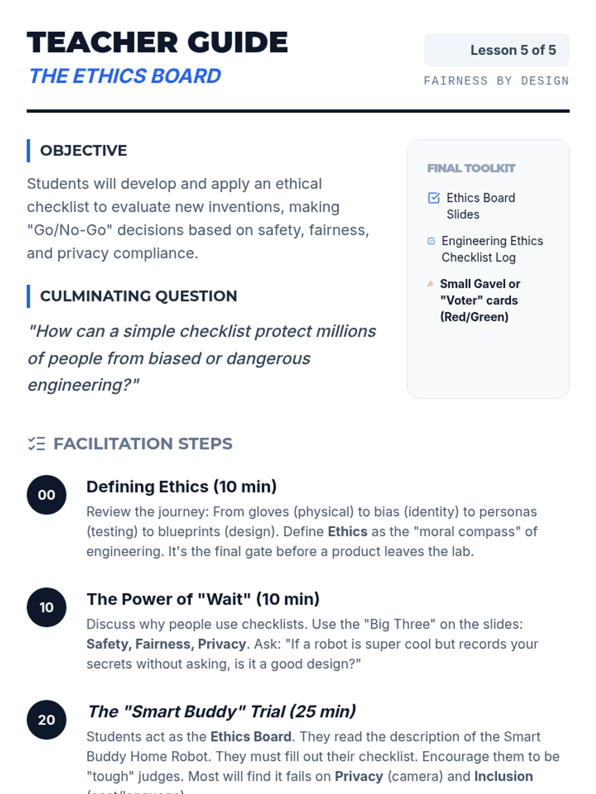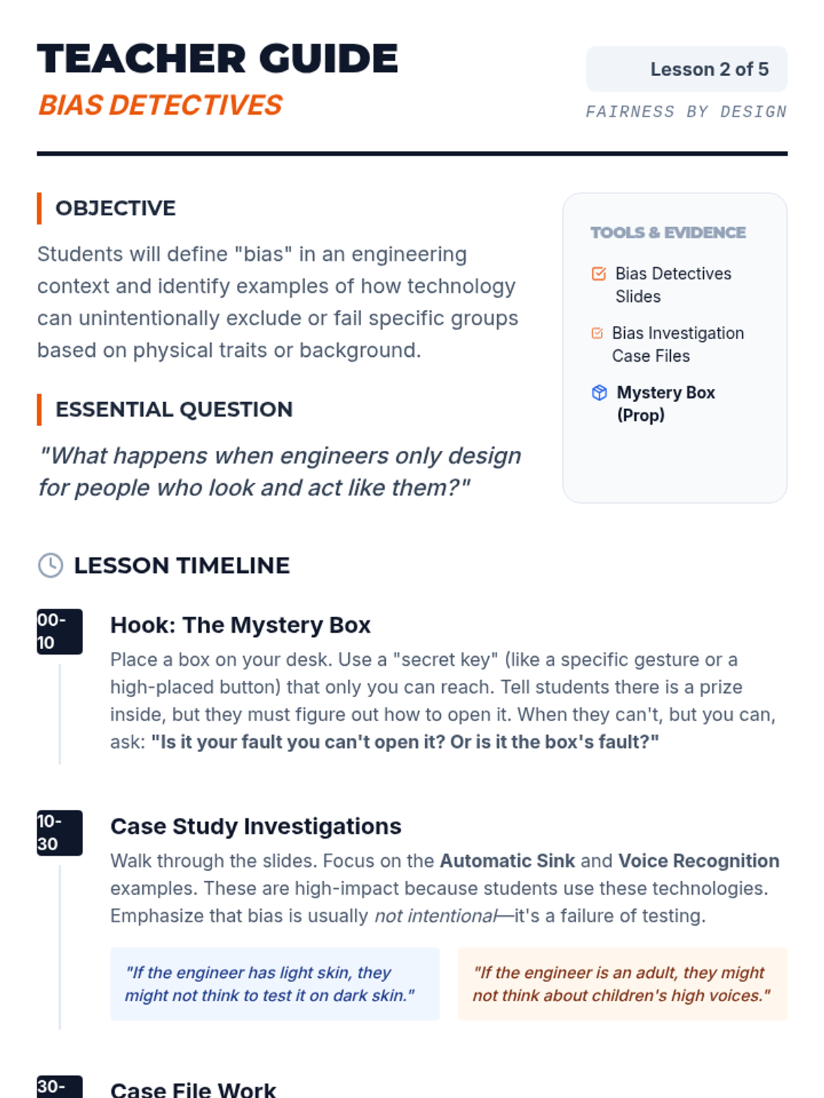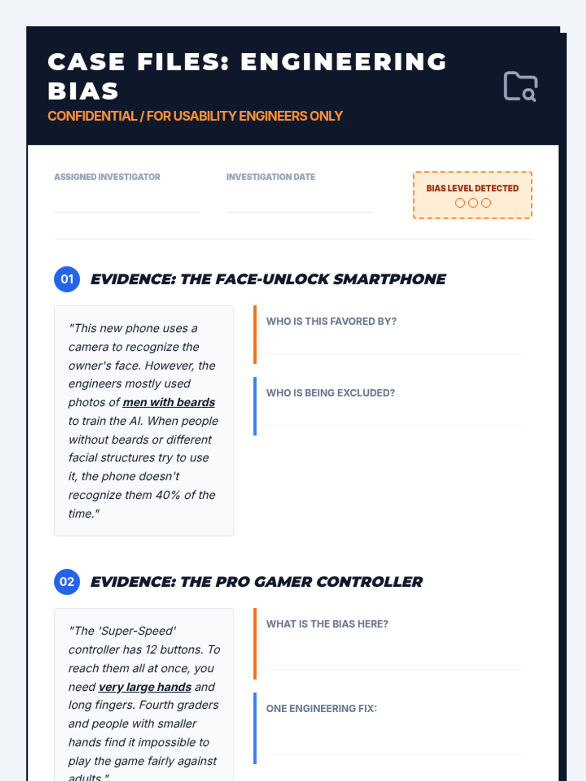 Students explore ethical compliance and bias testing in engineering, learning how technology can exclude people and how to design for fairness and accessibility. They act as usability engineers to analyze, test, and redesign products for diverse users.