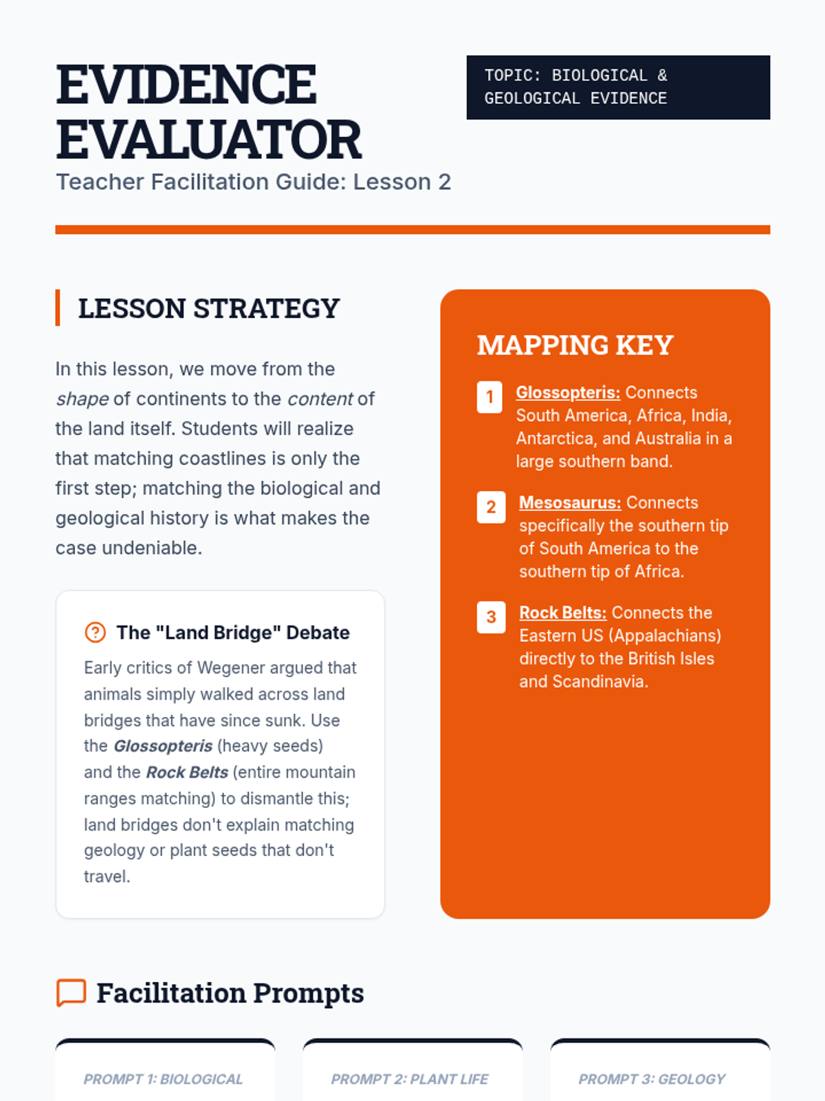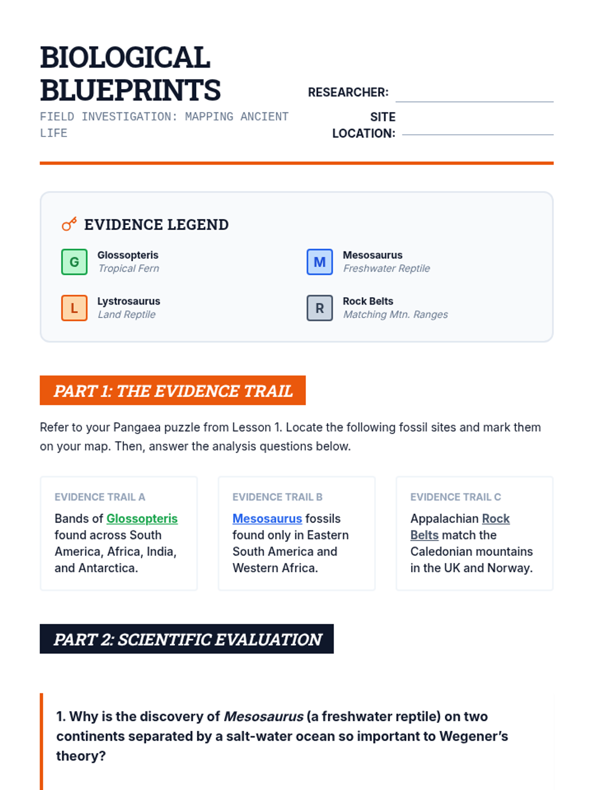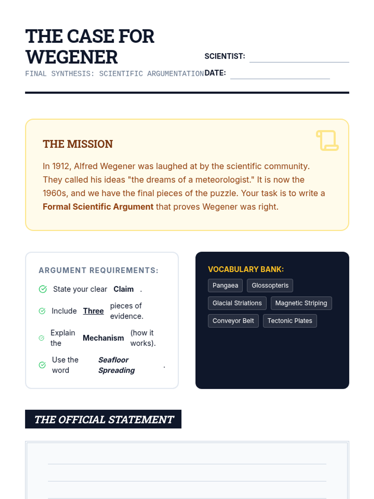 An inquiry-driven journey through the historical and scientific process of validating the theory of Plate Tectonics. Students analyze fossil, climate, and geological data to reconstruct Pangaea and discover the mechanism of seafloor spreading.