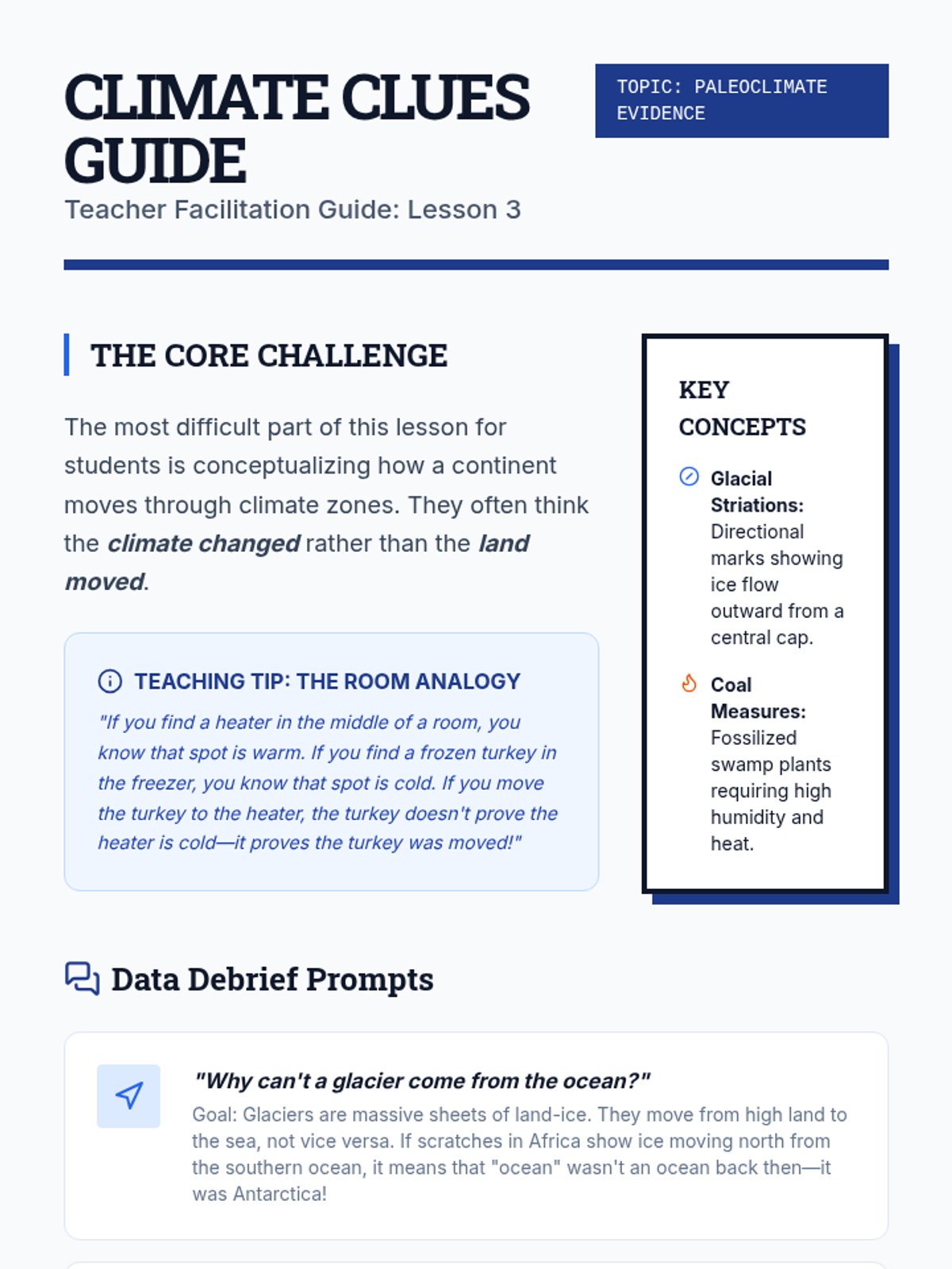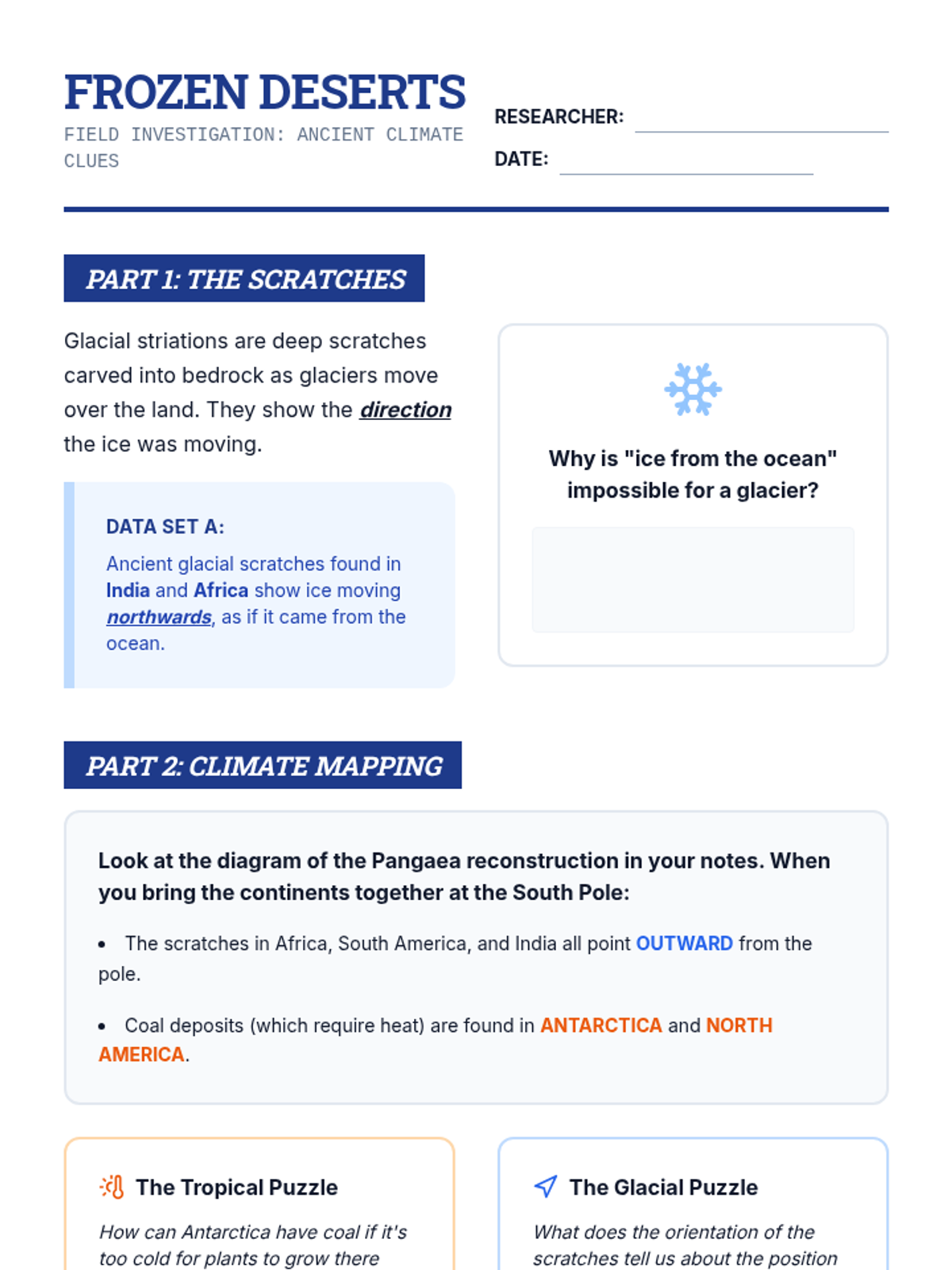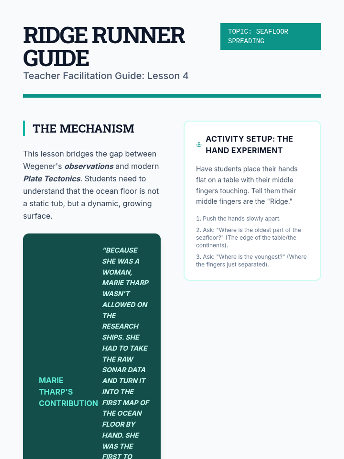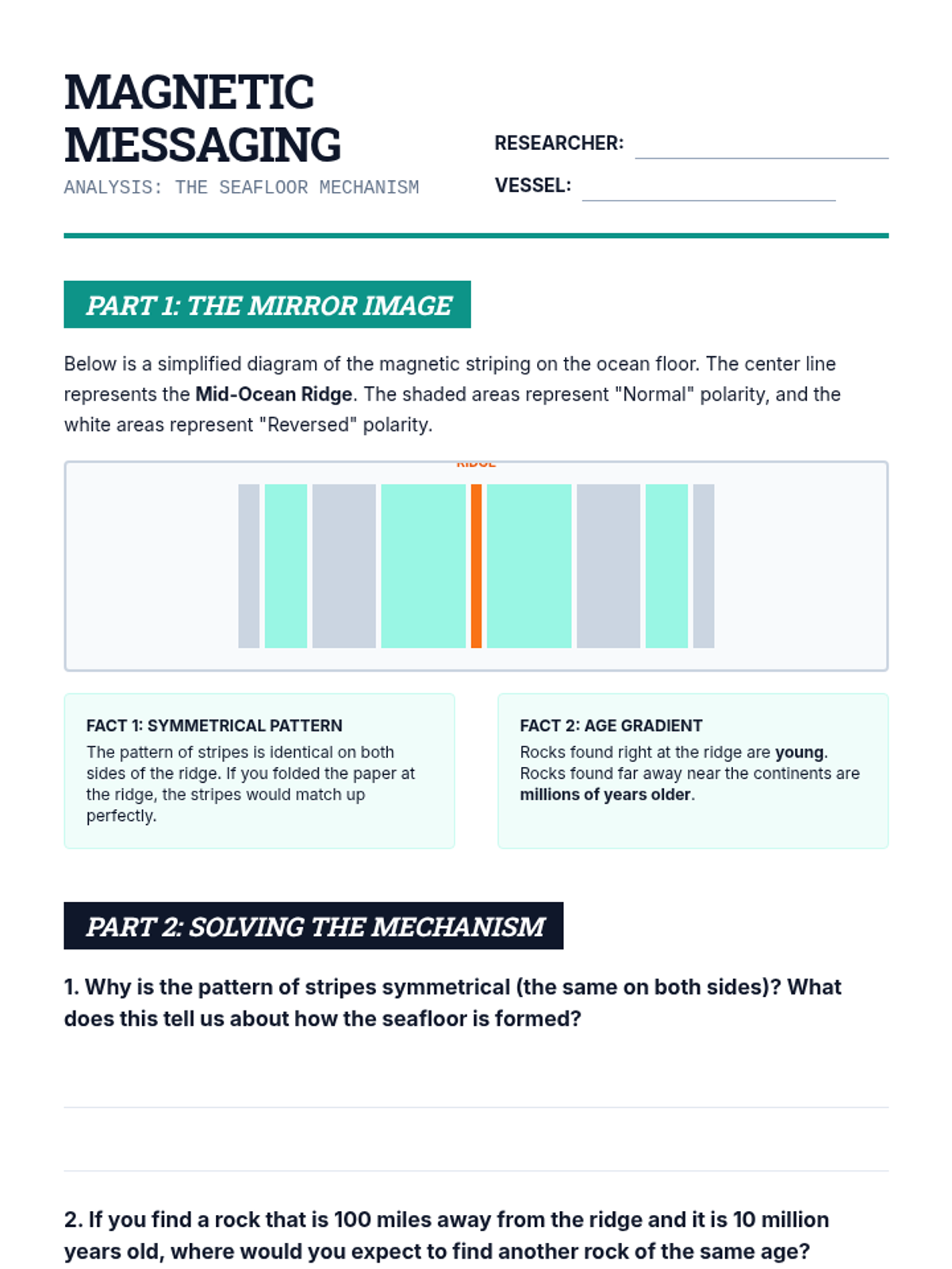 An inquiry-driven journey through the historical and scientific process of validating the theory of Plate Tectonics. Students analyze fossil, climate, and geological data to reconstruct Pangaea and discover the mechanism of seafloor spreading.
