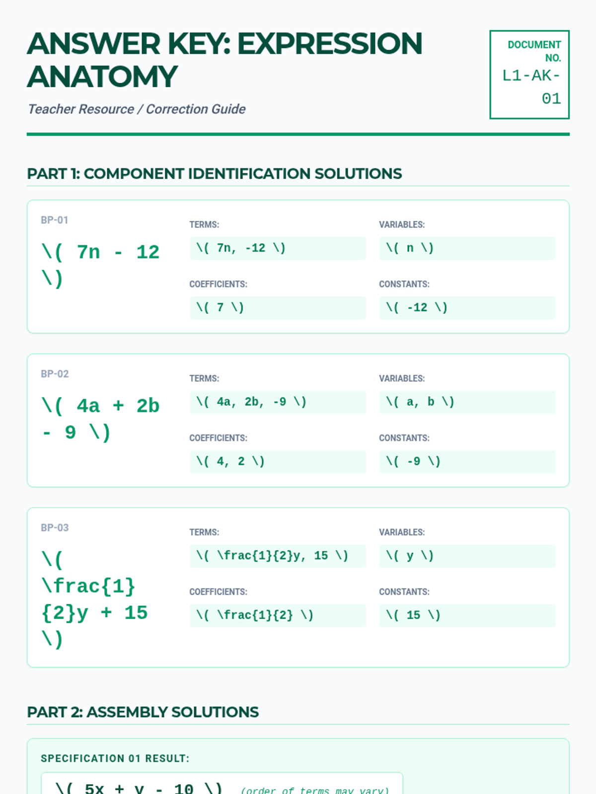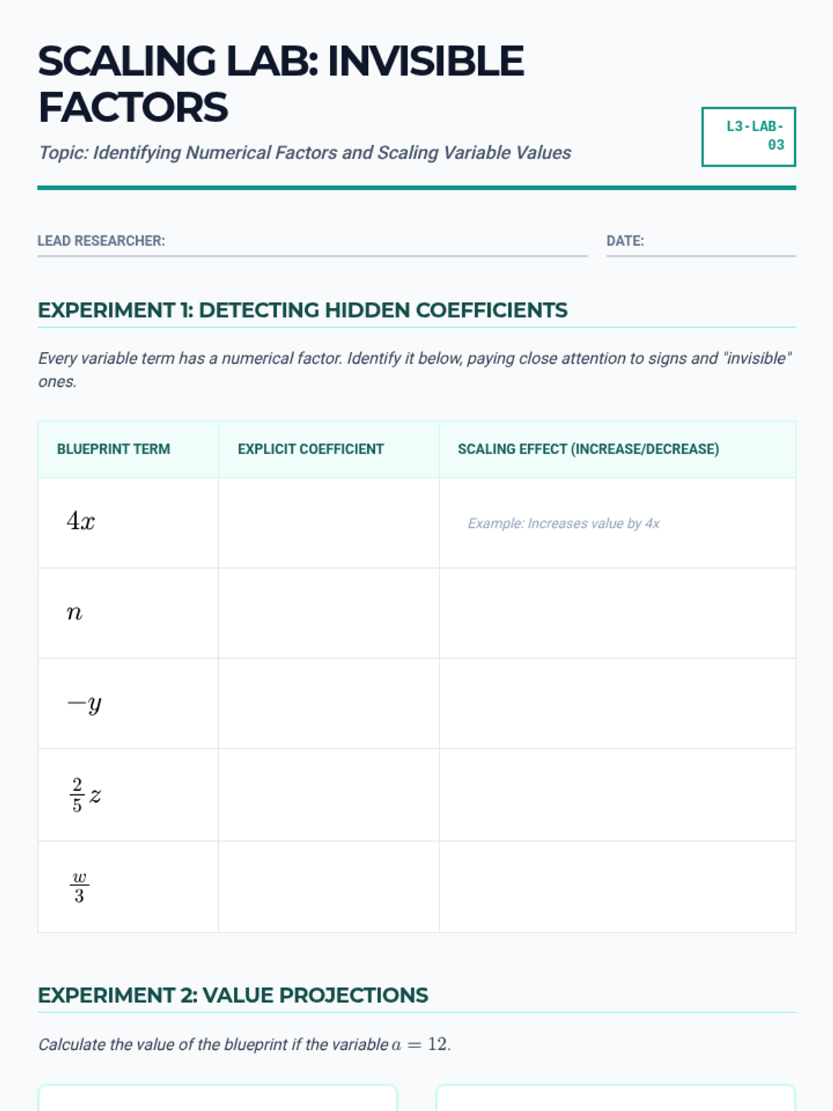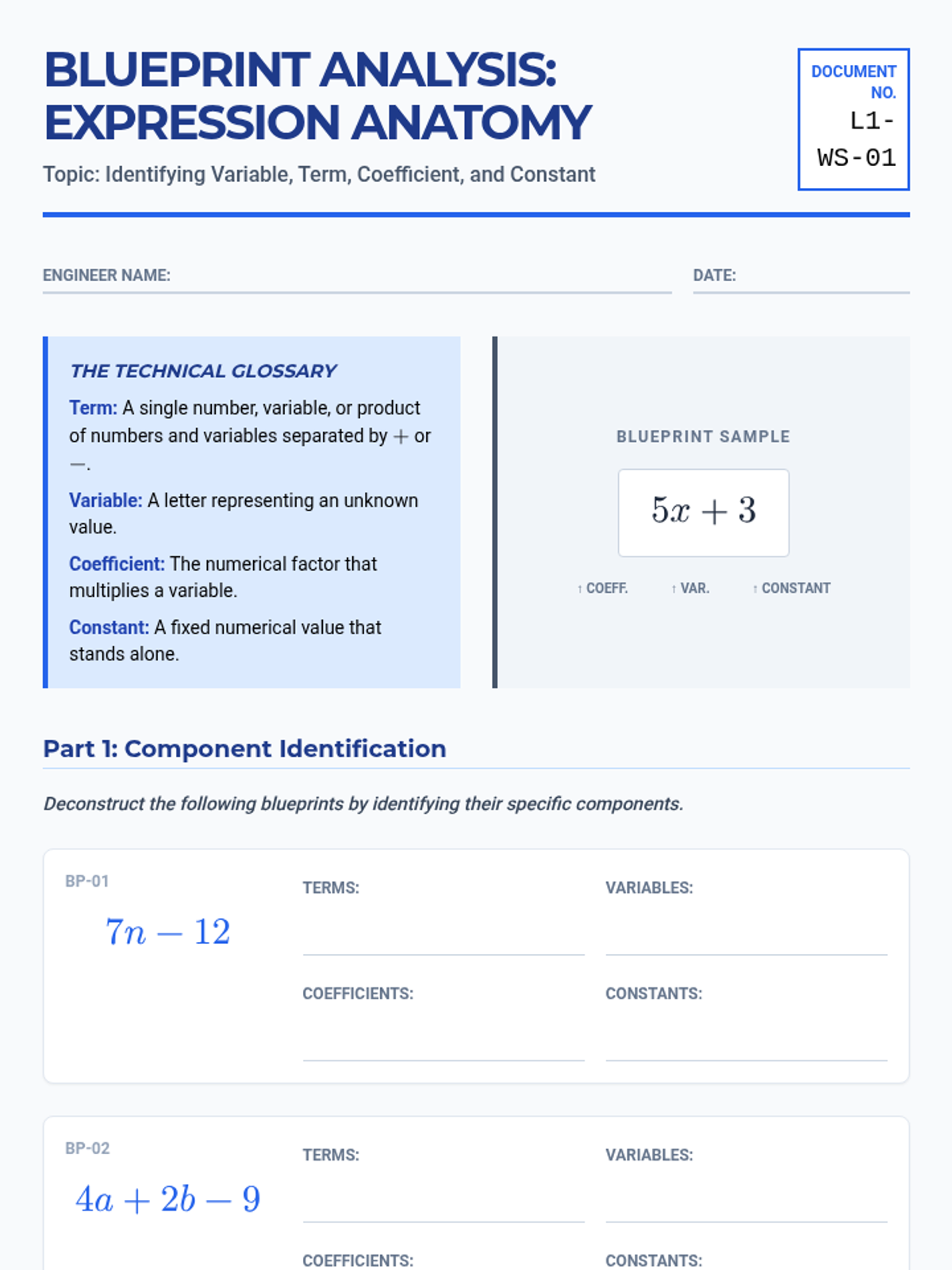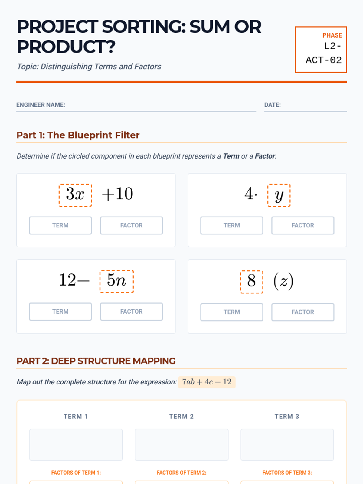 This sequence guides 8th-grade students through the structural analysis of algebraic expressions, focusing on identifying terms, factors, coefficients, and constants. Students will learn to deconstruct complex expressions like architectural blueprints, understanding how each component contributes to the mathematical whole.