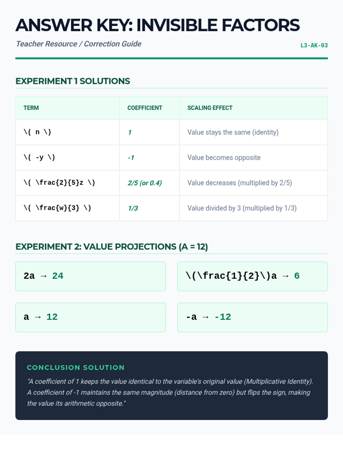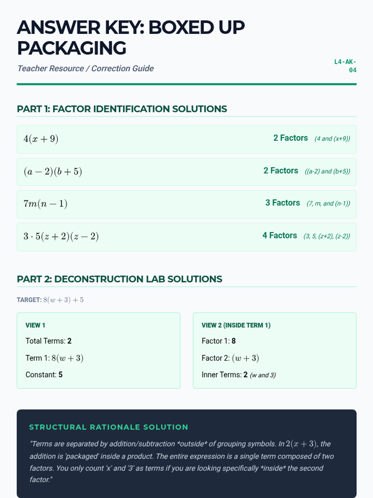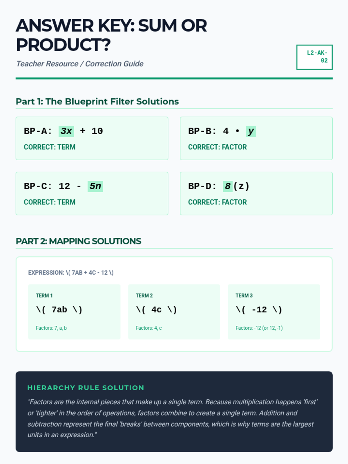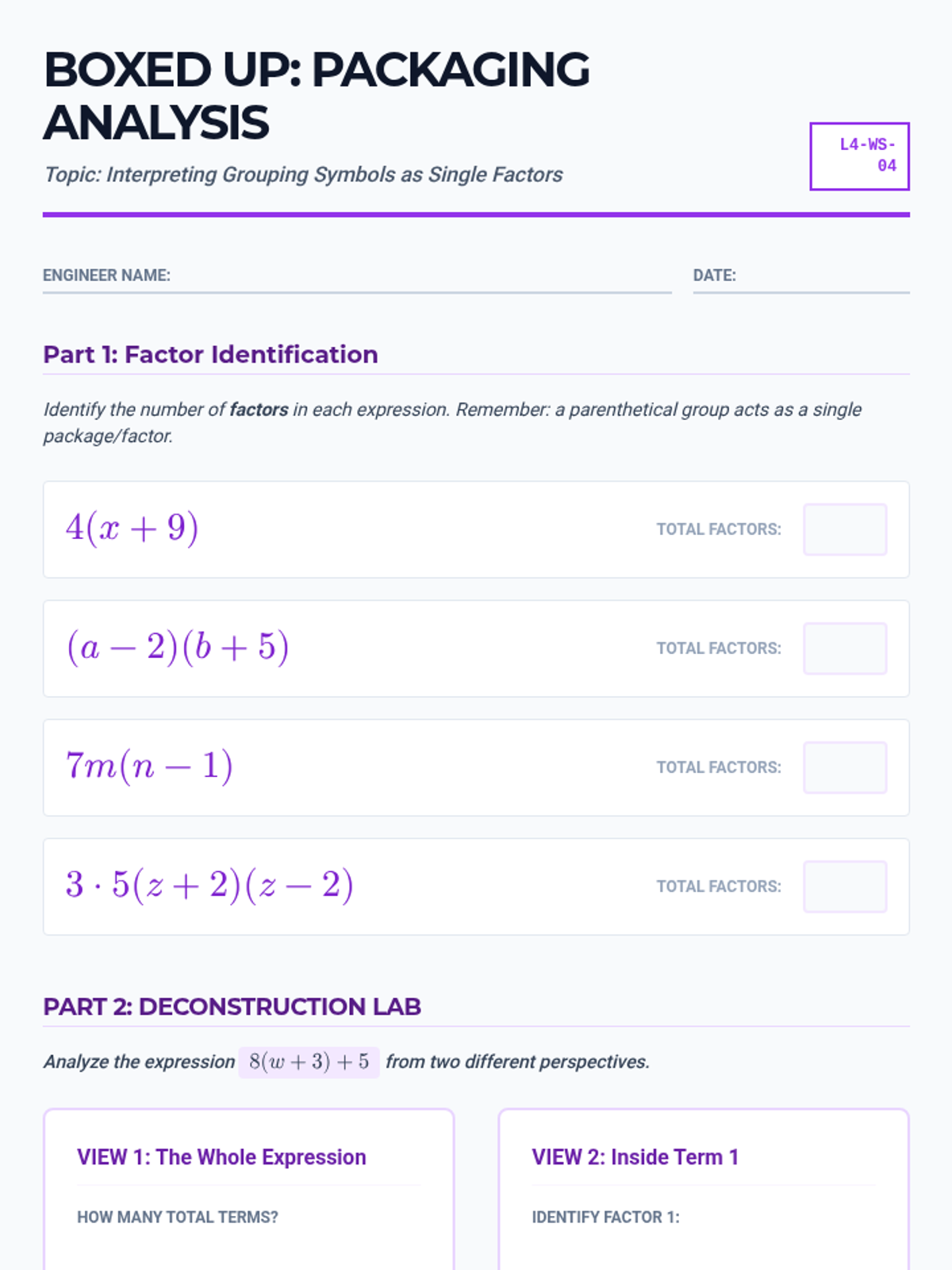 This sequence guides 8th-grade students through the structural analysis of algebraic expressions, focusing on identifying terms, factors, coefficients, and constants. Students will learn to deconstruct complex expressions like architectural blueprints, understanding how each component contributes to the mathematical whole.