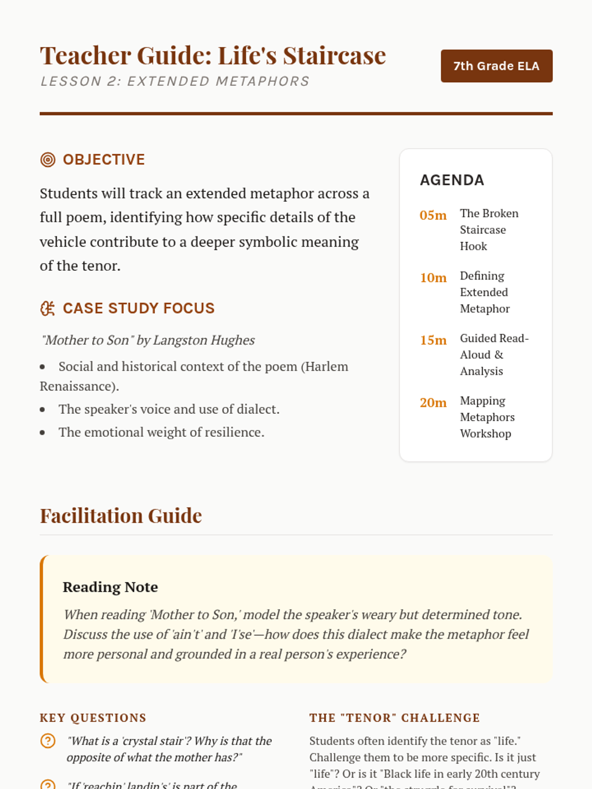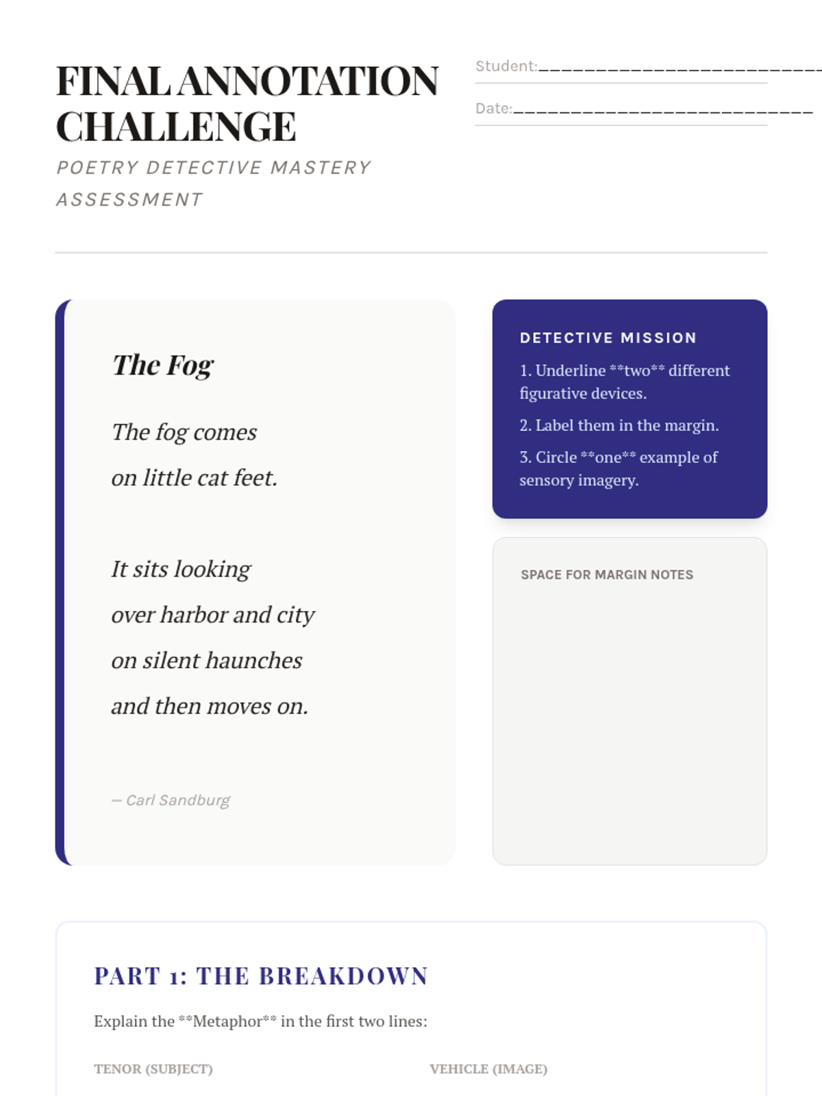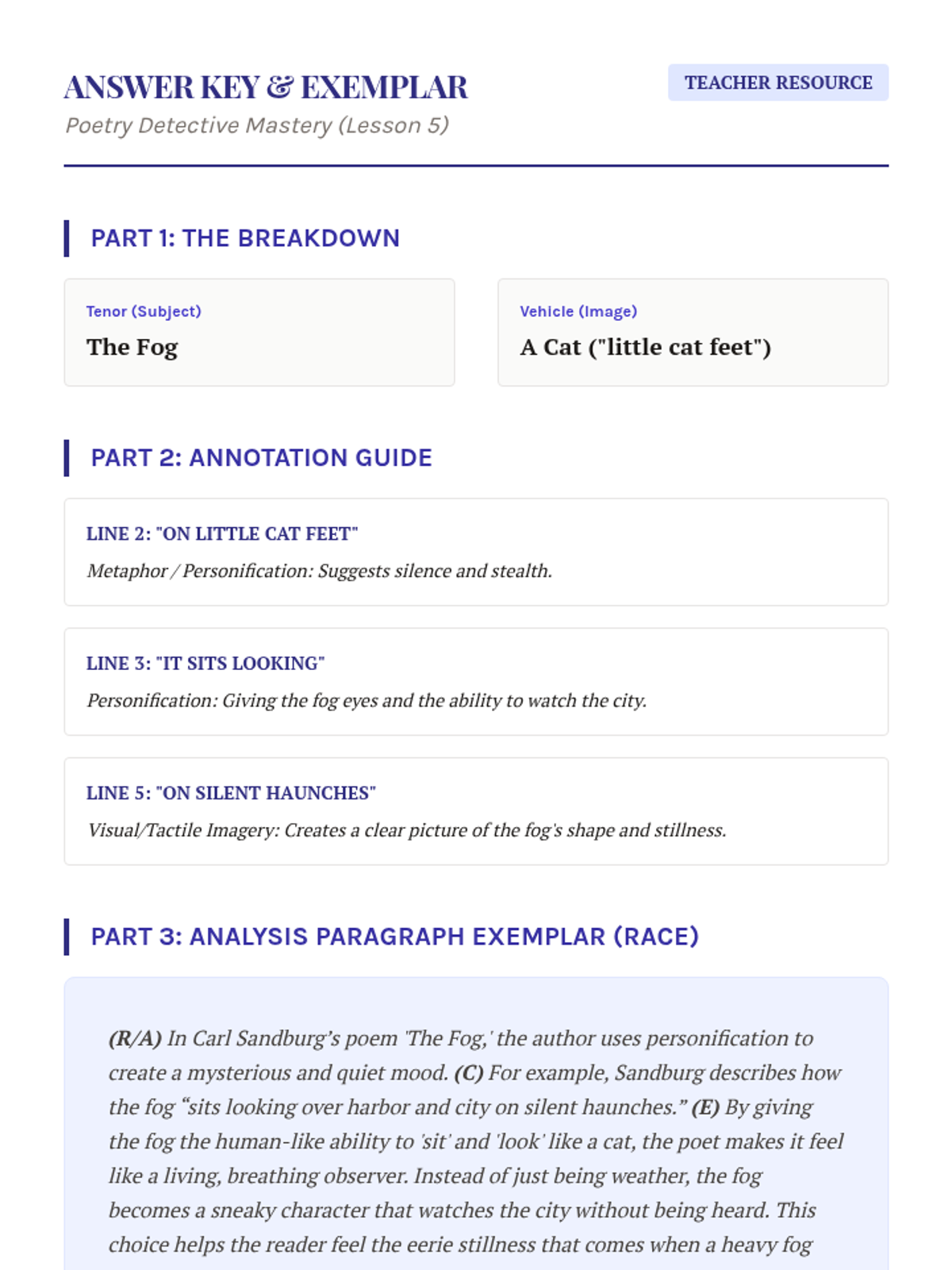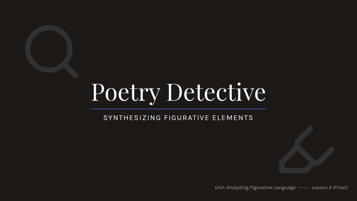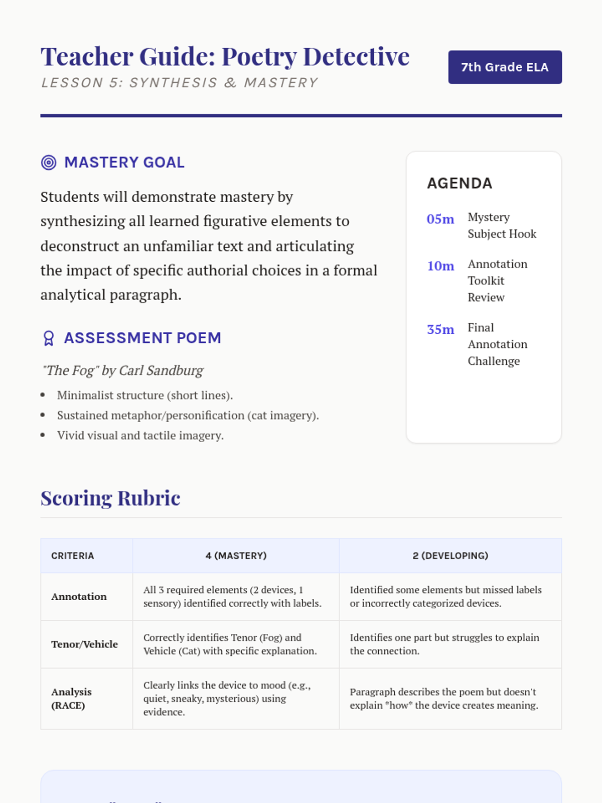 A 5-lesson unit for 7th-grade students focused on identifying, analyzing, and synthesizing figurative language and imagery in poetry. Students progress from basic comparisons (similes and metaphors) to complex extended metaphors, personification, hyperbole, and sensory imagery, culminating in a full-text analysis.