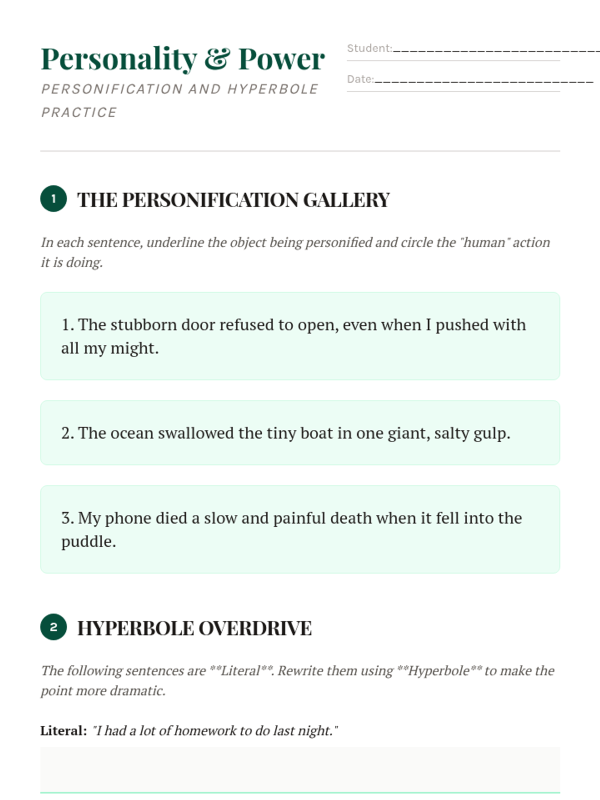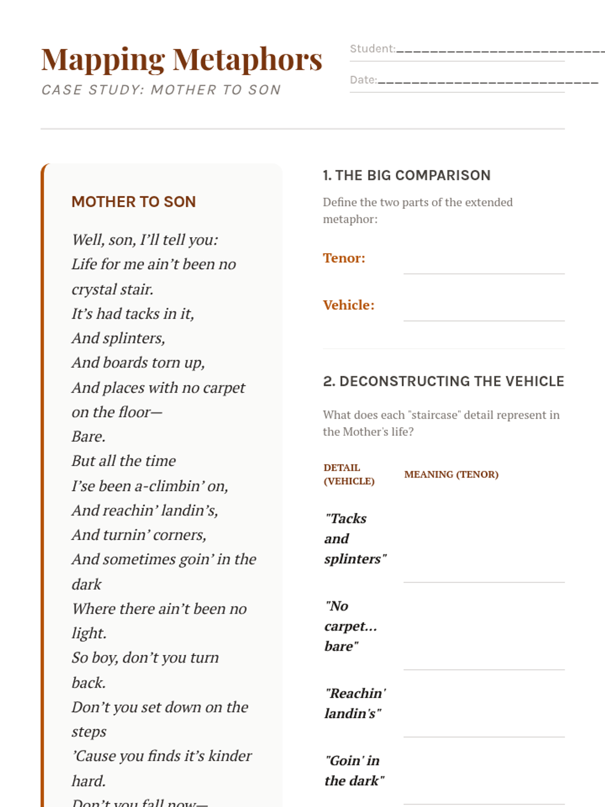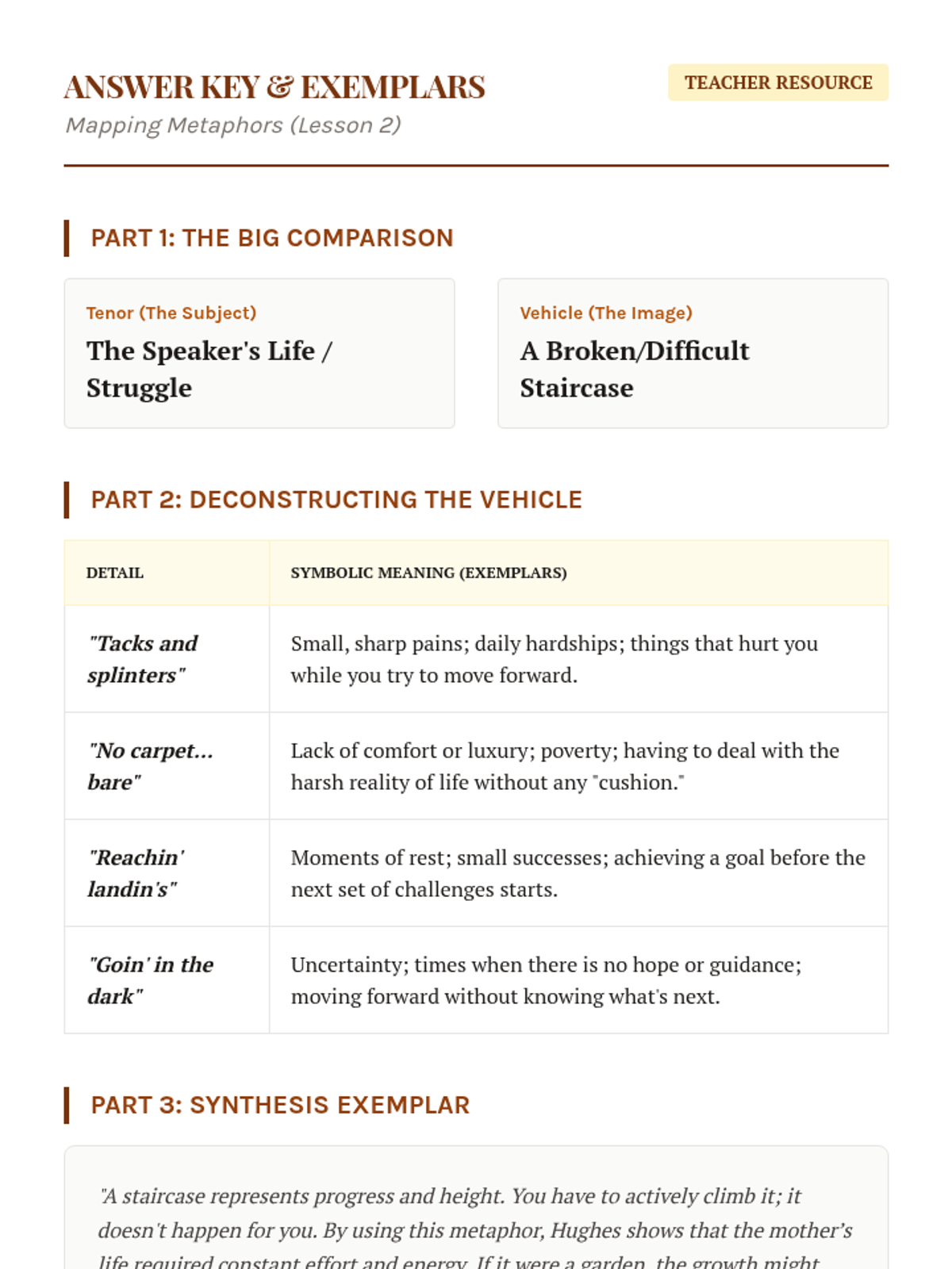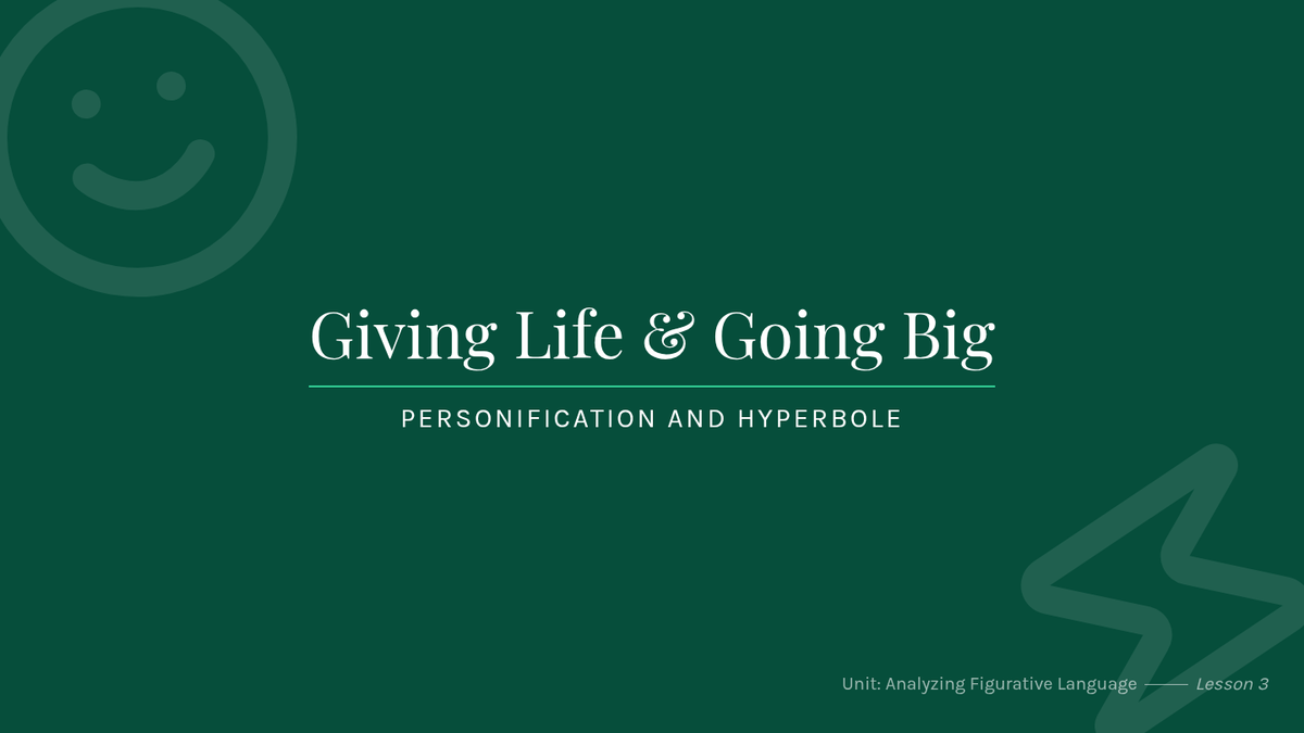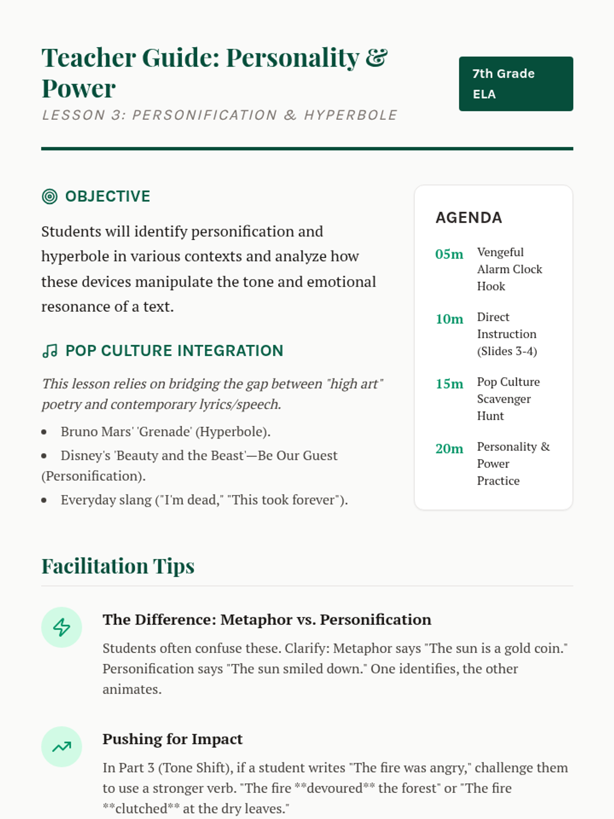 A 5-lesson unit for 7th-grade students focused on identifying, analyzing, and synthesizing figurative language and imagery in poetry. Students progress from basic comparisons (similes and metaphors) to complex extended metaphors, personification, hyperbole, and sensory imagery, culminating in a full-text analysis.
