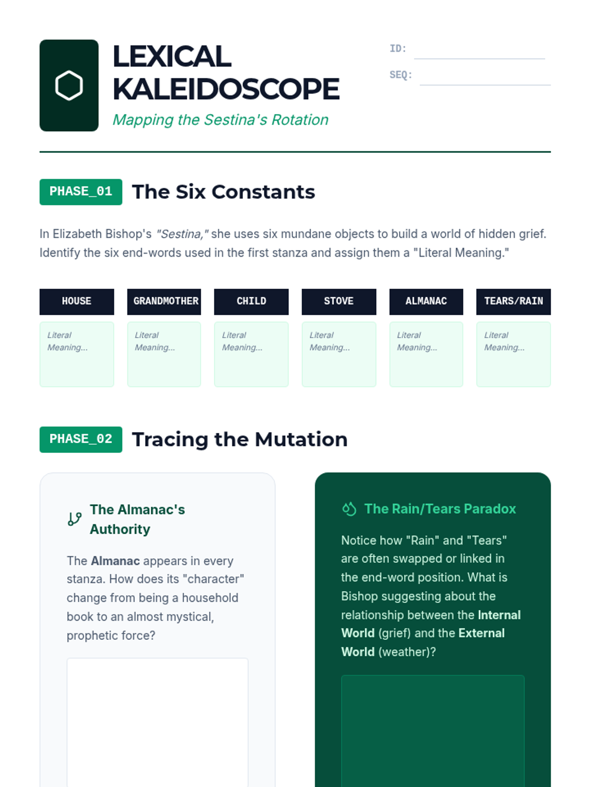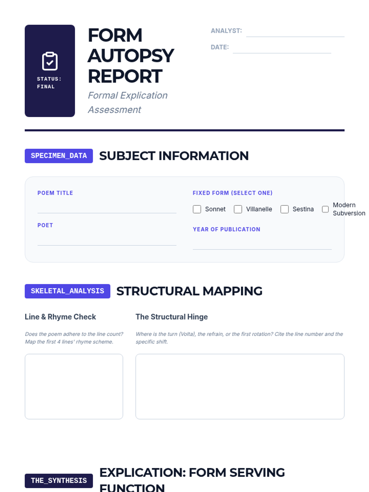 A deep dive into how rigid poetic forms—such as the sonnet, villanelle, and sestina—serve as architectural frameworks for complex emotional and logical arguments. Students analyze the tension between structural constraints and creative expansion in both classical and modern contexts.