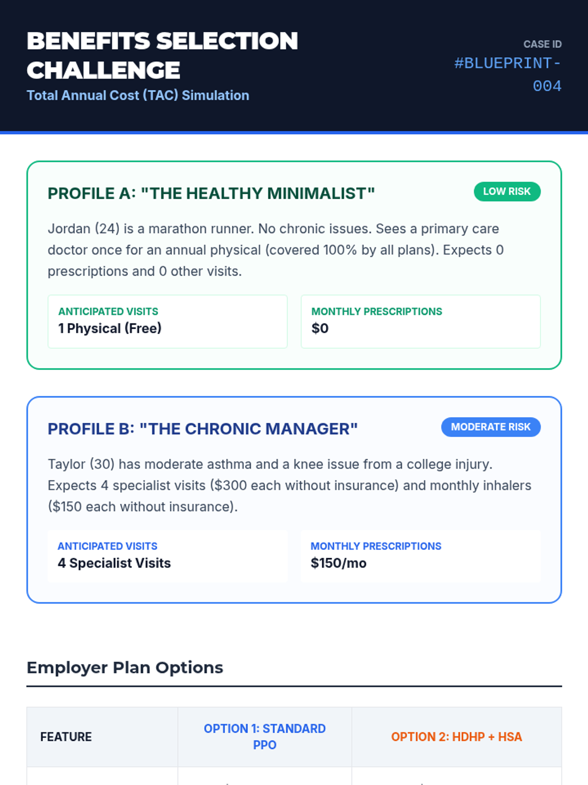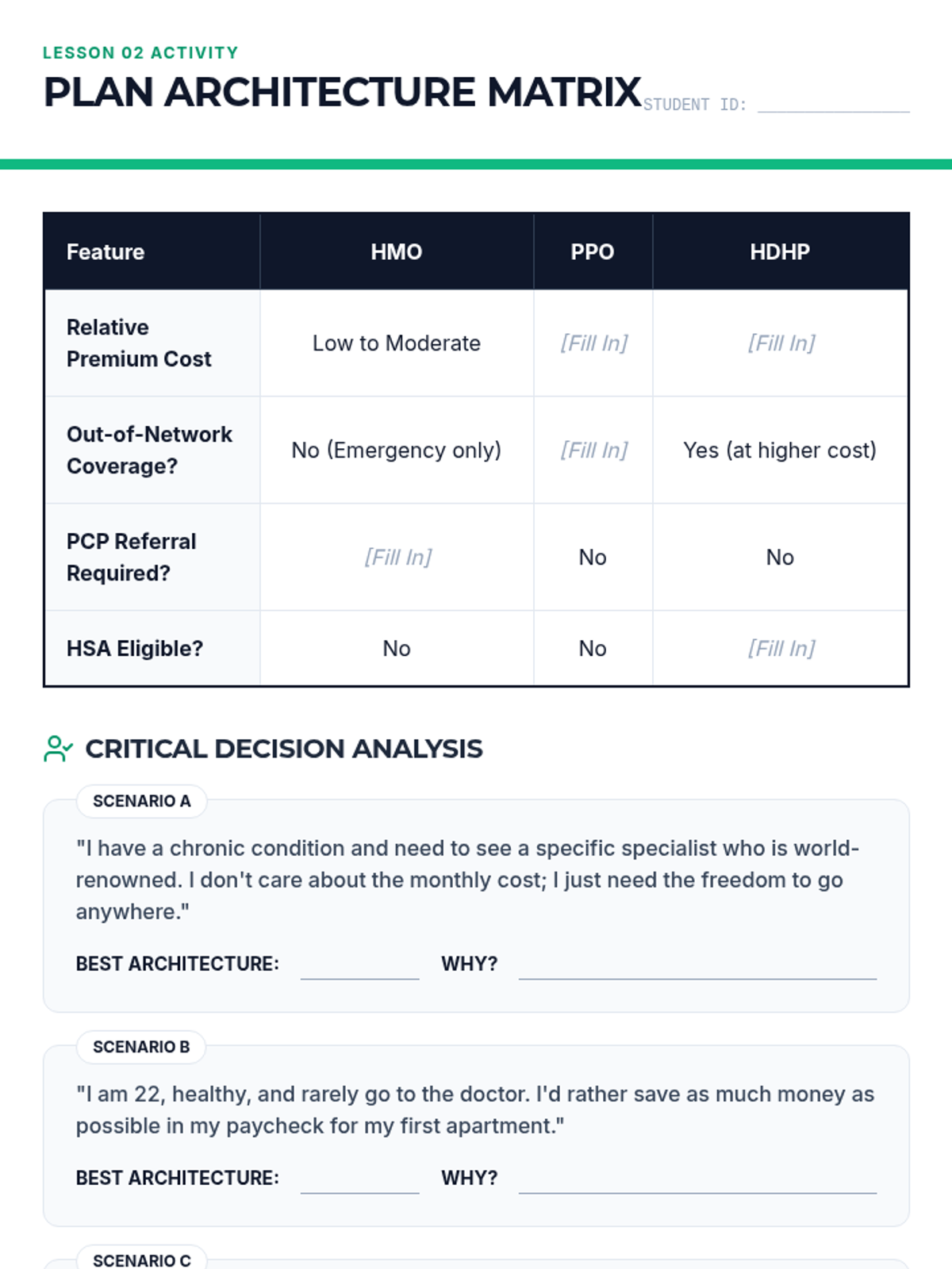 This sequence equips undergraduate students with the analytical tools to evaluate employer-sponsored health and wellness benefits. Students will move from basic terminology to complex scenario planning, choosing between HMOs, PPOs, and HDHPs, while also exploring tax-advantaged accounts like HSAs/FSAs and legal protections like FMLA.