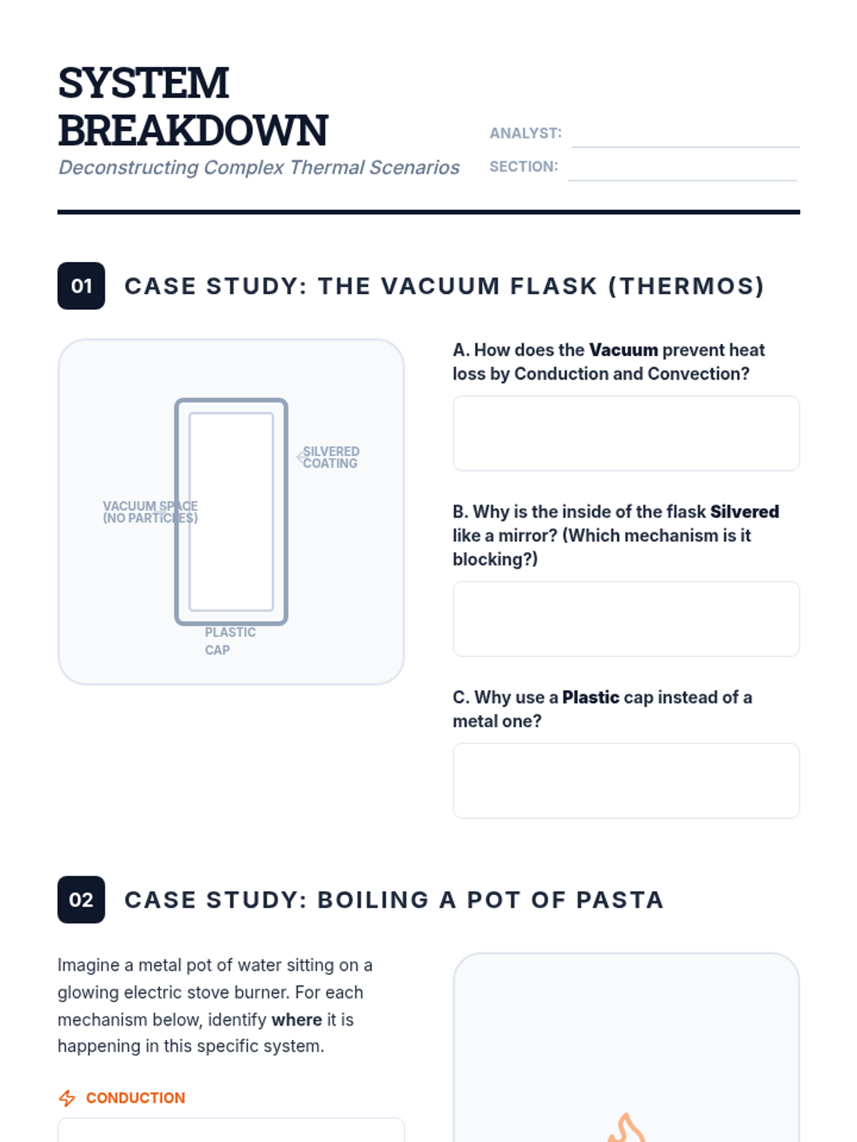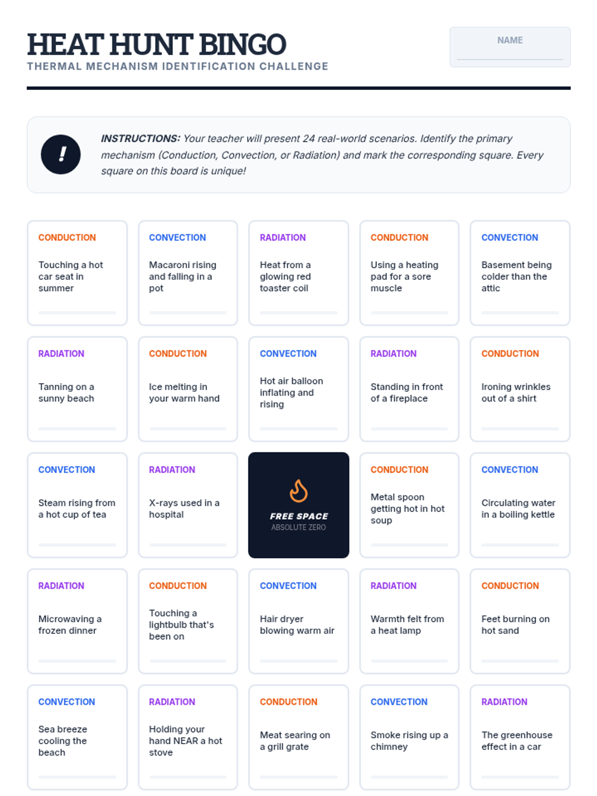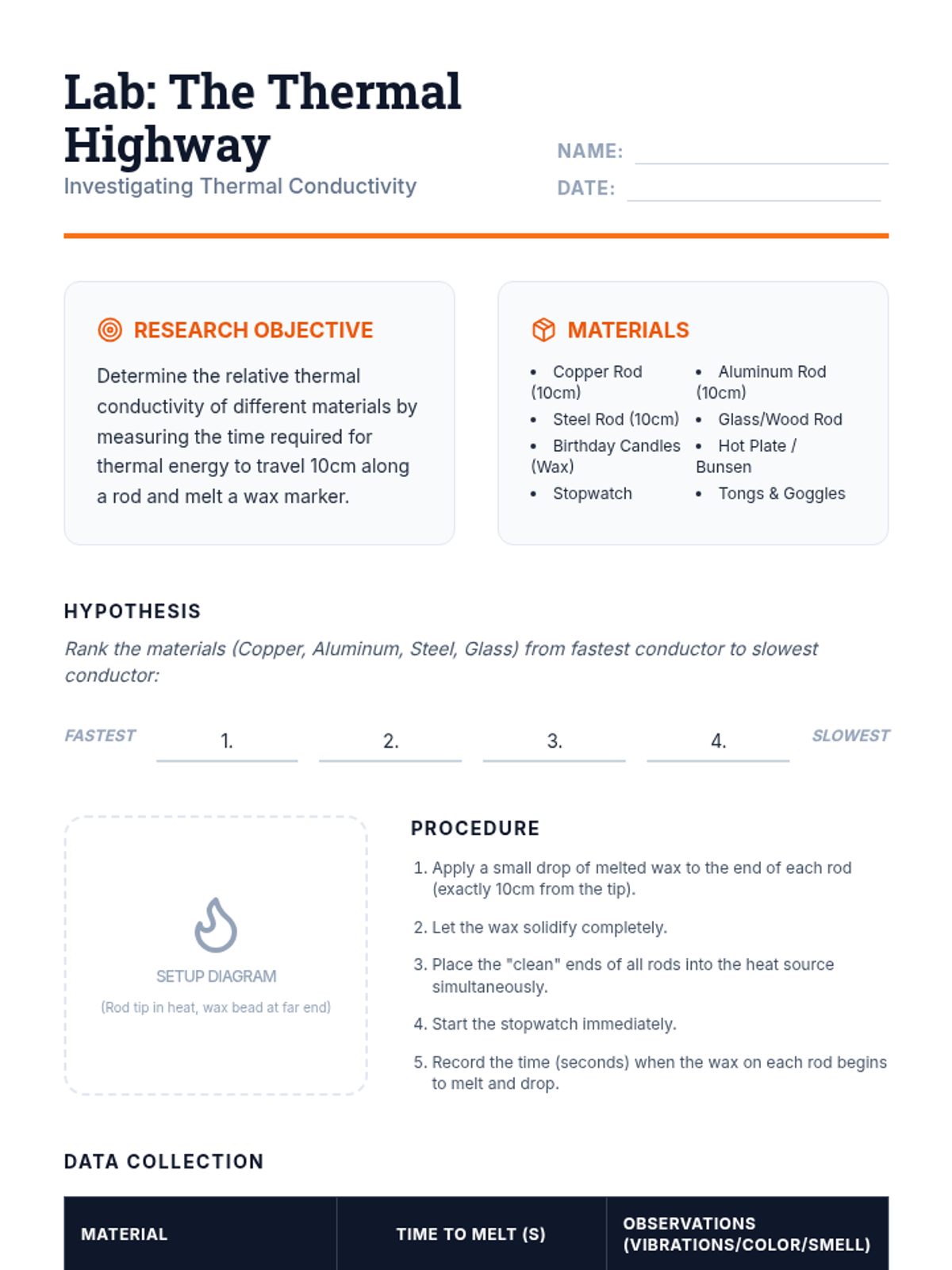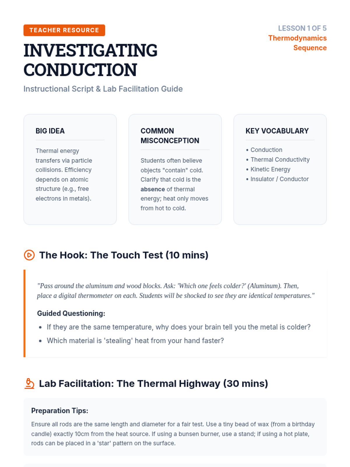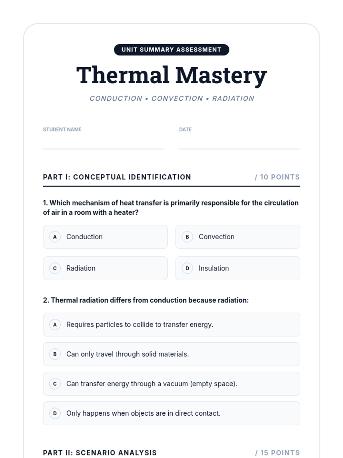 A comprehensive 9th-grade physics sequence exploring conduction, convection, and radiation through hands-on labs, simulations, and real-world system analysis. Students move from isolating individual mechanisms to identifying their combined effects in Earth's systems and engineering.