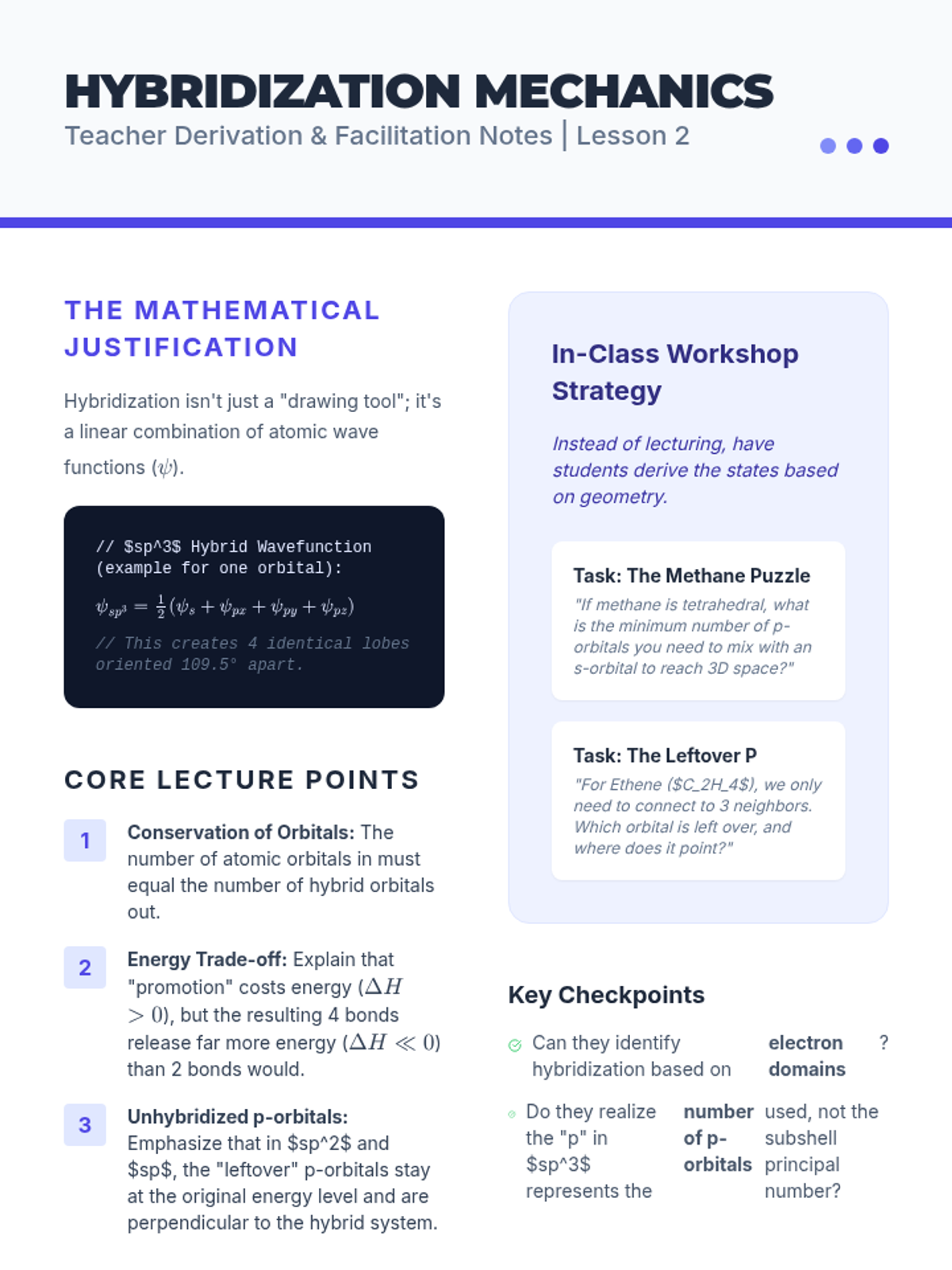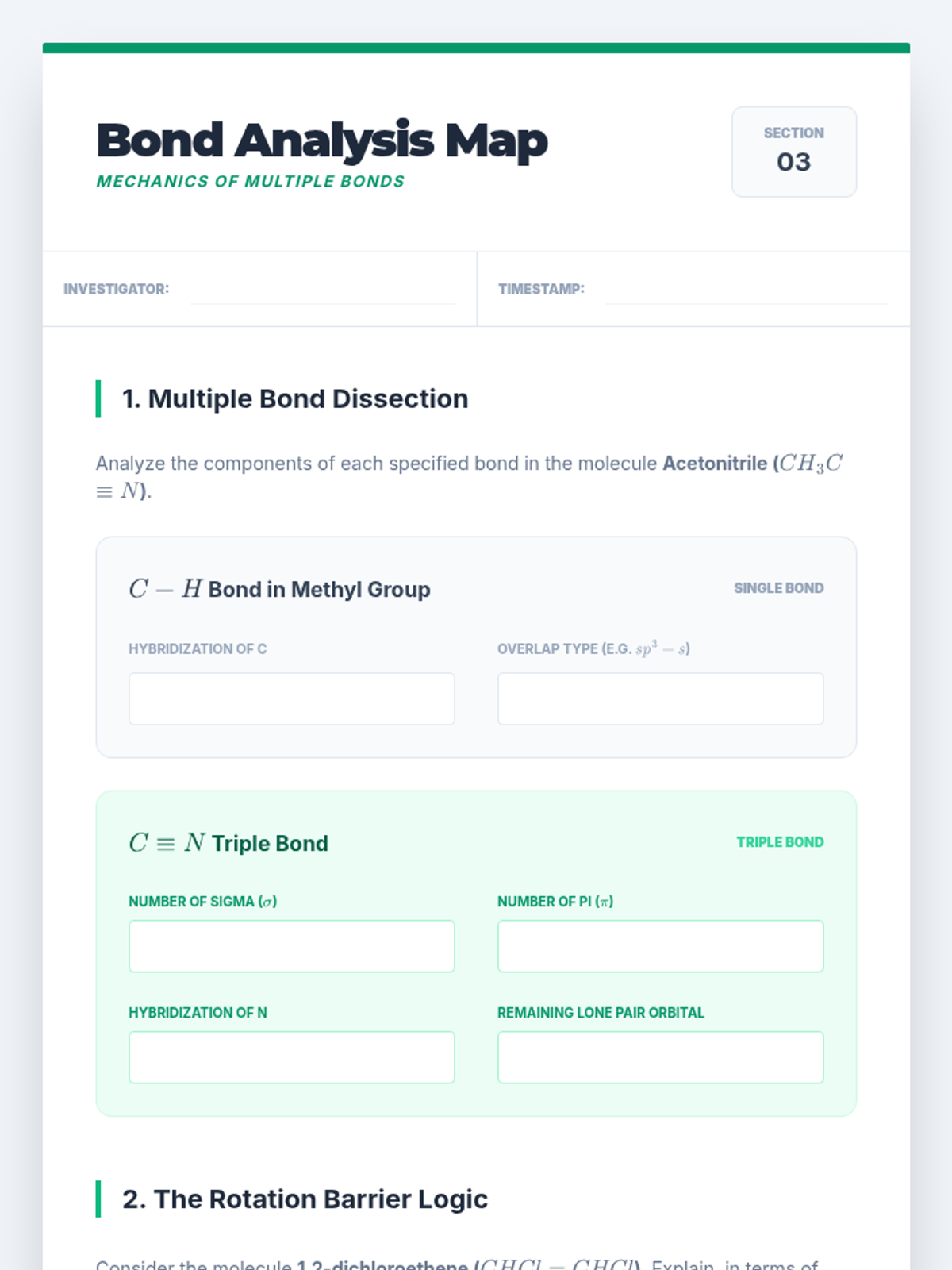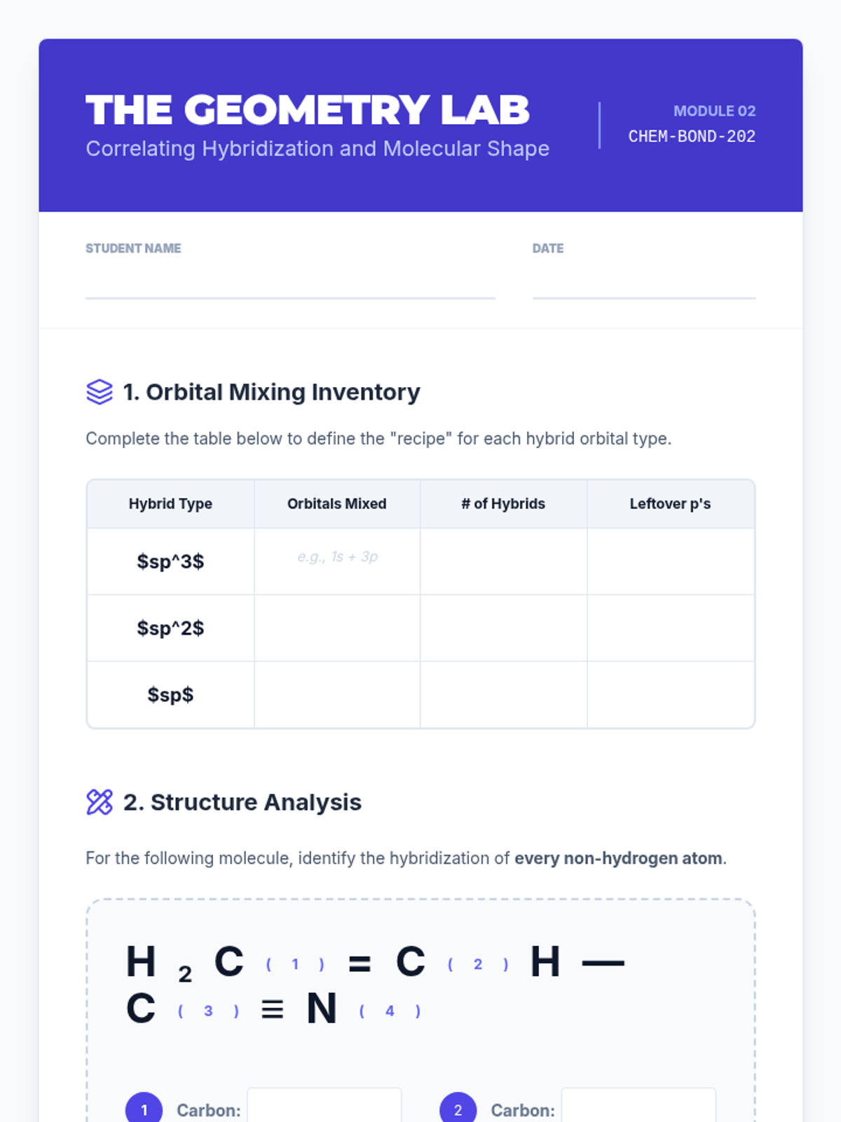 An undergraduate chemistry sequence exploring the transition from Lewis theory to Valence Bond Theory, focusing on orbital hybridization, sigma and pi bonding, and the limitations of these models. Students will analyze molecular geometries, bond rotation, and delocalized systems.