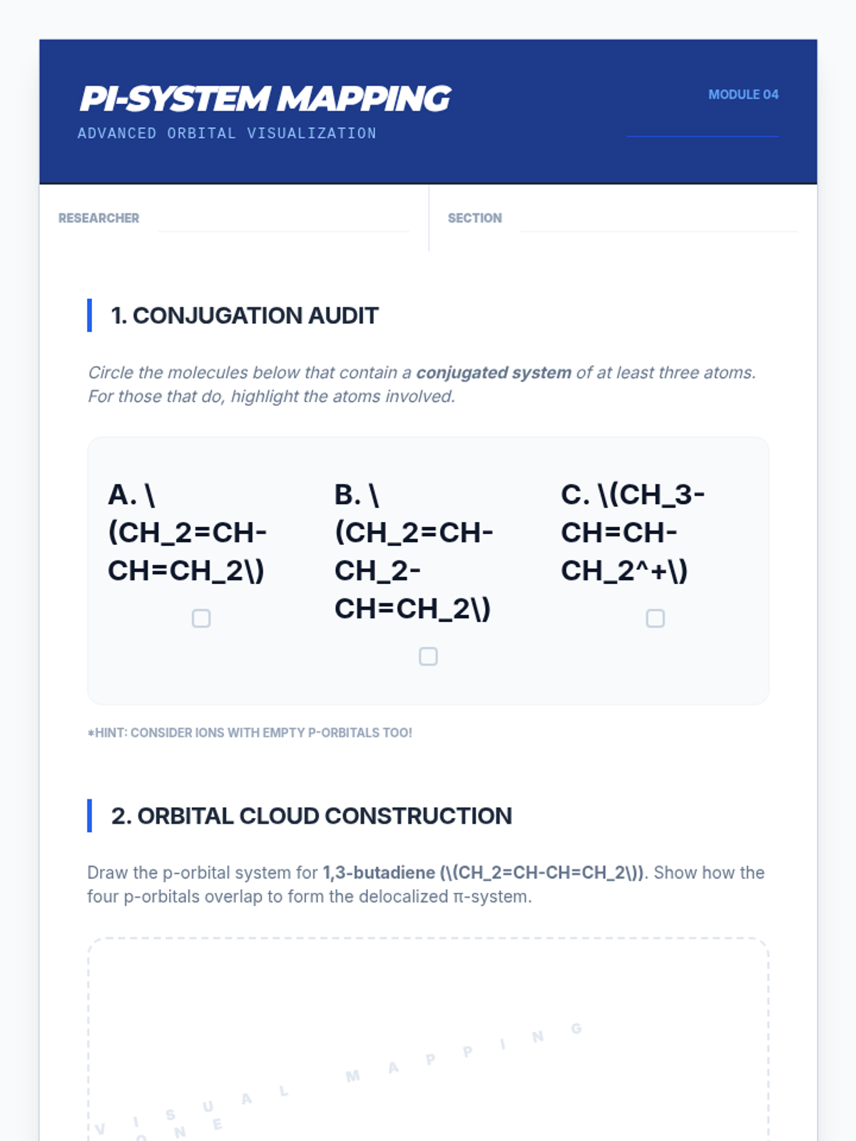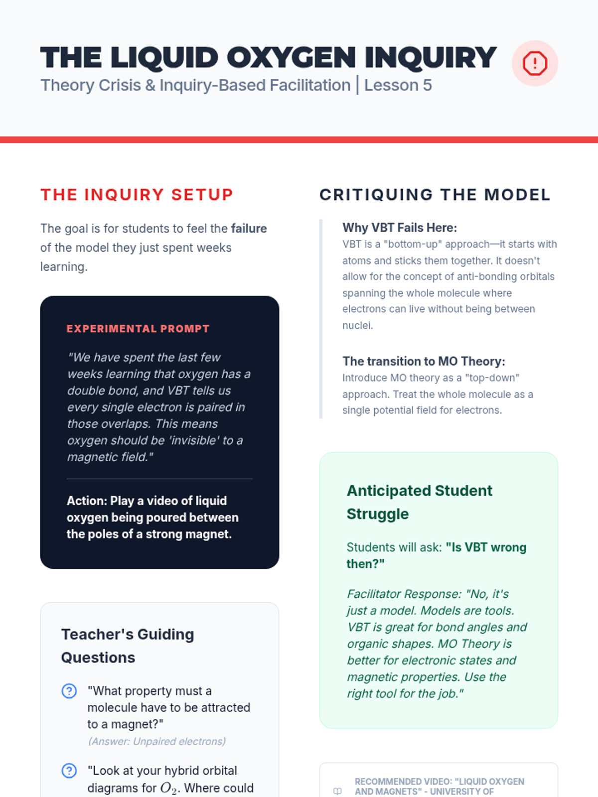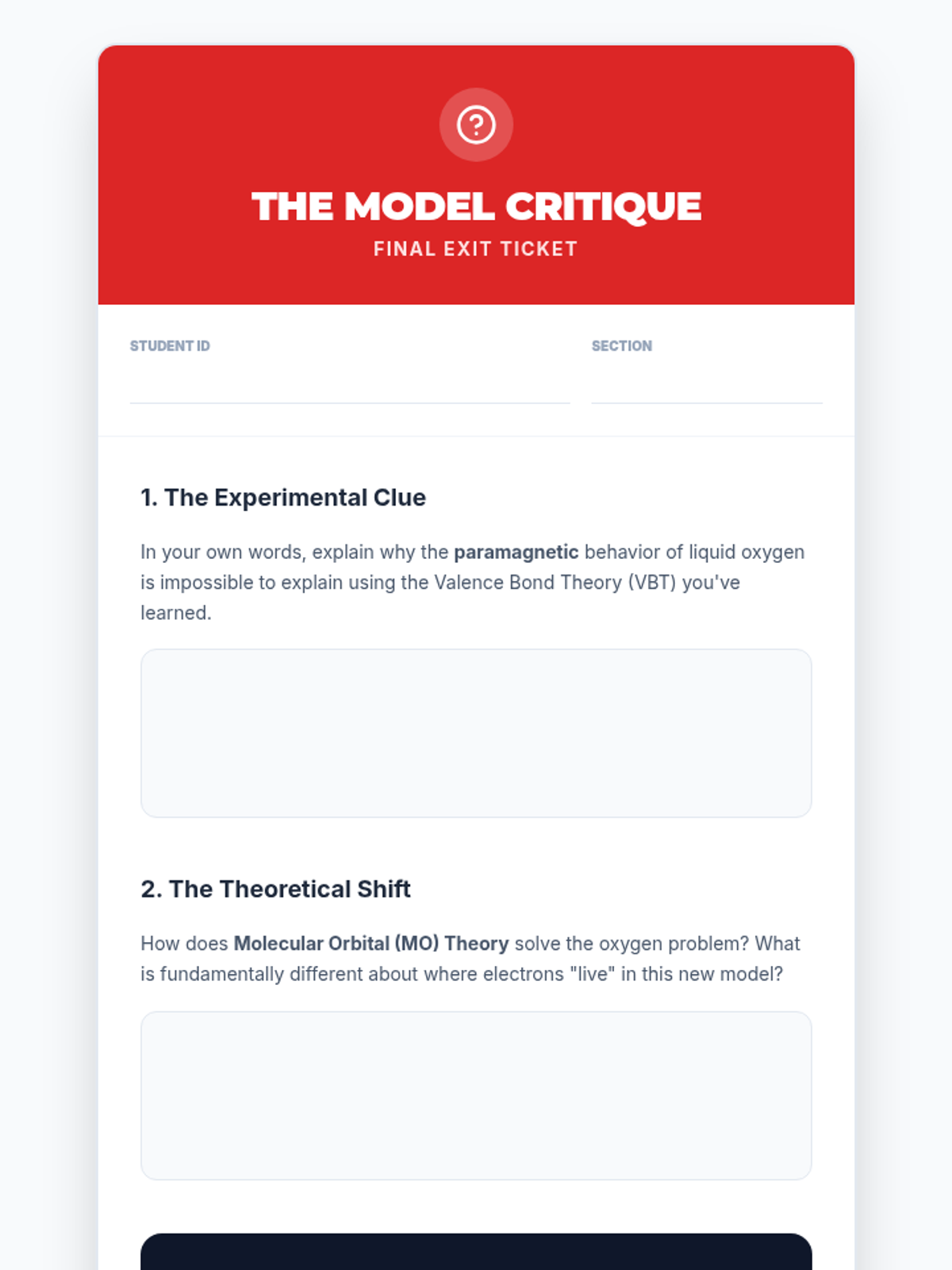 An undergraduate chemistry sequence exploring the transition from Lewis theory to Valence Bond Theory, focusing on orbital hybridization, sigma and pi bonding, and the limitations of these models. Students will analyze molecular geometries, bond rotation, and delocalized systems.