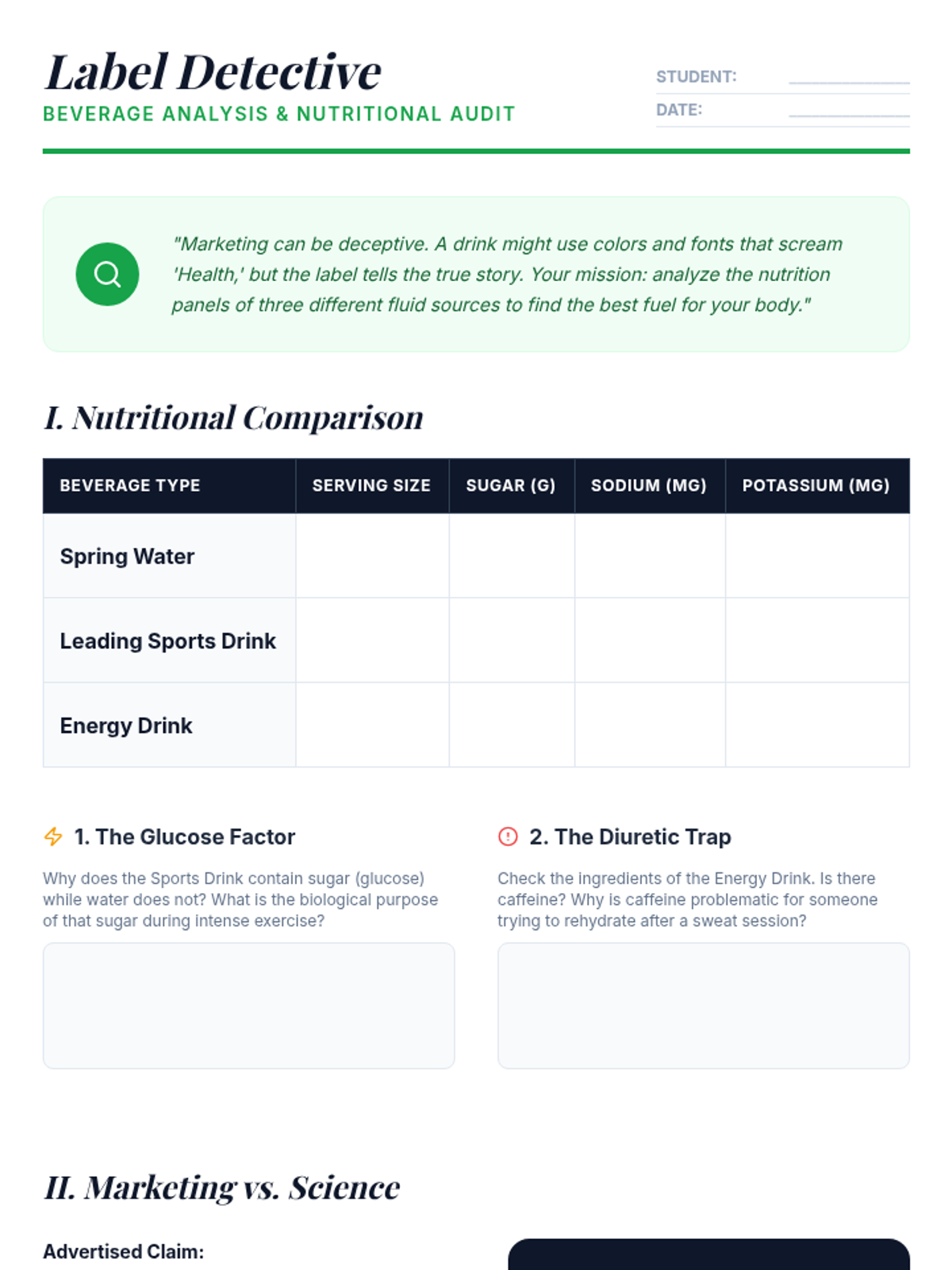 A 2-day condensed unit for 10th-grade sports nutrition focused on identifying industry "Red Flags" and expert consensus for supplement safety. Students complete a digital Label Hunt and a final synthesis assessment to demonstrate mastery.