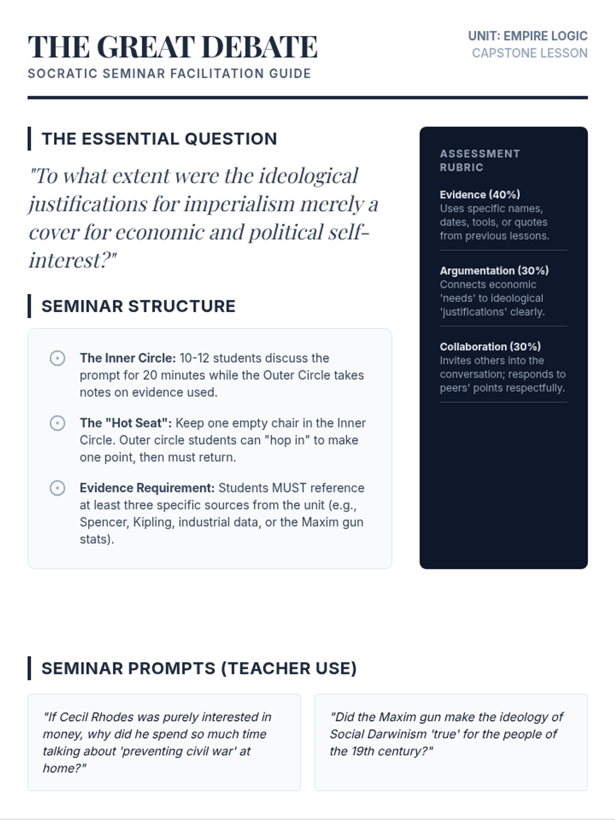 An in-depth 11th-grade history unit exploring the economic and ideological drivers of 19th-century imperialism. Students analyze the intersection of industrial capitalism, Social Darwinism, and technological advancement through primary sources and data.