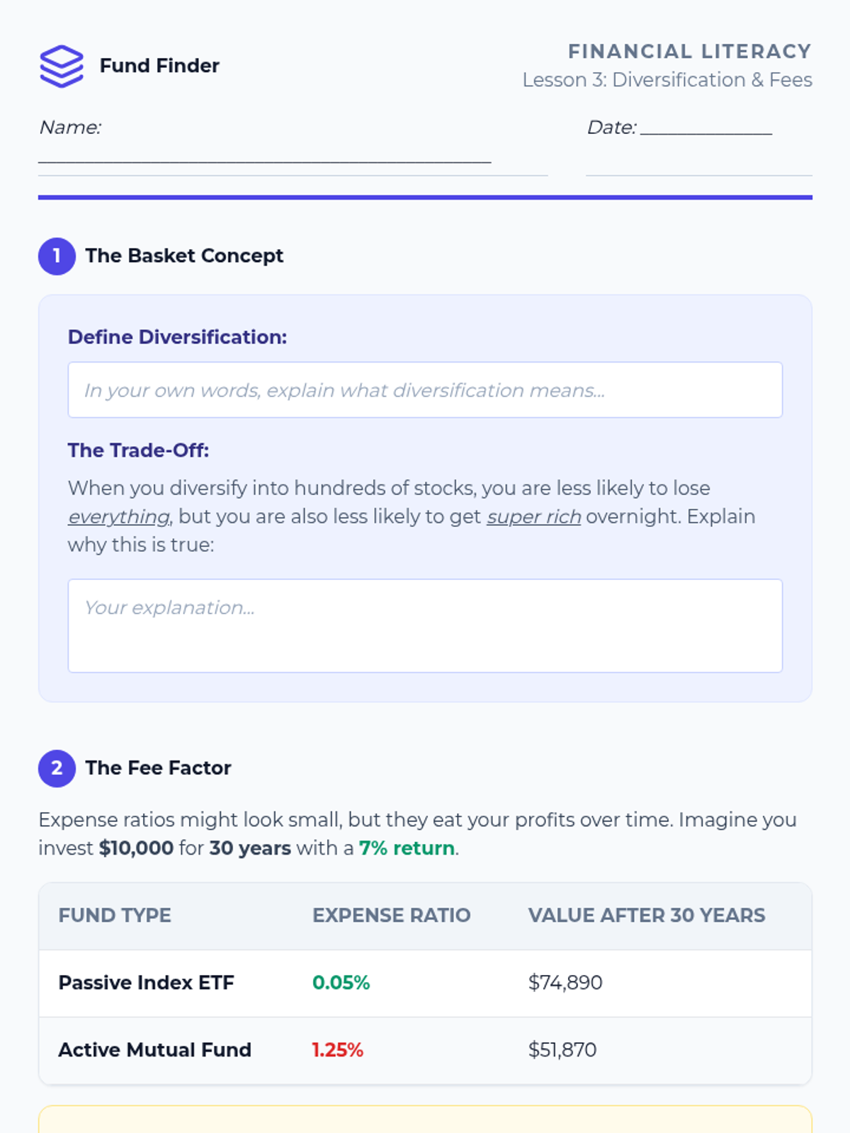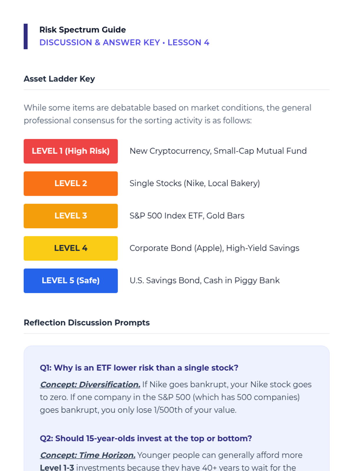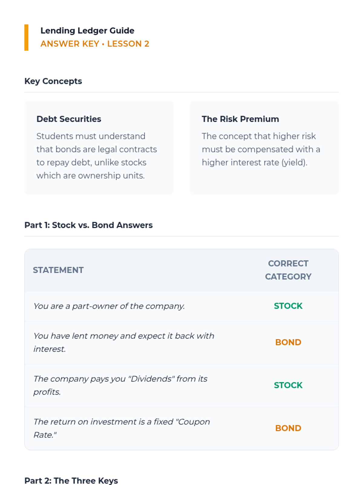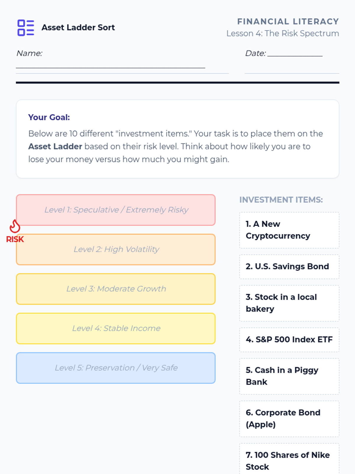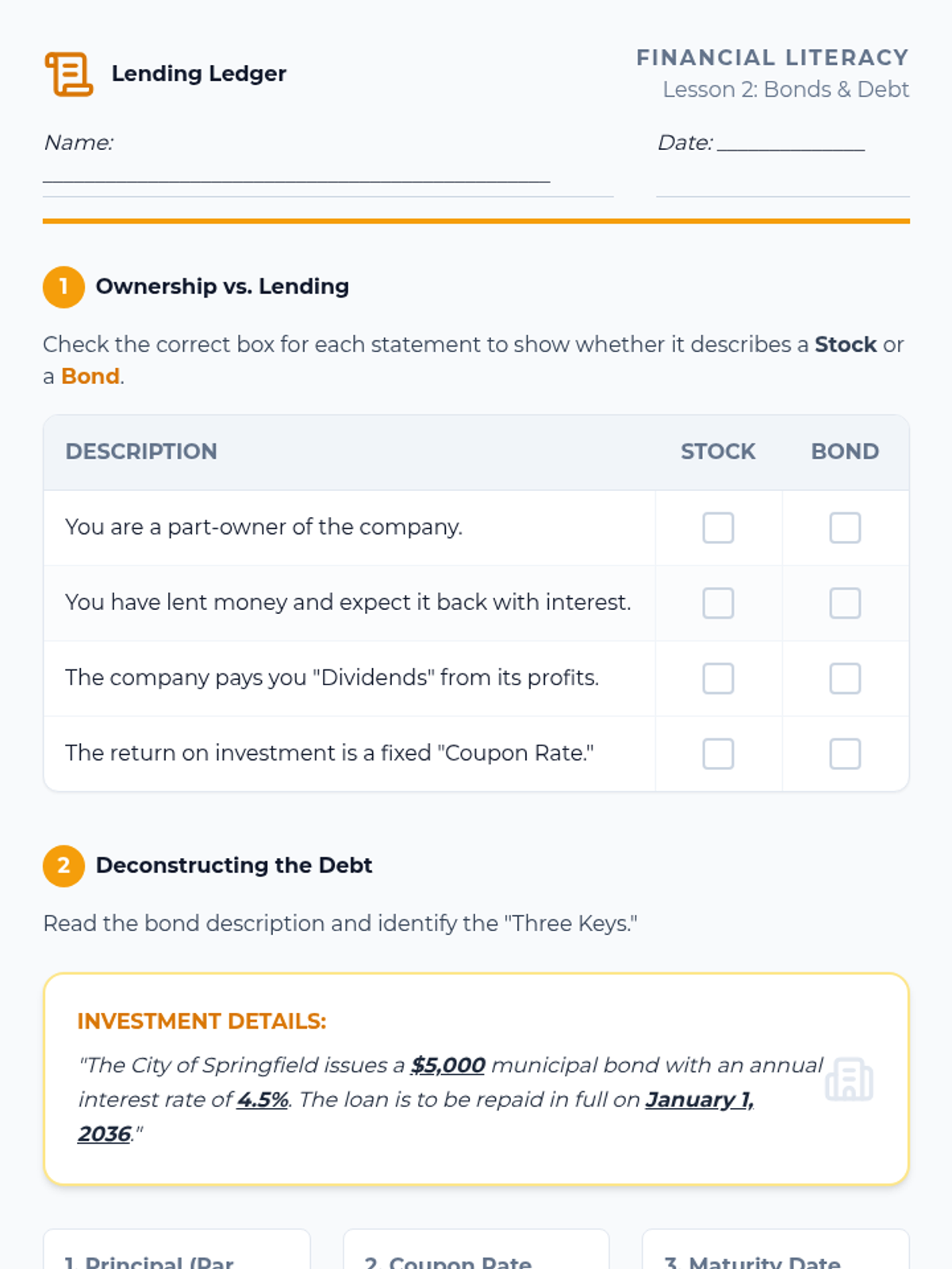 This sequence introduces 9th-grade students to the world of investing. It moves from individual ownership (stocks) to lending (bonds), then into diversification (mutual funds/ETFs), culminating in risk assessment and practical research skills for analyzing financial documents.