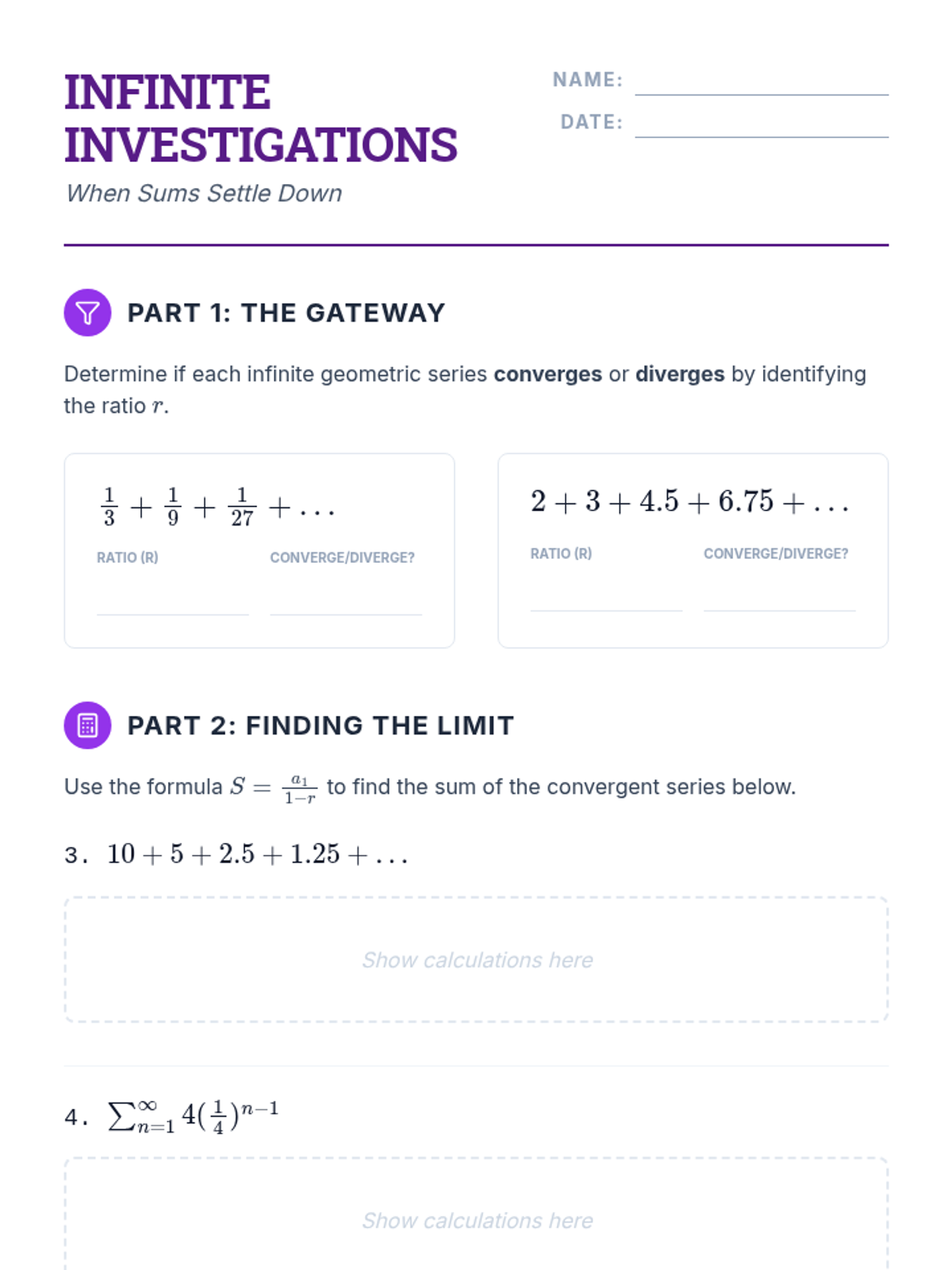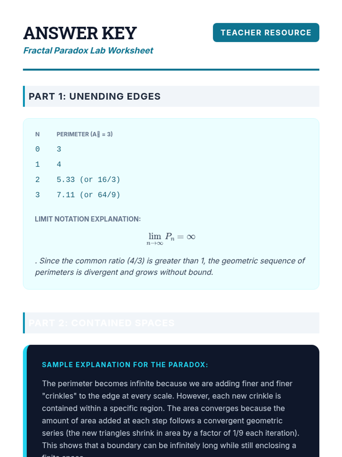 This sequence introduces 11th-grade students to the behavior of sequences and series as they approach infinity. Students explore convergence, divergence, summation notation, and the paradoxes of infinite geometric series and fractals.