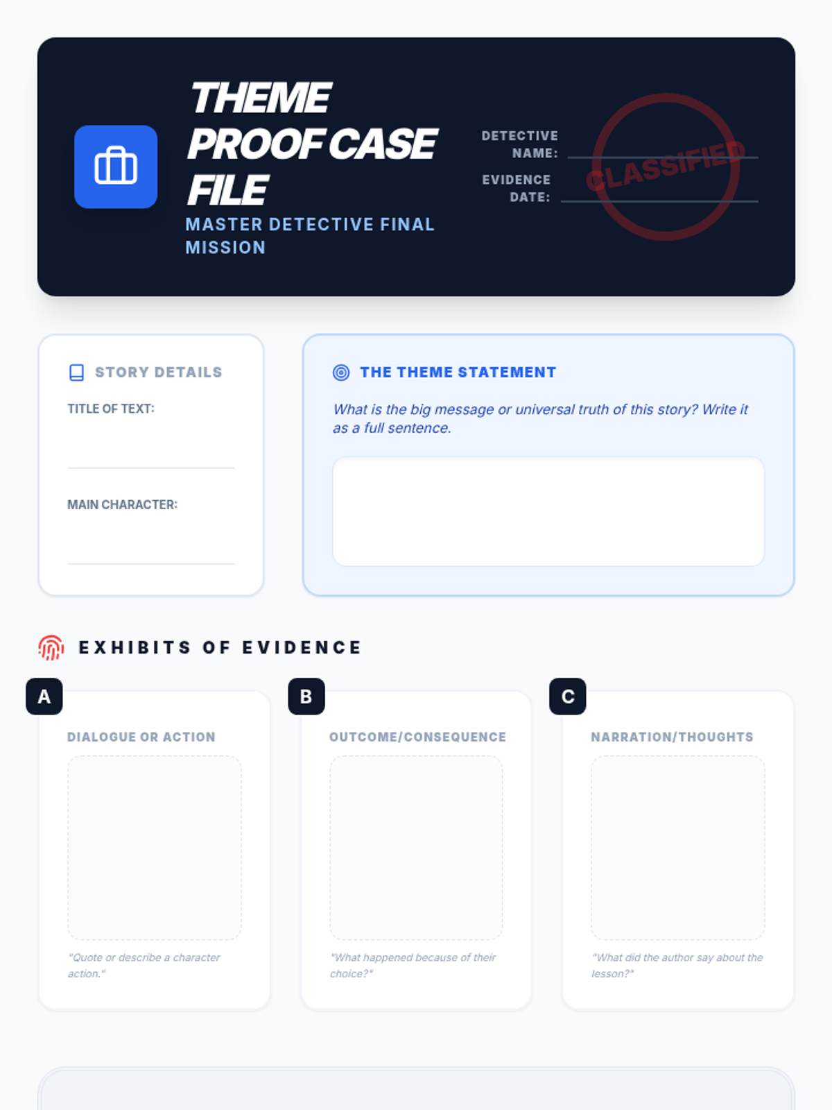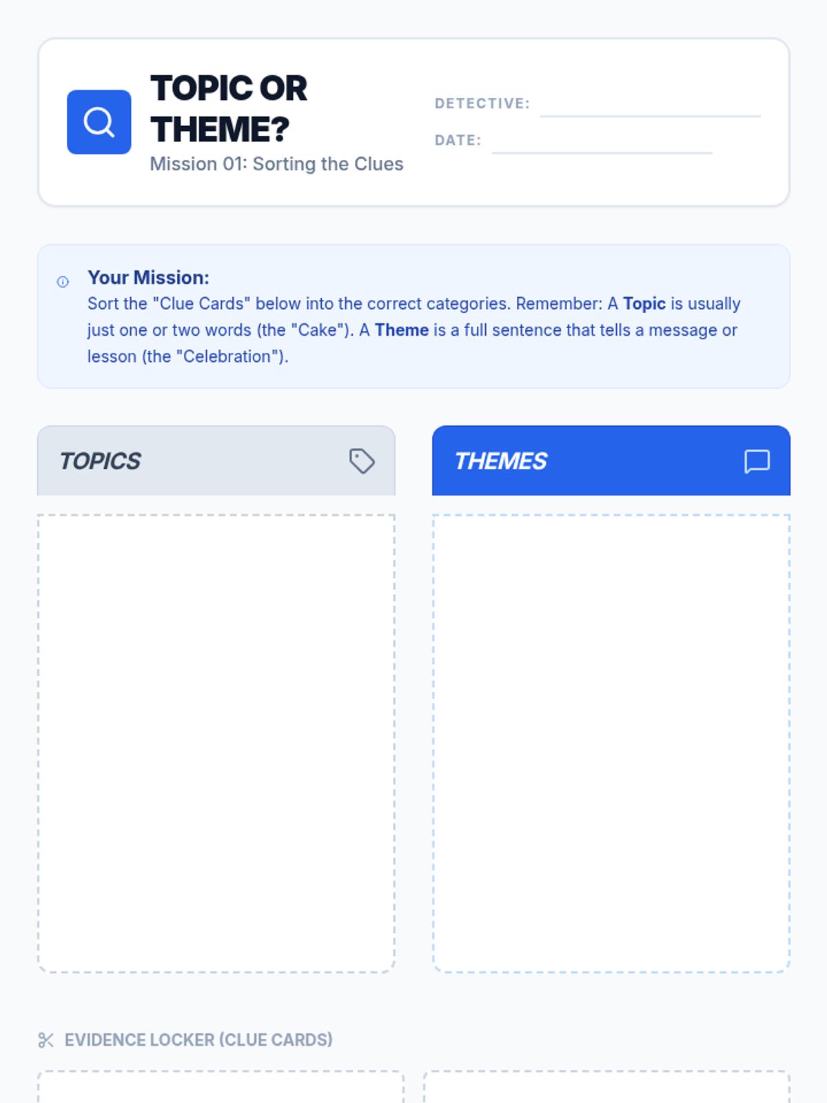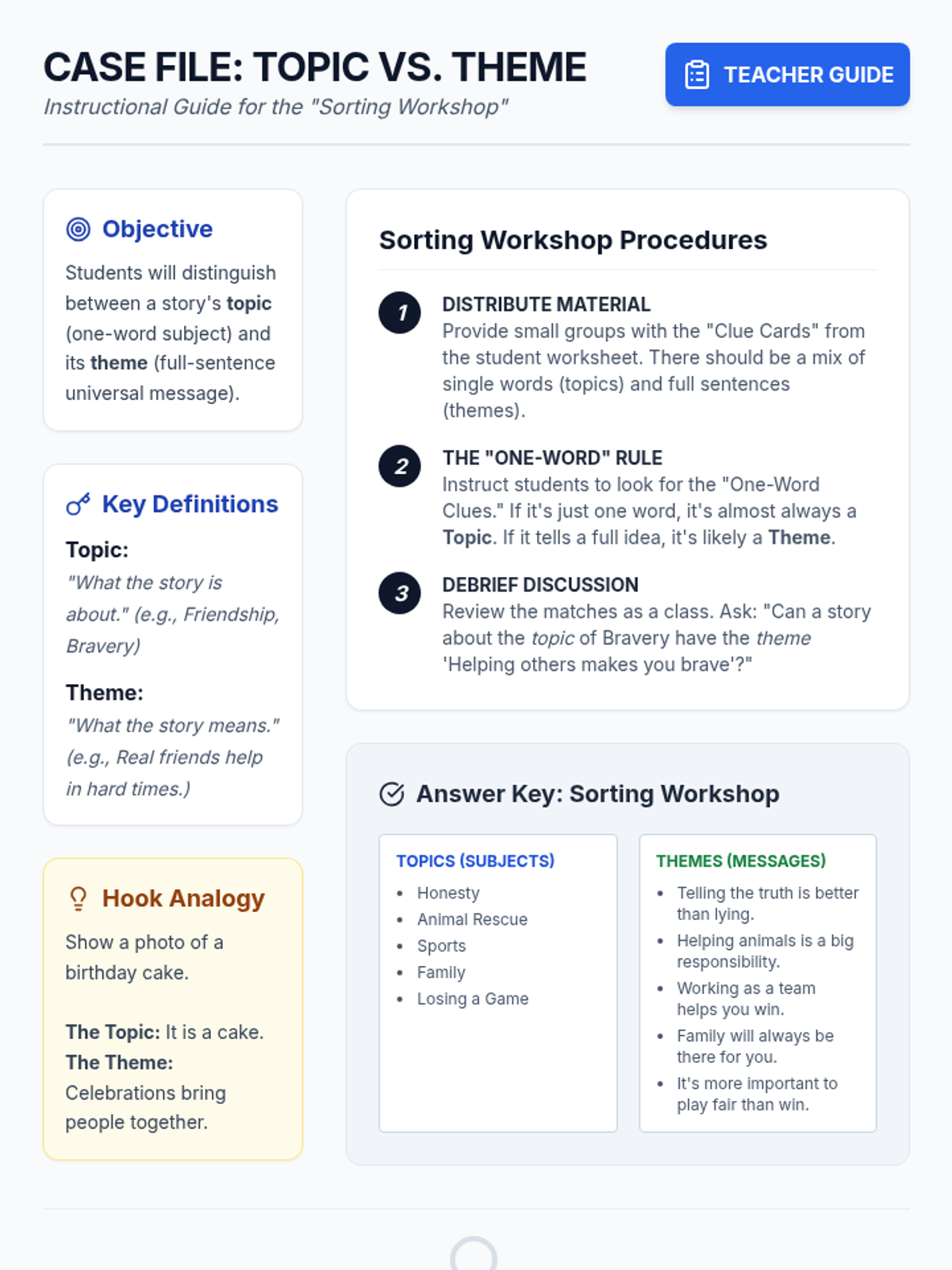 A comprehensive unit for 3rd-grade students that shifts focus from plot summaries to abstract conceptual thinking. Students learn to distinguish between topics and themes, analyze character actions in fables and fiction, compare themes across cultures, and support their interpretations with text evidence.