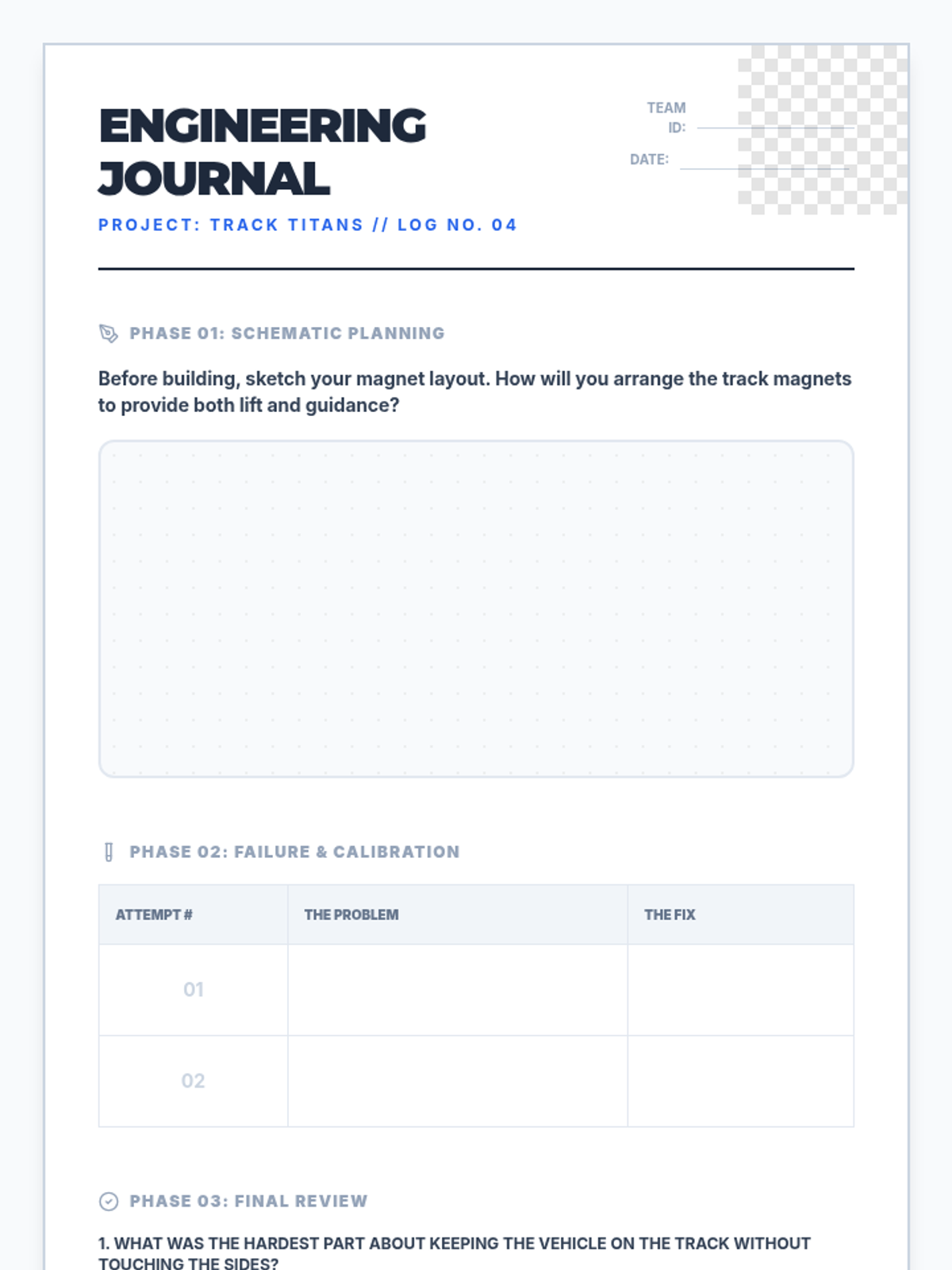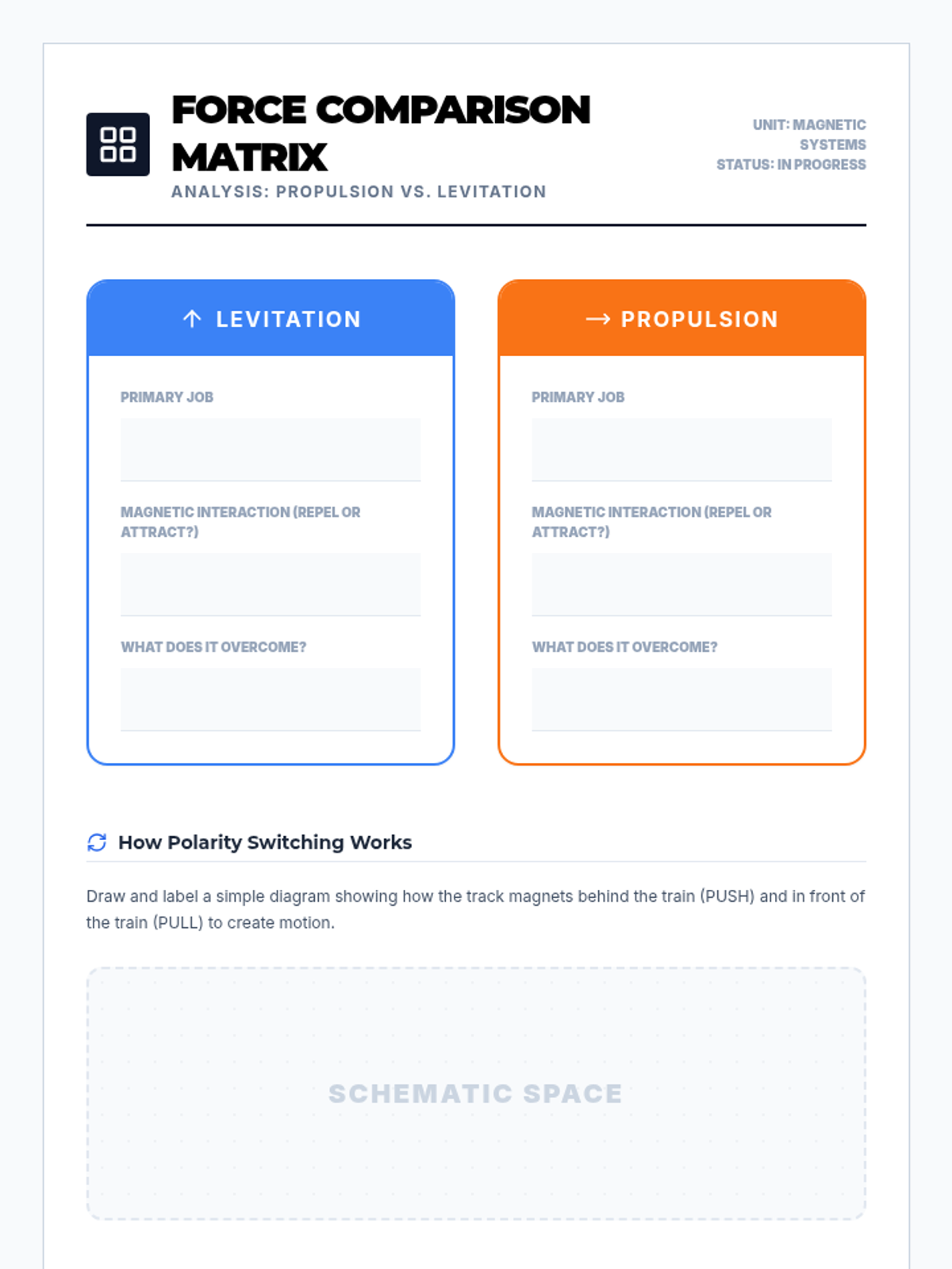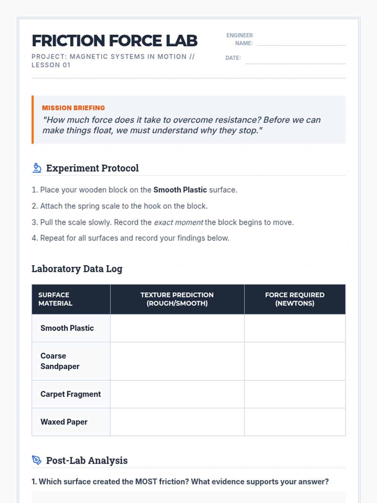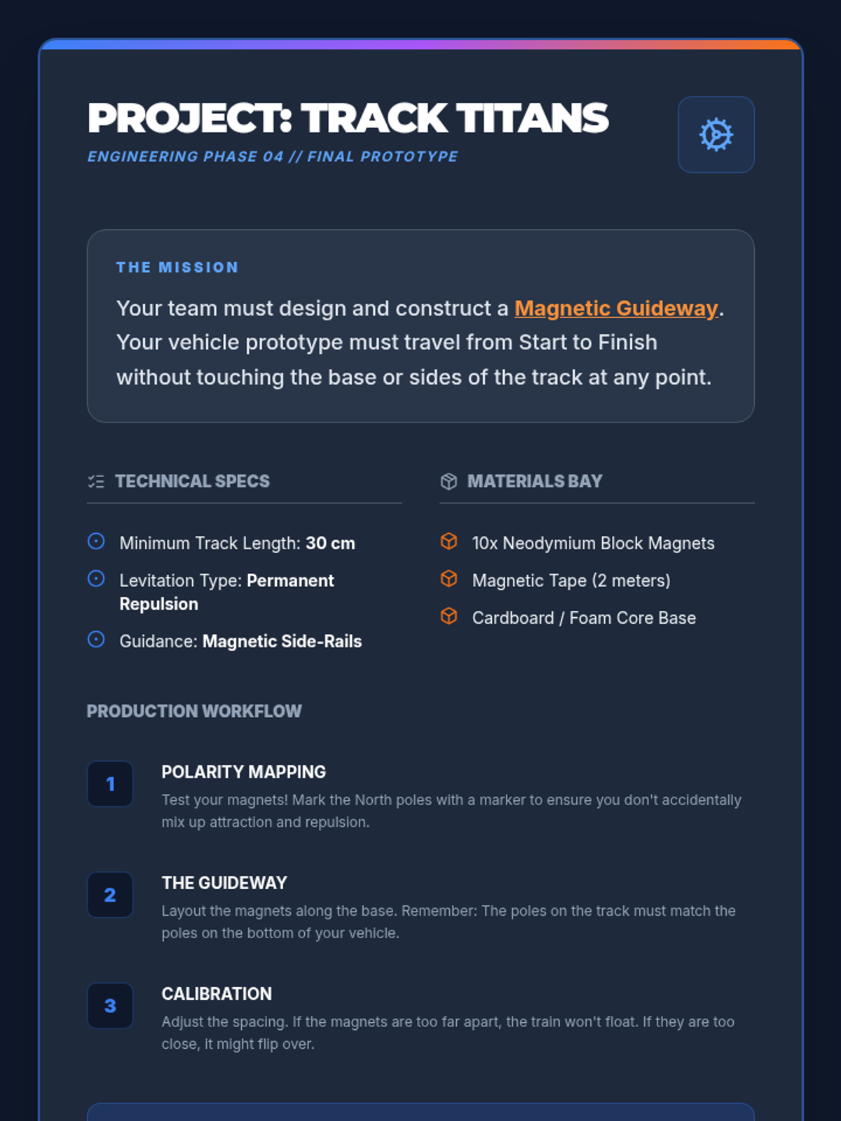A 5th-grade physics sequence exploring the mechanics of Magnetic Levitation (Maglev) trains. Students investigate friction, magnetic repulsion, and propulsion to understand how engineering can overcome physical resistance in modern transportation.