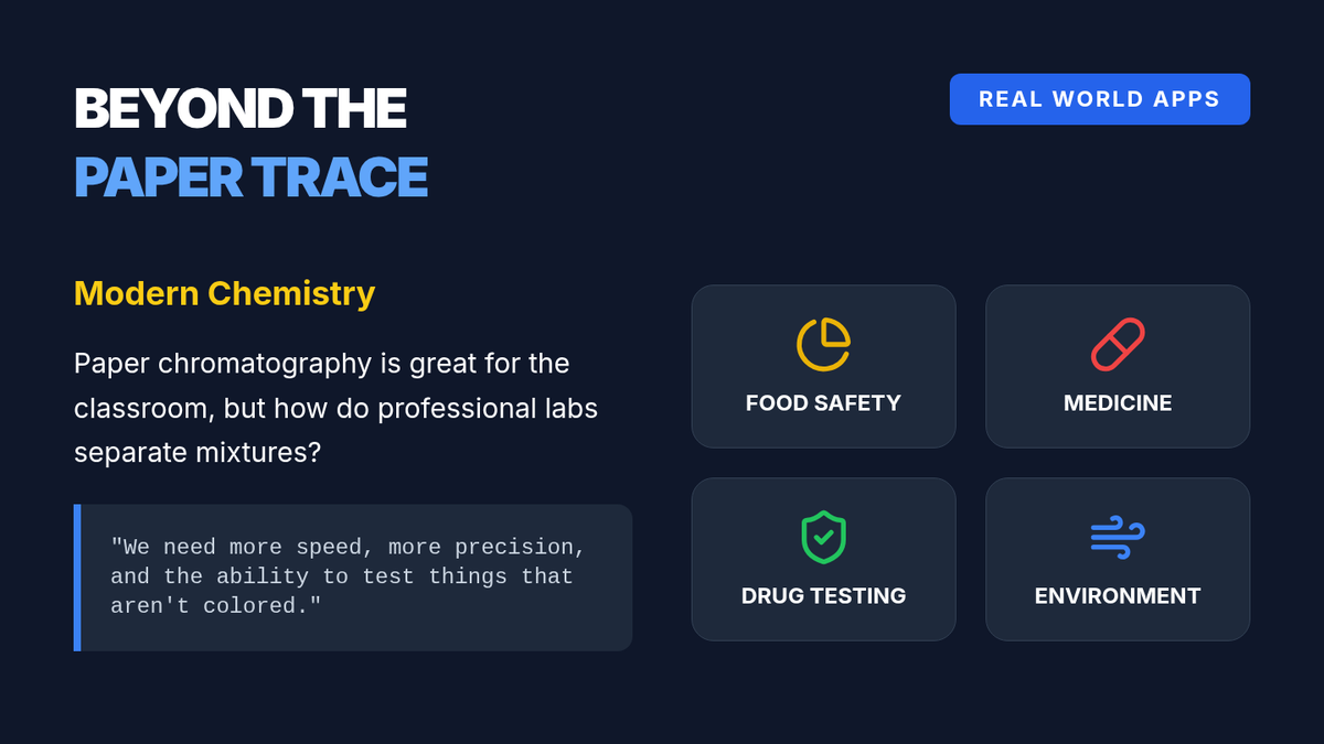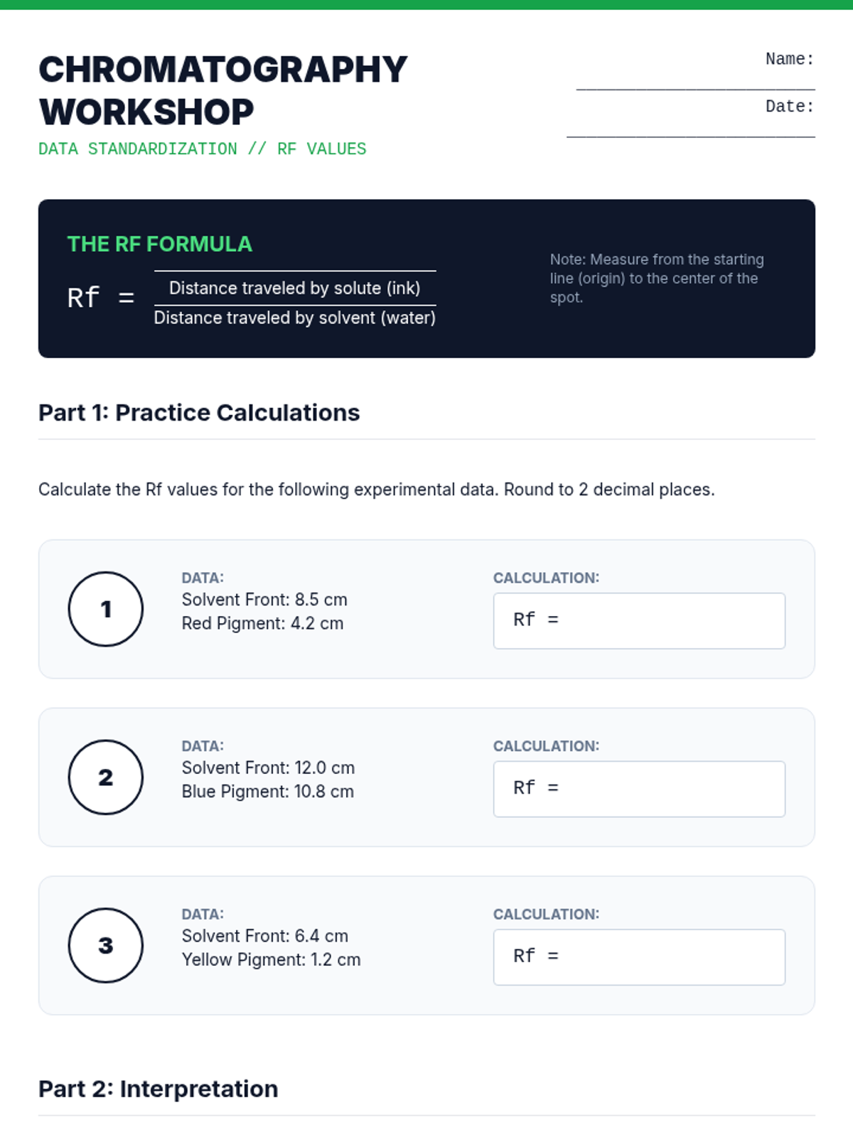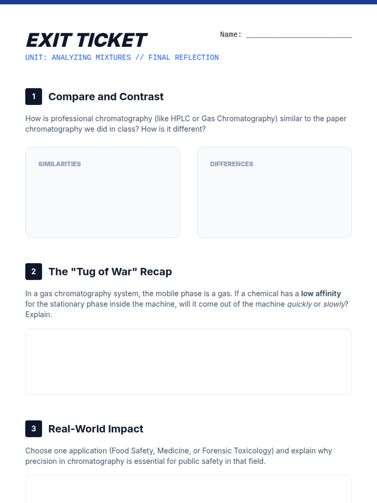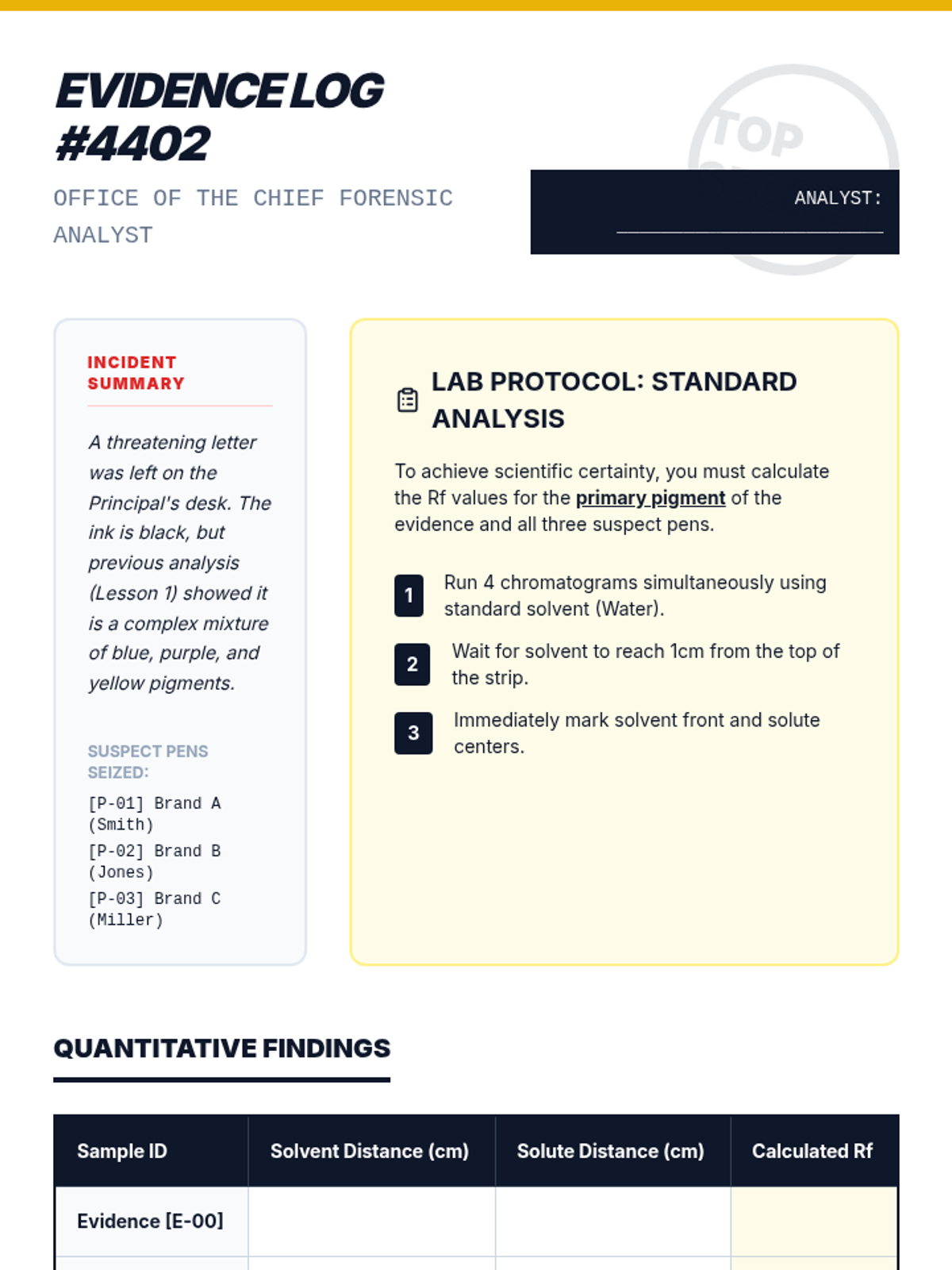 A 9th-grade physics sequence where students act as forensic technicians, using chromatography to separate mixtures, calculate Retention Factor (Rf) values, and solve a forensic mystery. Students explore solubility, polarity, and real-world applications of chemical separation techniques.