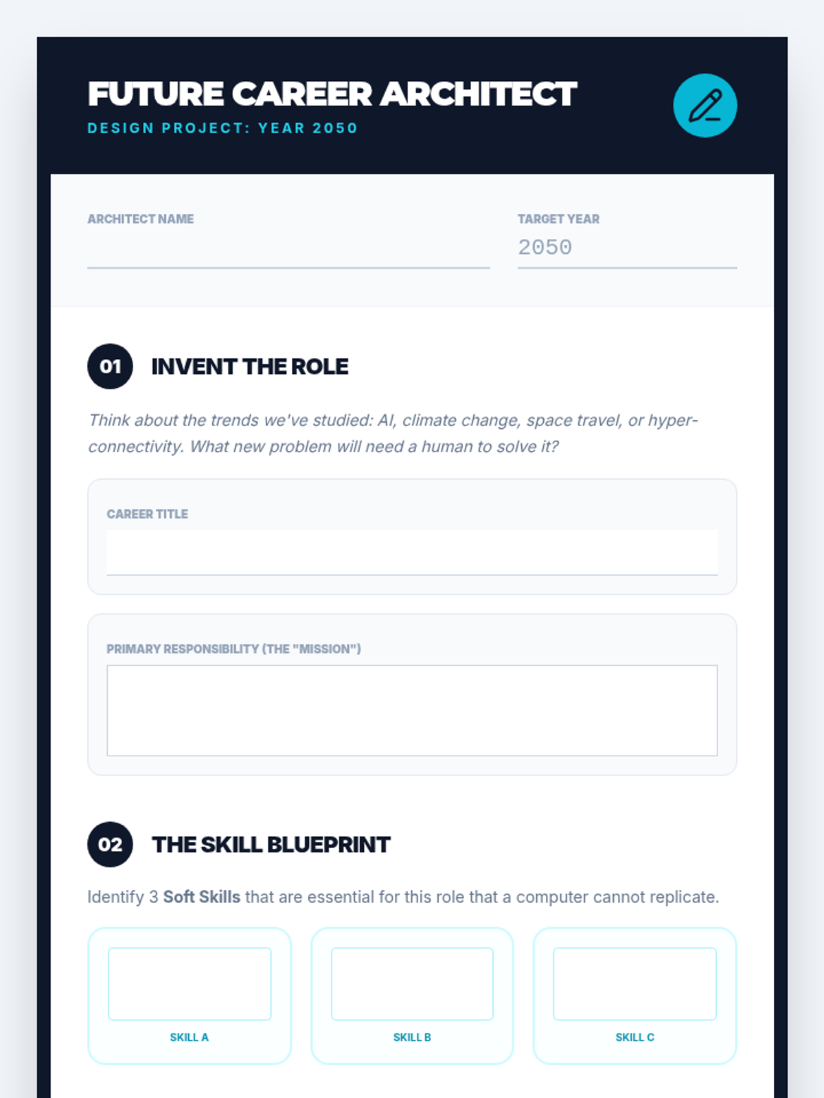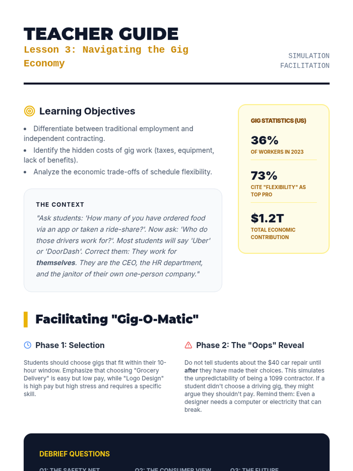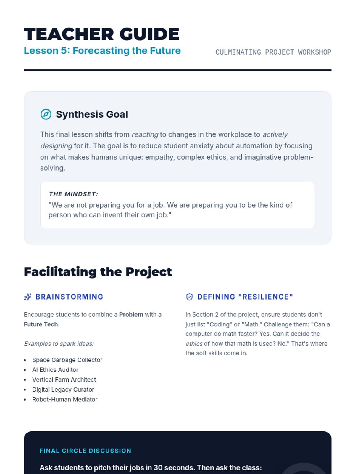 This sequence guides 8th-grade students through the evolution of the workplace, from historical industrial shifts to modern disruptors like AI, automation, and the gig economy. Students analyze data, participate in simulations, and forecast future skills needed for a globalized, digital workforce.