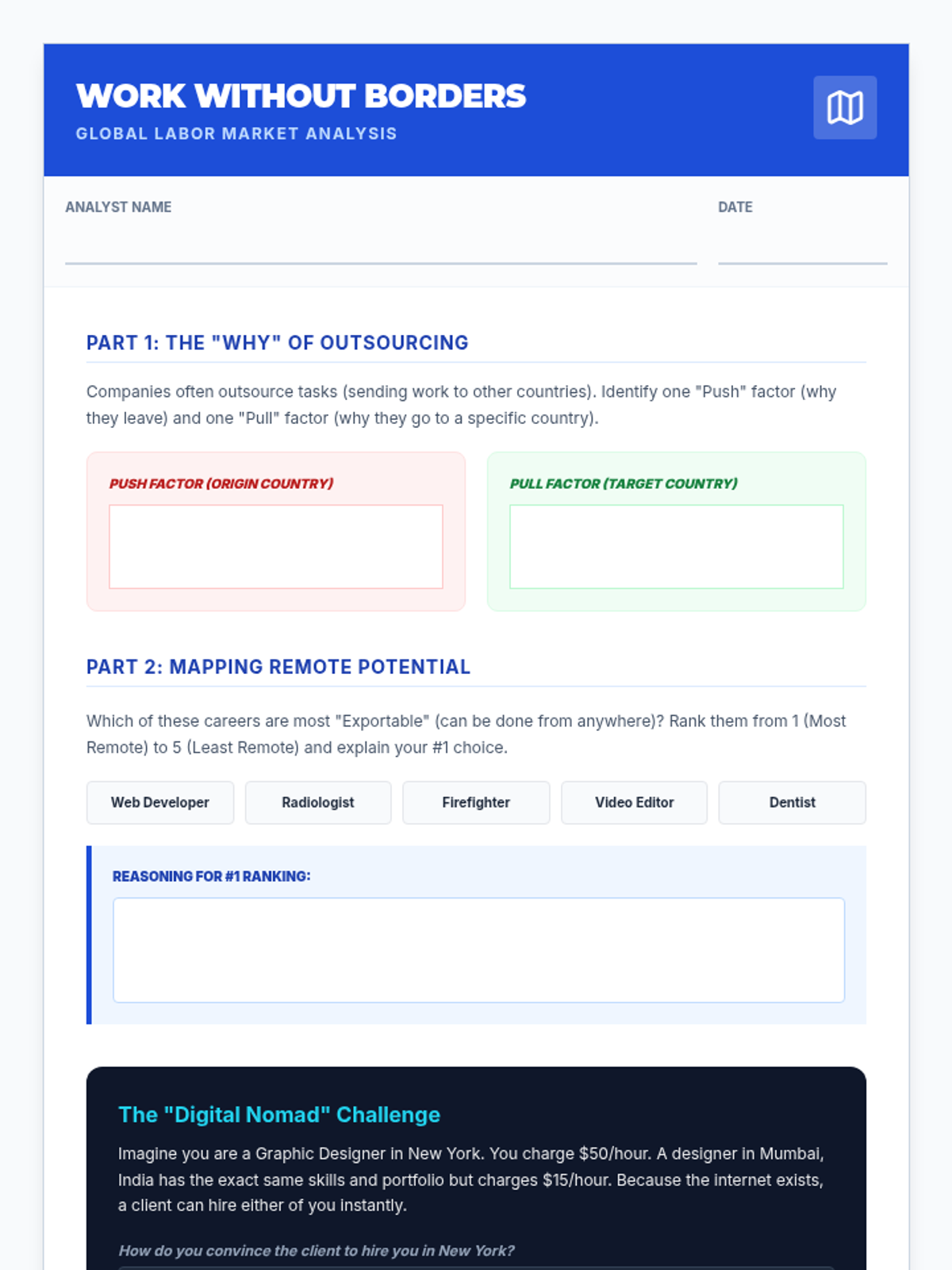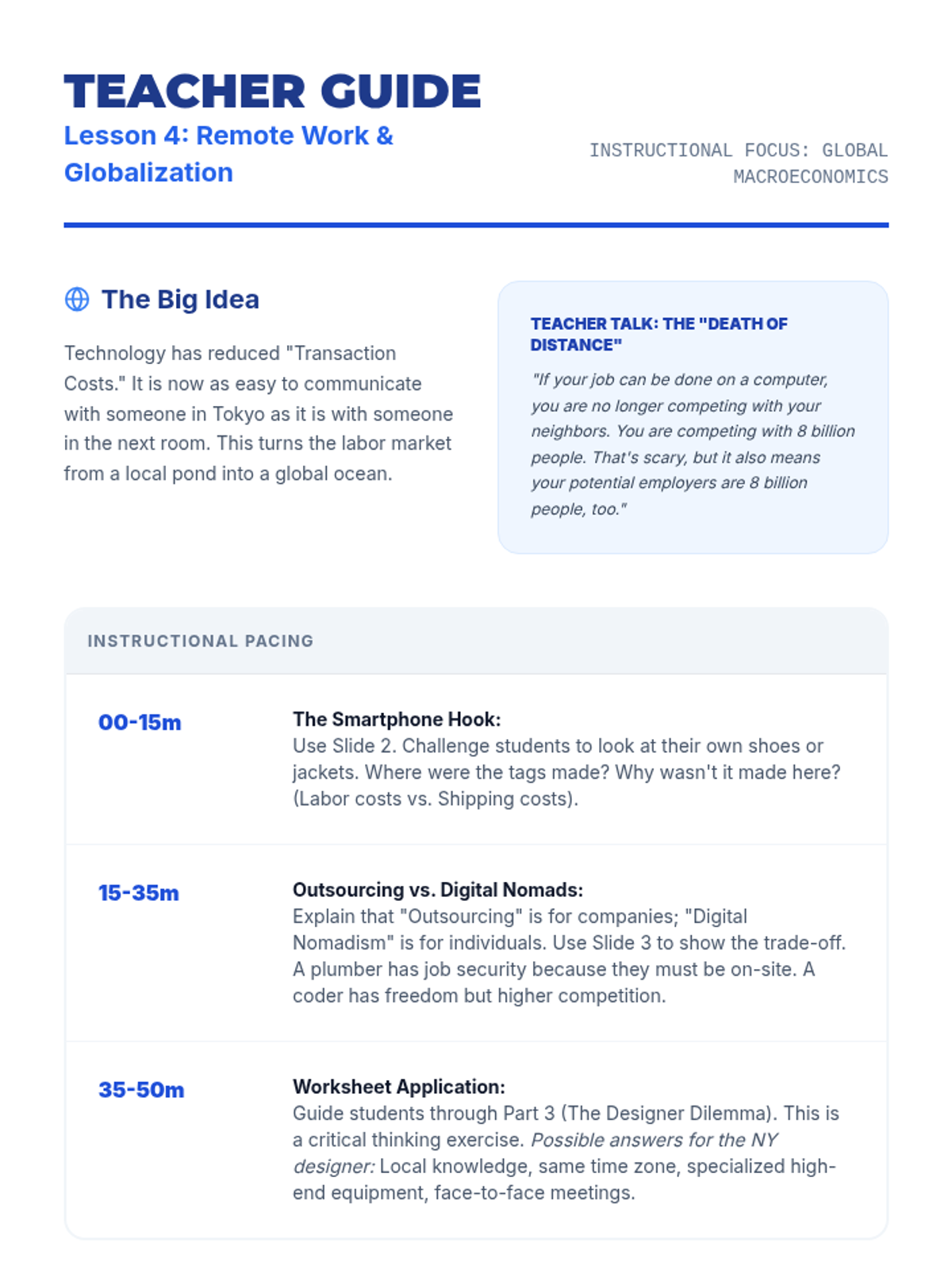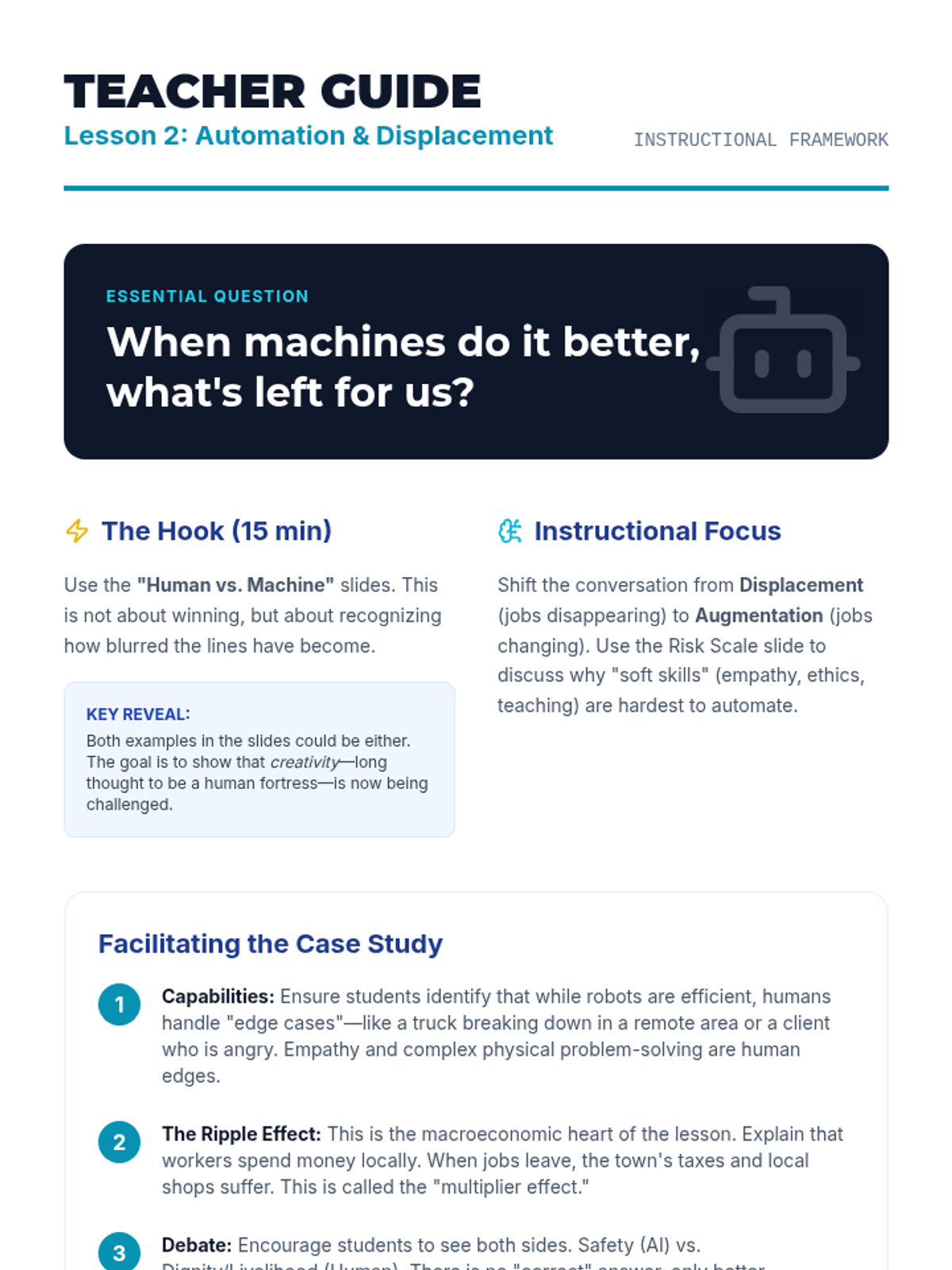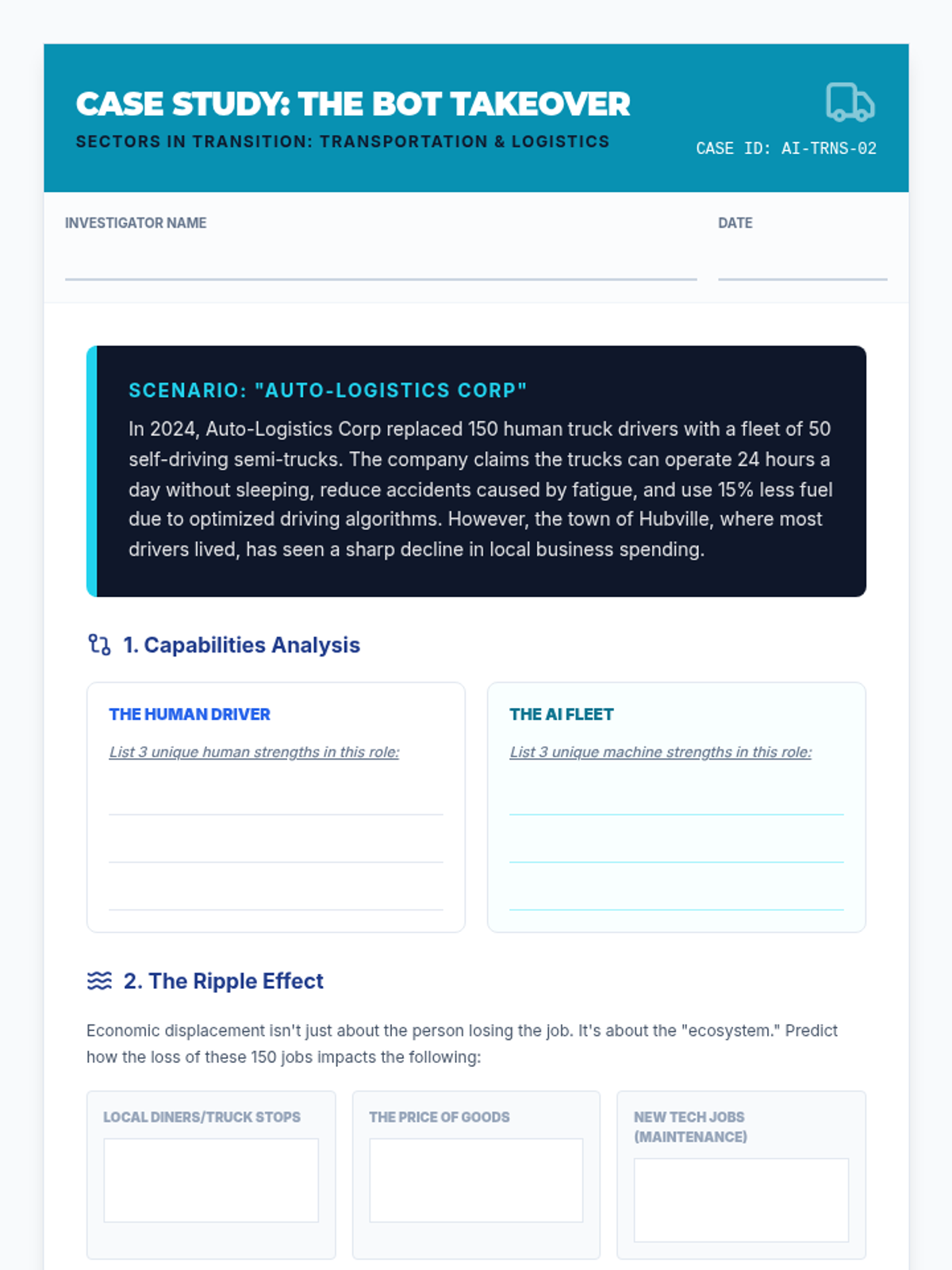 This sequence guides 8th-grade students through the evolution of the workplace, from historical industrial shifts to modern disruptors like AI, automation, and the gig economy. Students analyze data, participate in simulations, and forecast future skills needed for a globalized, digital workforce.