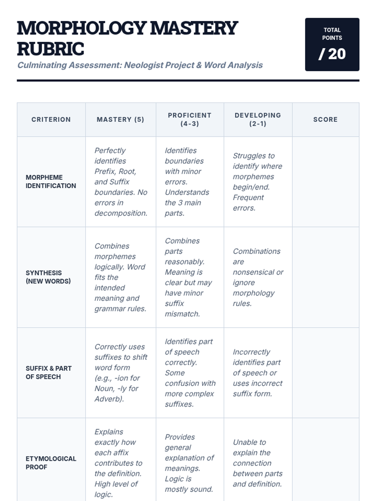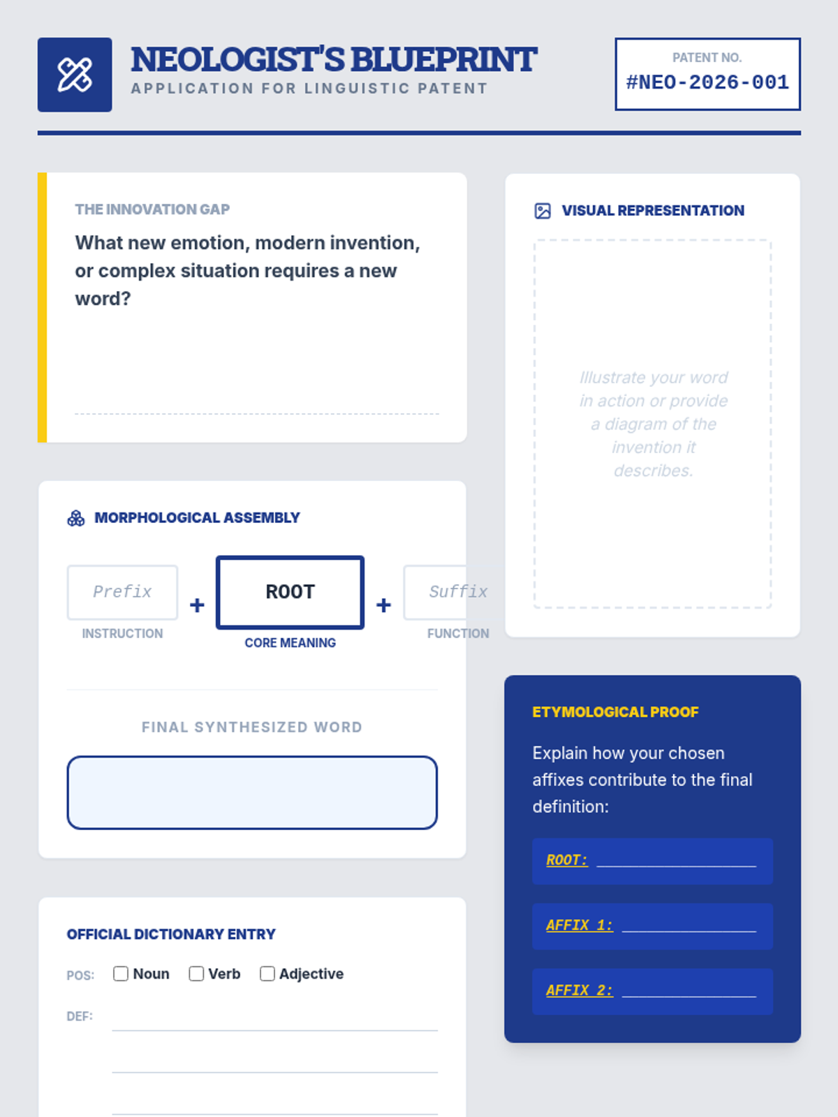 Students investigate the structural building blocks of the English language by deconstructing complex words into roots, prefixes, and suffixes. The sequence progresses from identifying common Greek and Latin affixes to synthesizing new words for specific contexts.