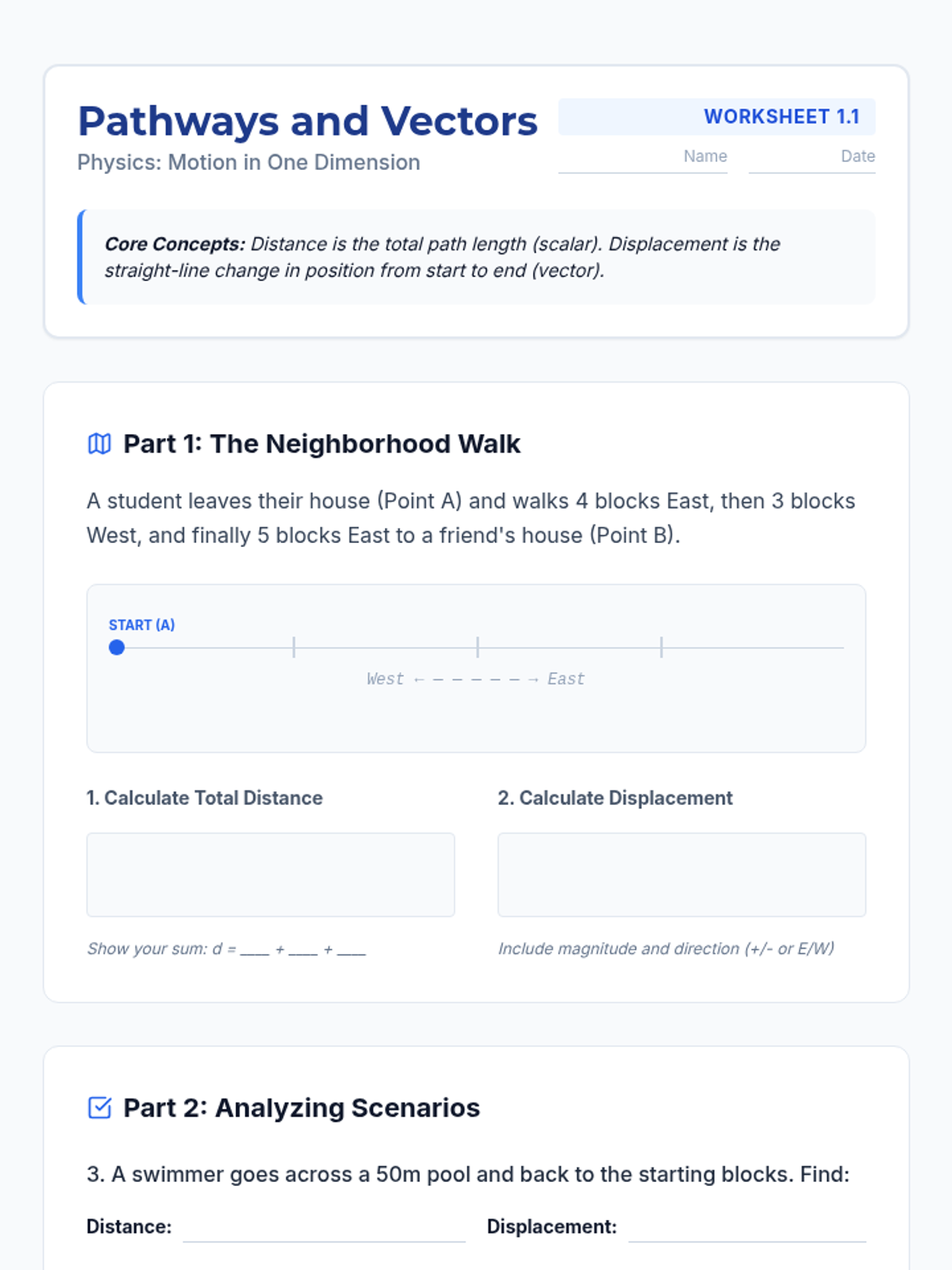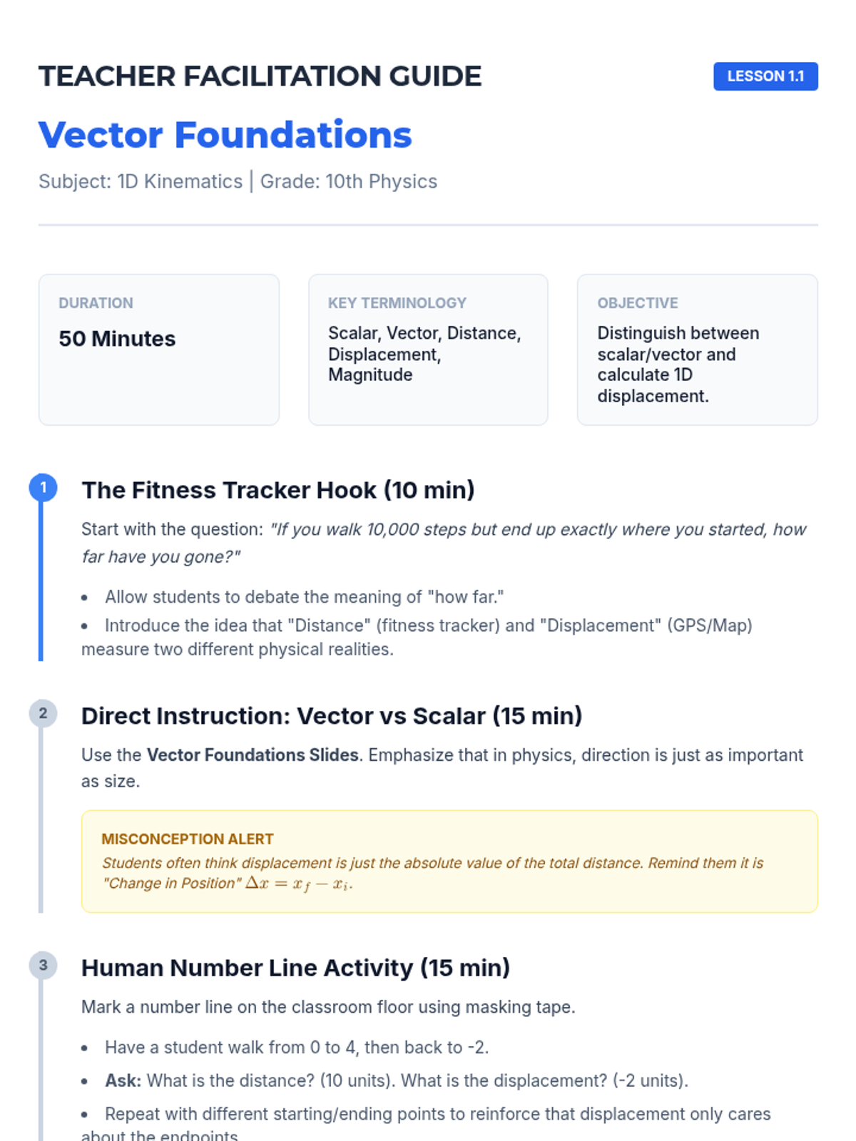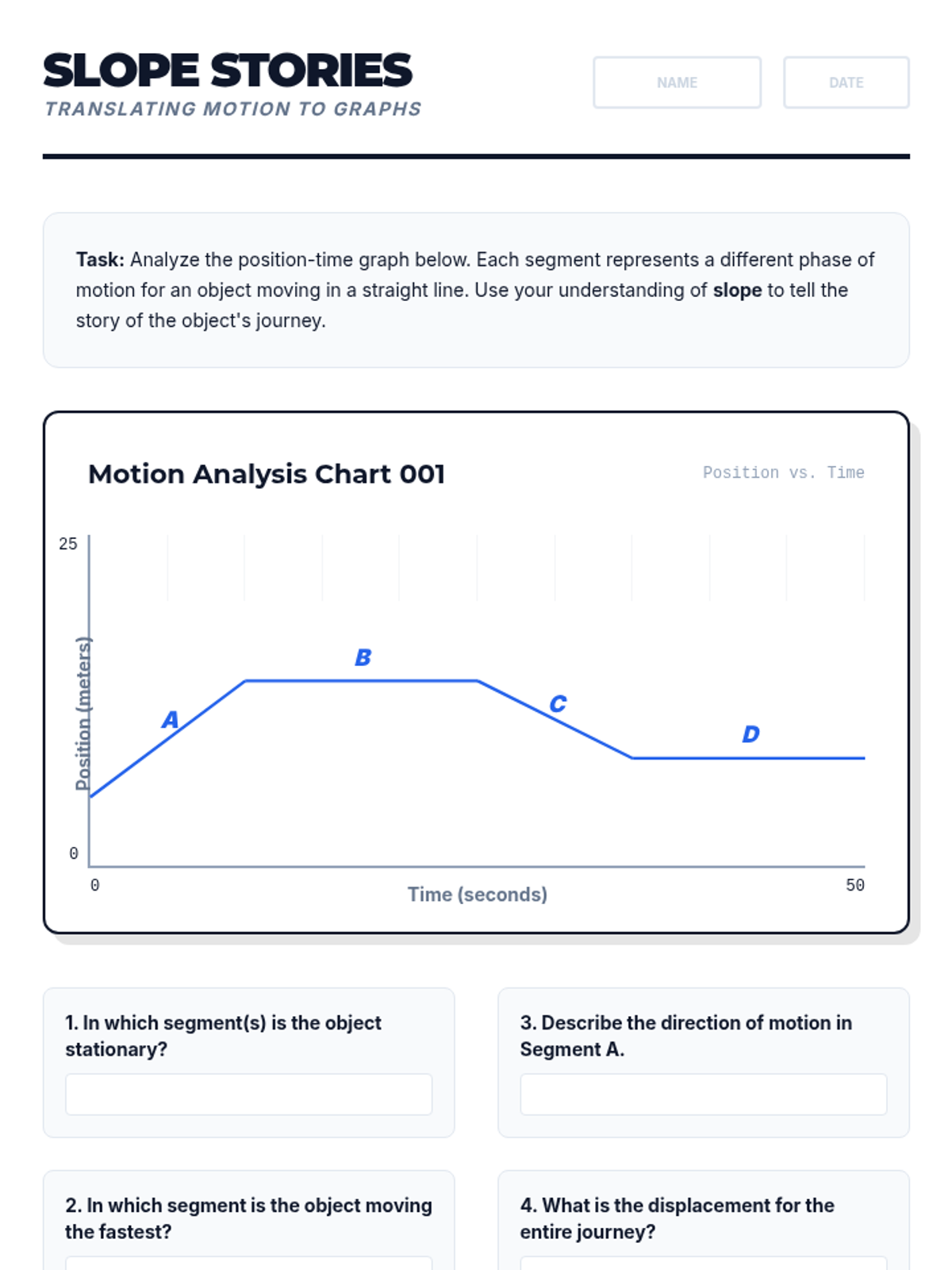A comprehensive physics sequence for 10th-grade students focusing on the graphical representation and analysis of motion in one dimension. Students move from basic scalar/vector distinctions to complex graph translations and scenario modeling.