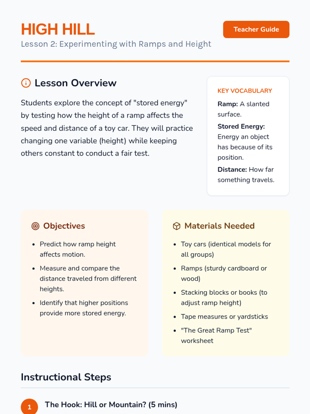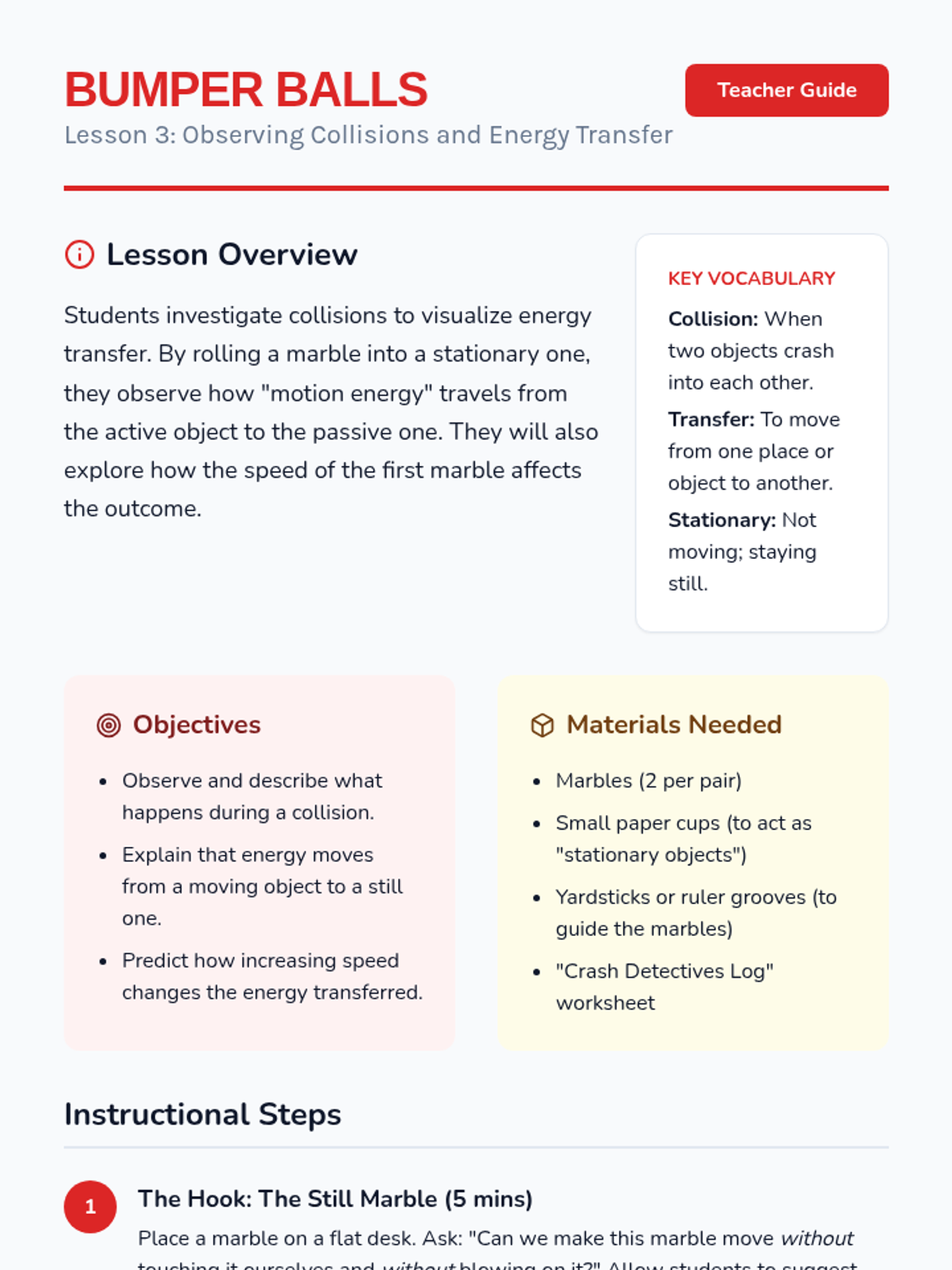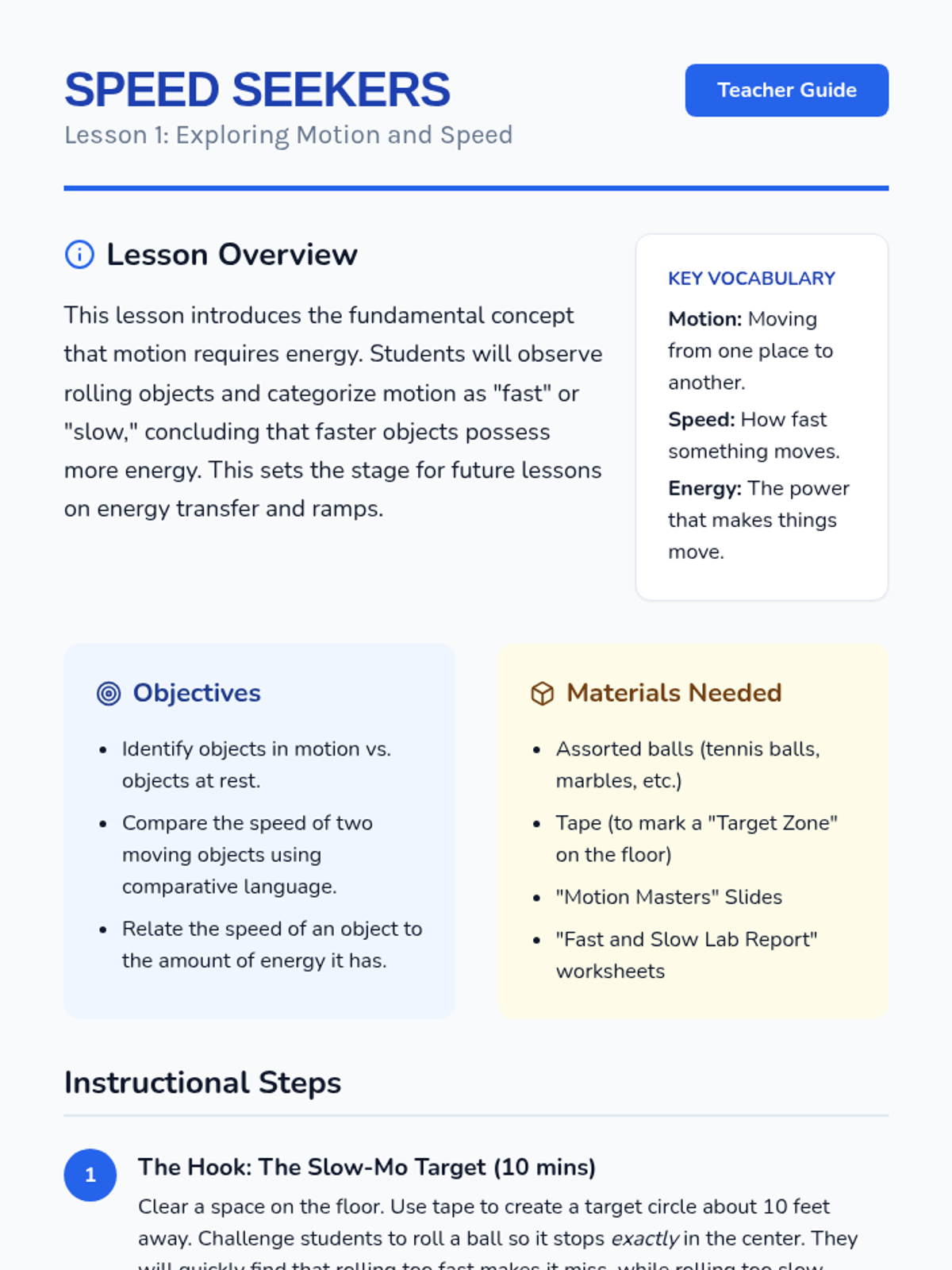 A 2nd-grade physics sequence exploring mechanical energy through game-based learning. Students investigate motion, speed, ramps, and collisions to understand how energy is stored and transferred.