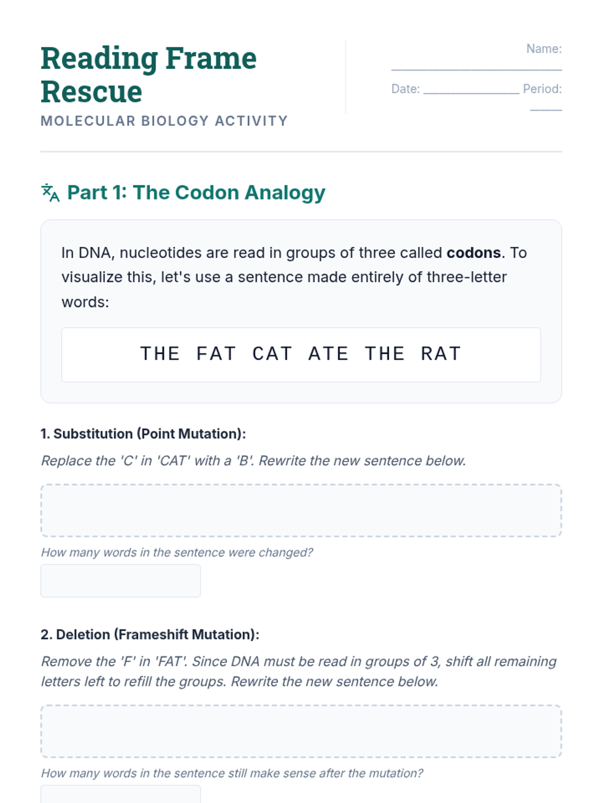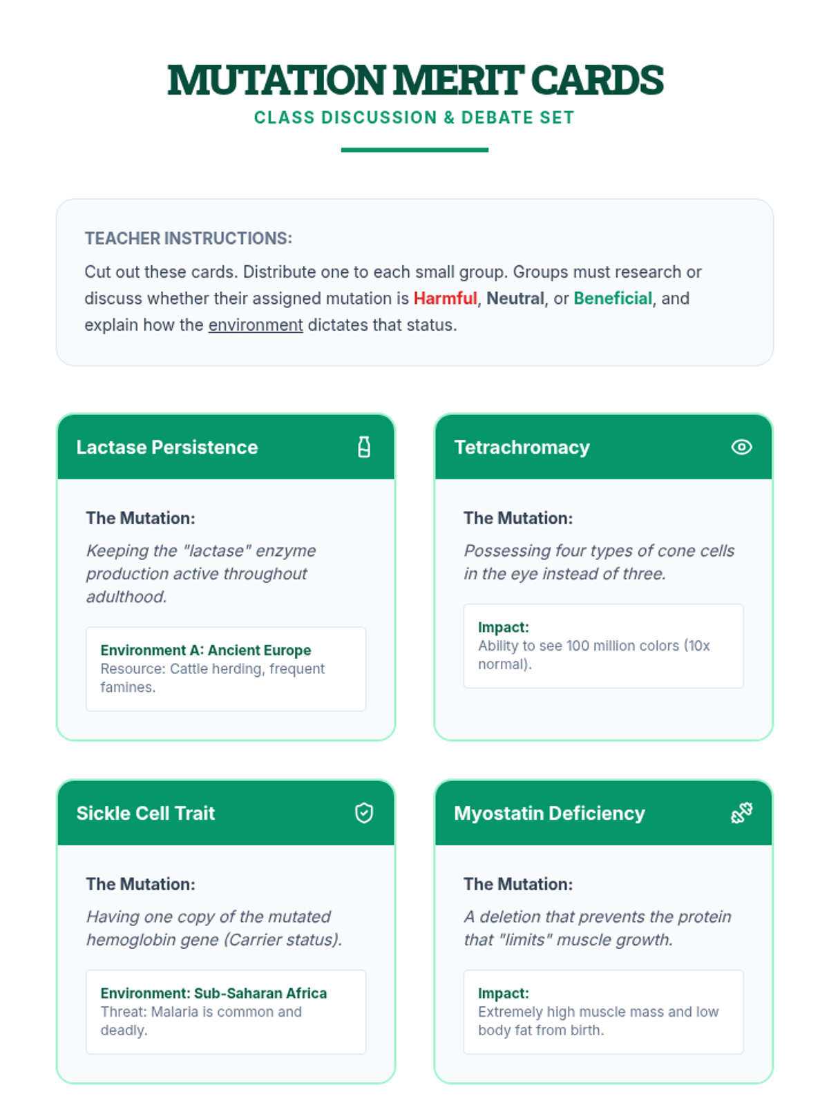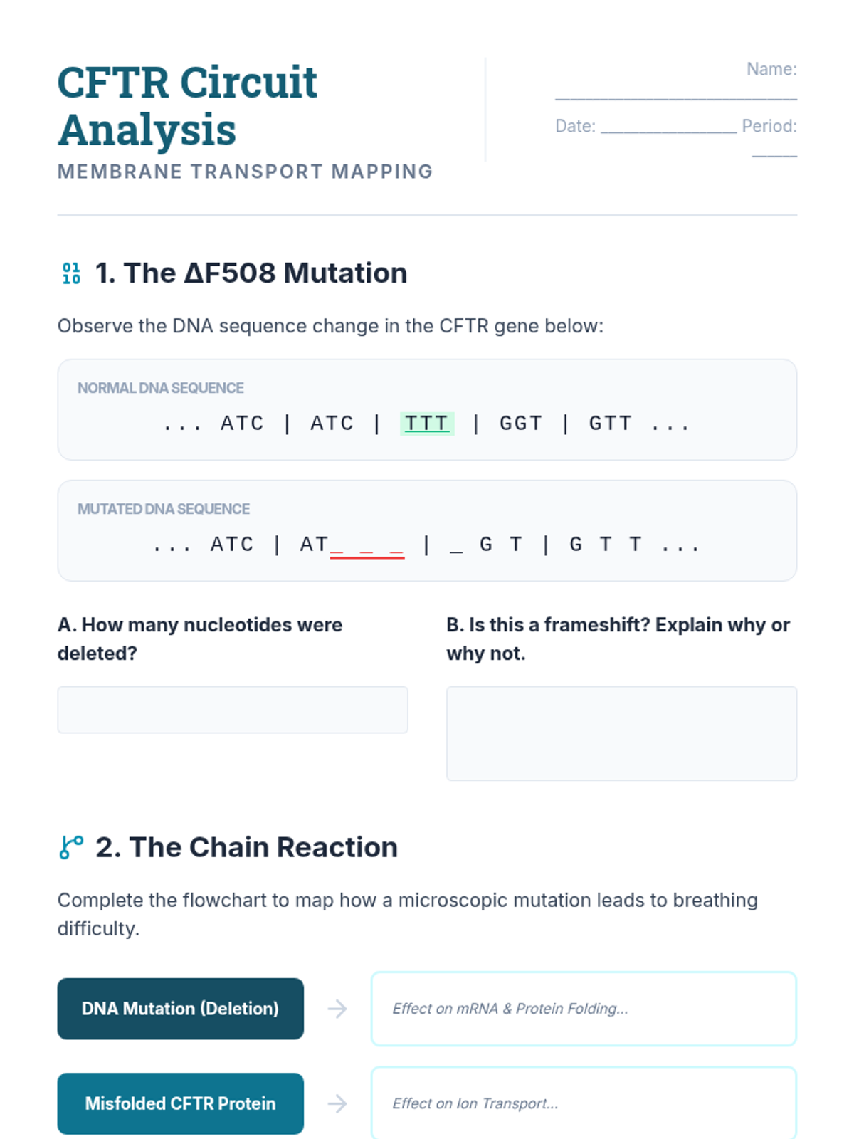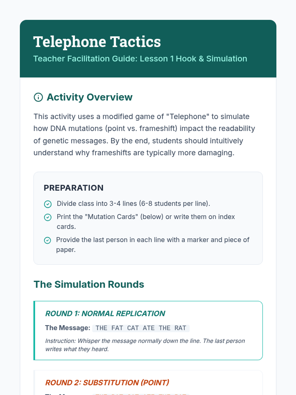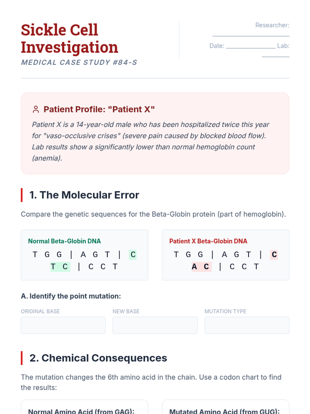 This sequence investigates the specific consequences of deviations in the genetic code, moving from abstract definitions of mutations to real-world medical case studies. Students categorize different types of mutations and trace their impact from the molecular level to systemic physiological symptoms, culminating in an exploration of mutations as a source of evolutionary variation.