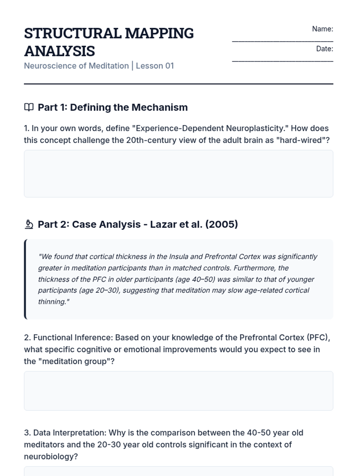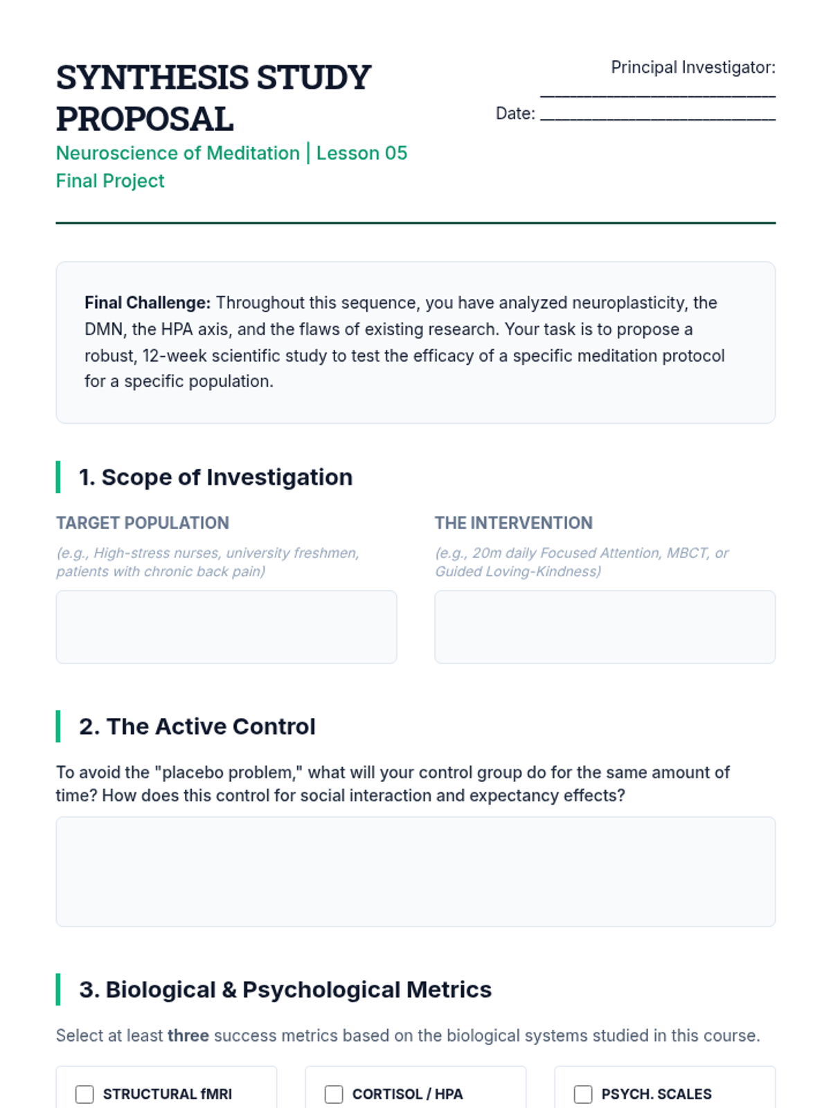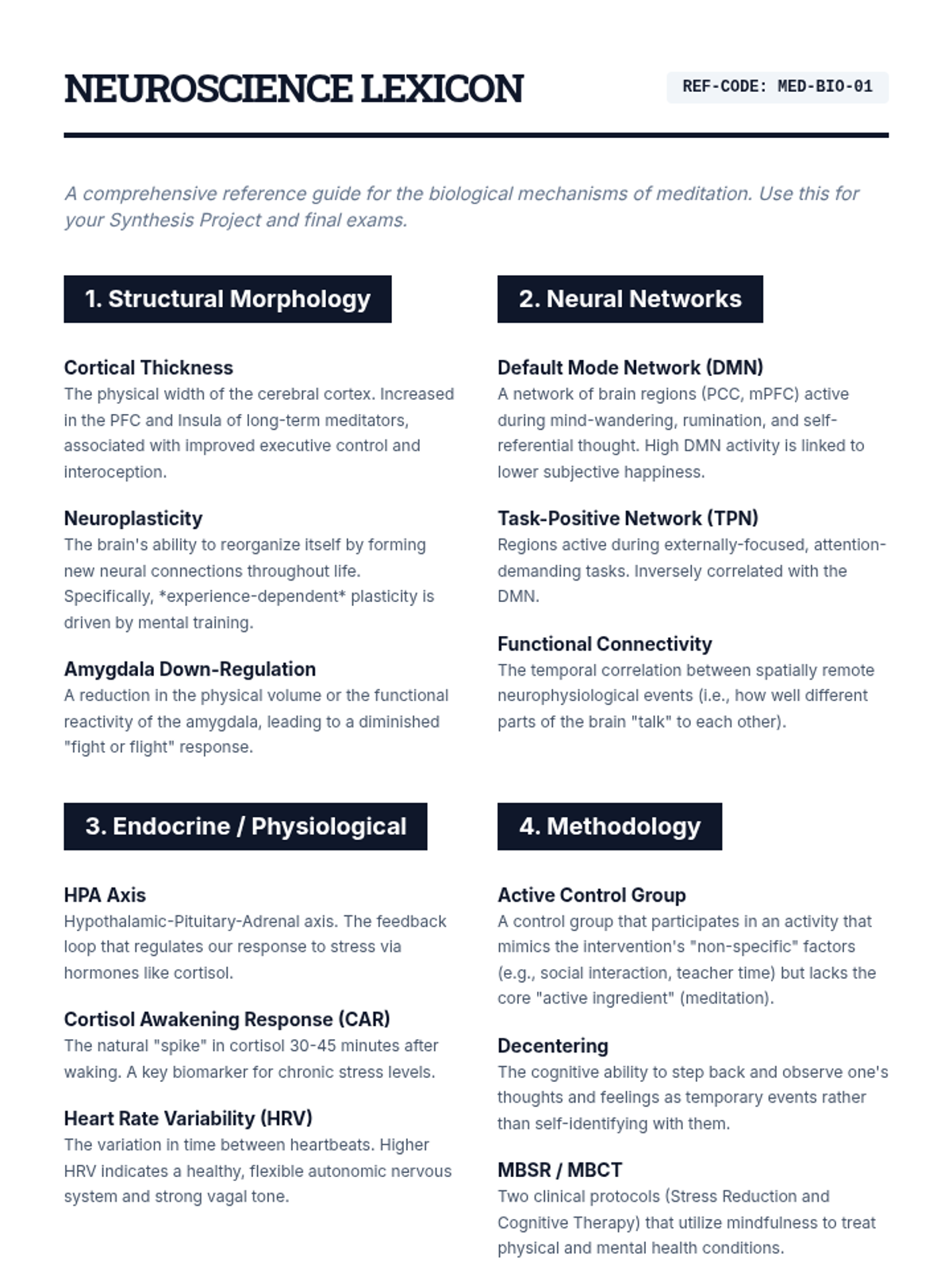 An undergraduate-level sequence exploring the neurobiological mechanisms of meditation, focusing on neuroplasticity, the default mode network, the HPA axis, and critical research evaluation. students analyze empirical evidence to understand how mental training reshapes the brain and body.