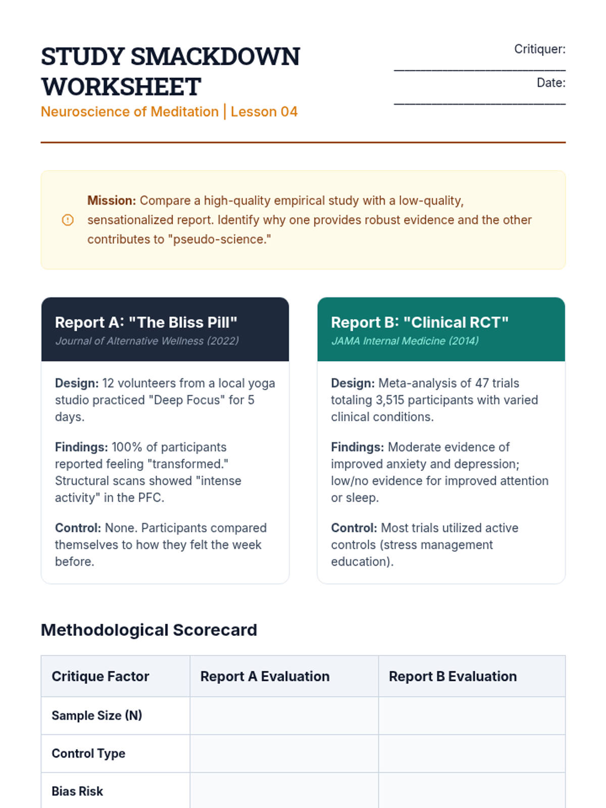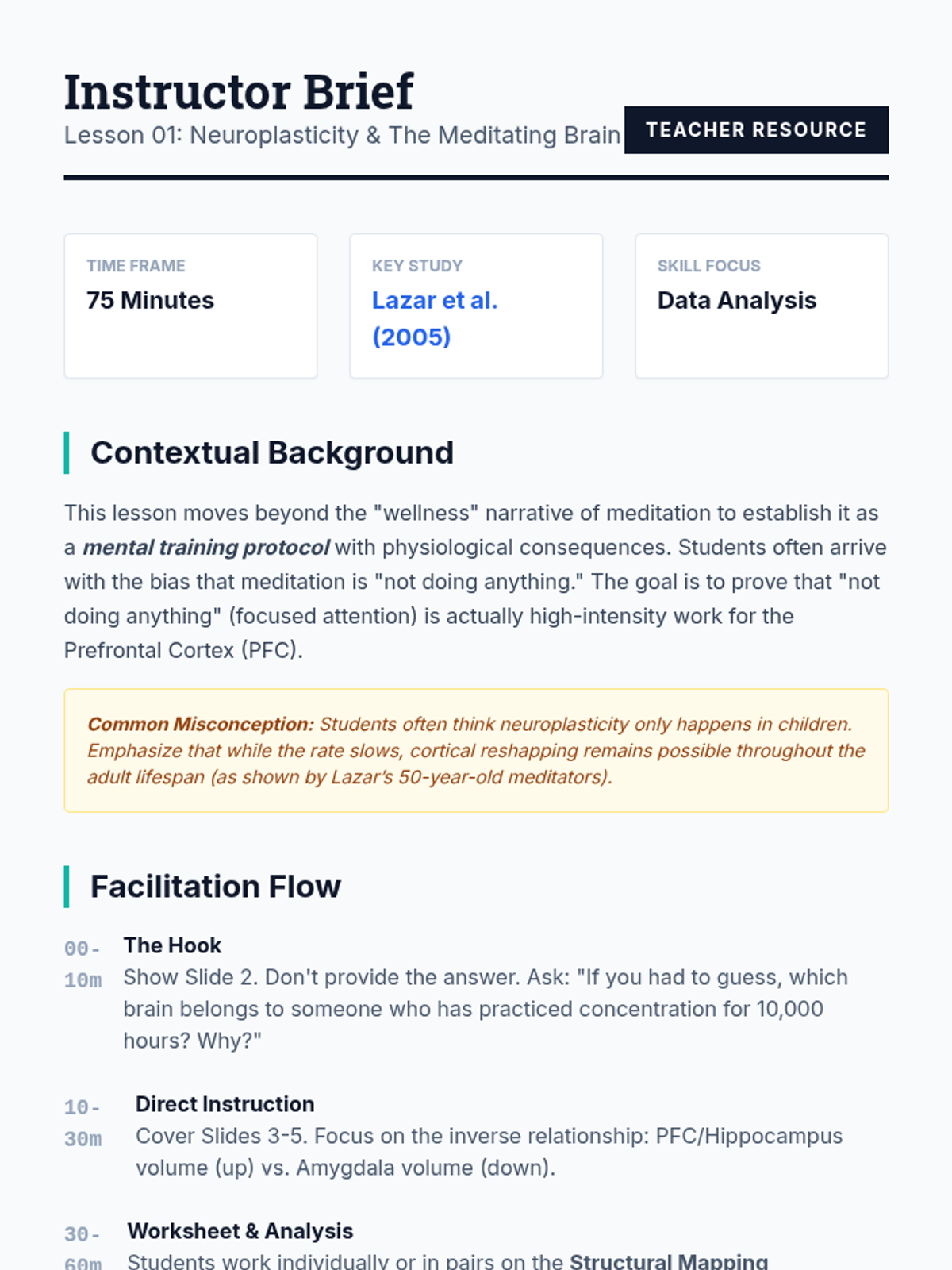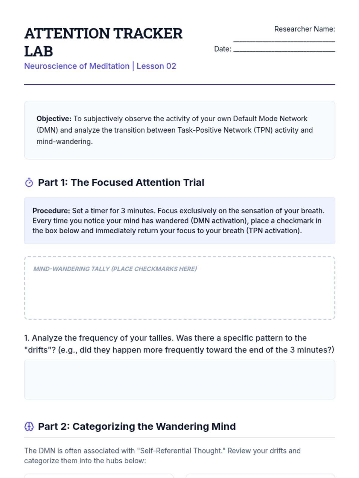 An undergraduate-level sequence exploring the neurobiological mechanisms of meditation, focusing on neuroplasticity, the default mode network, the HPA axis, and critical research evaluation. students analyze empirical evidence to understand how mental training reshapes the brain and body.