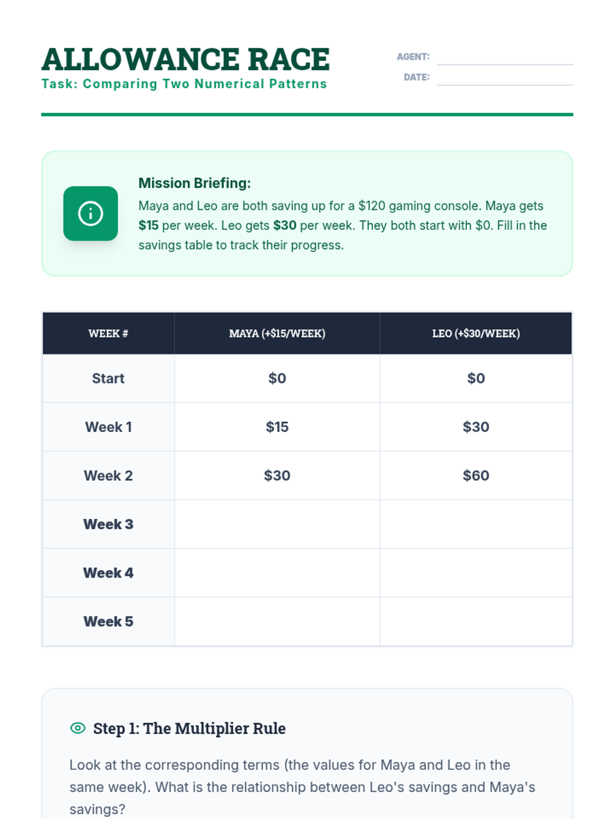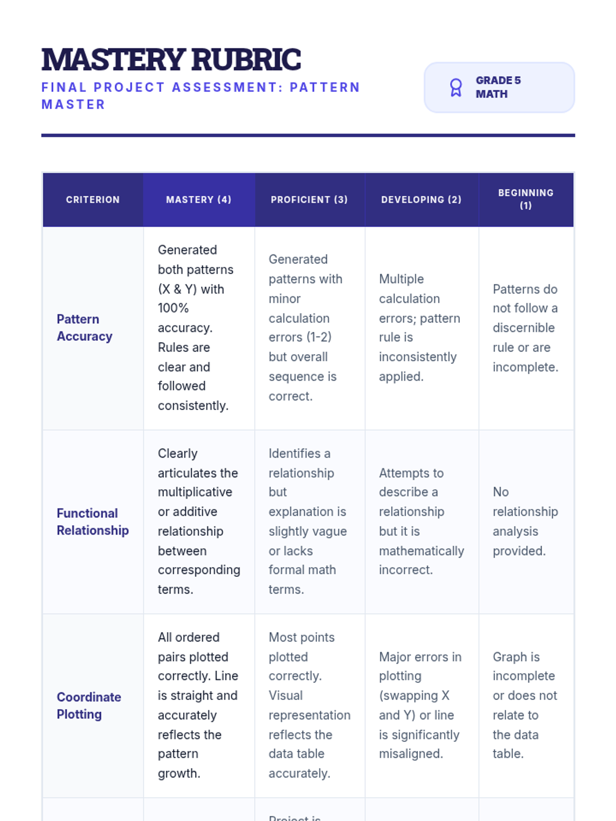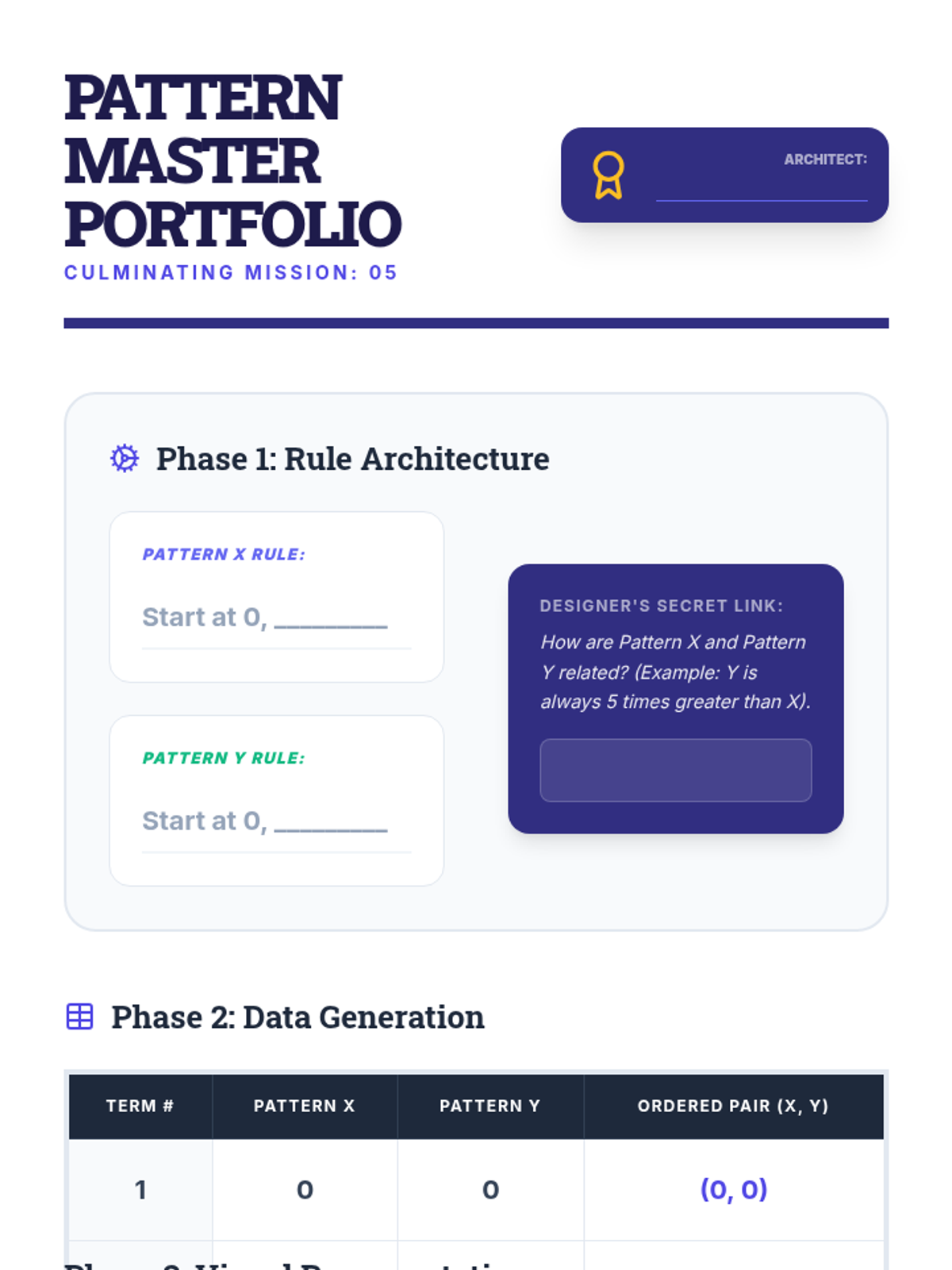 A comprehensive 5th-grade math sequence exploring numerical patterns, the rules governing them, and their visual representation on coordinate planes. Students advance from identifying simple rules to comparing two related patterns and graphing functional relationships.