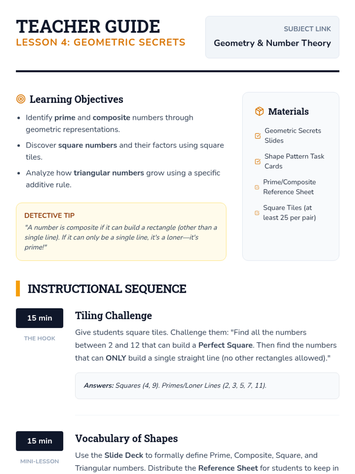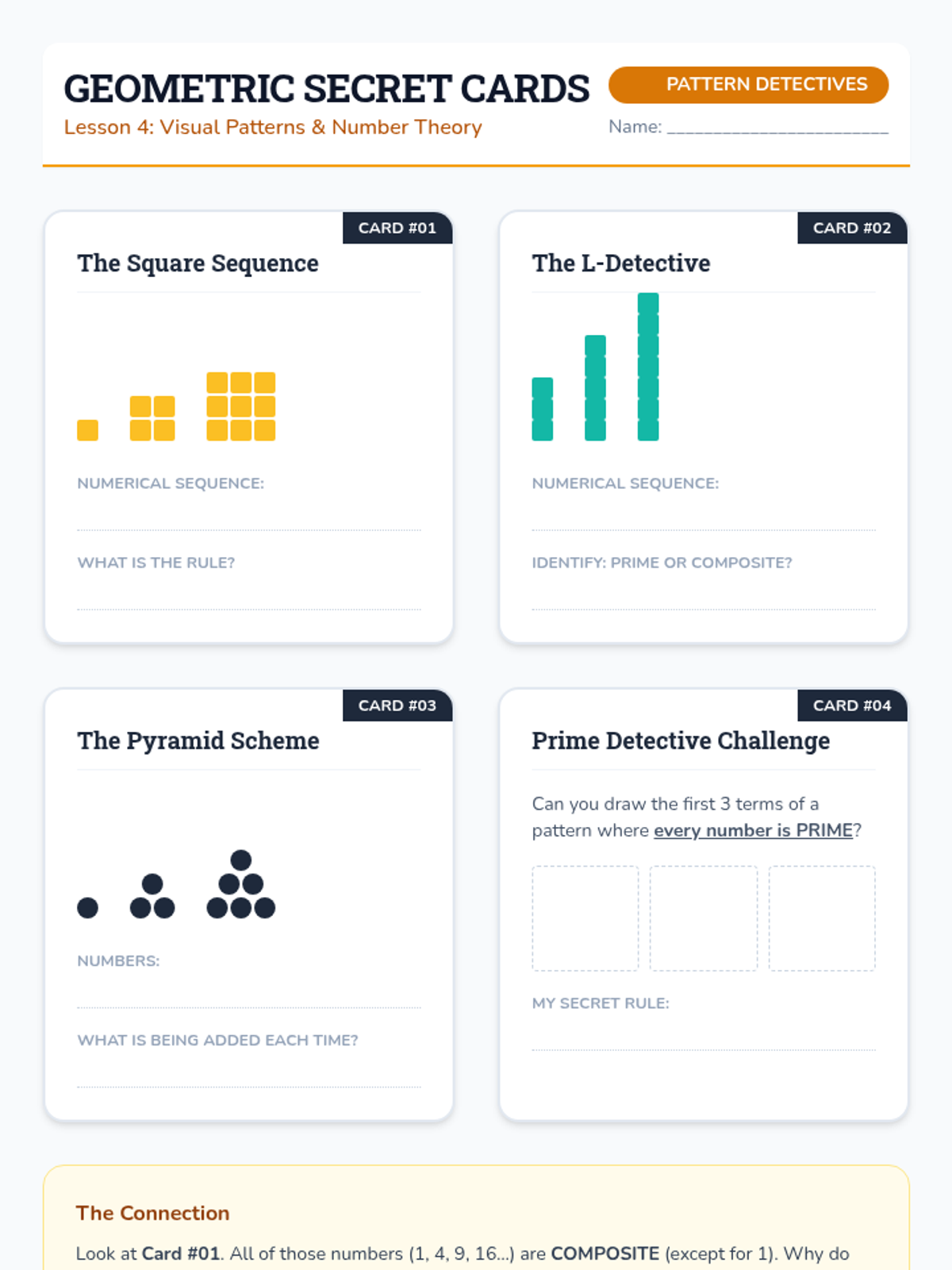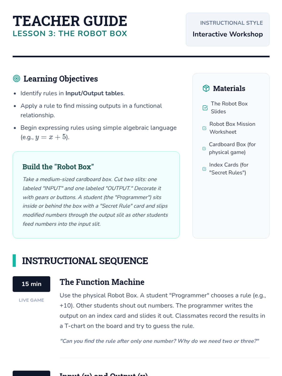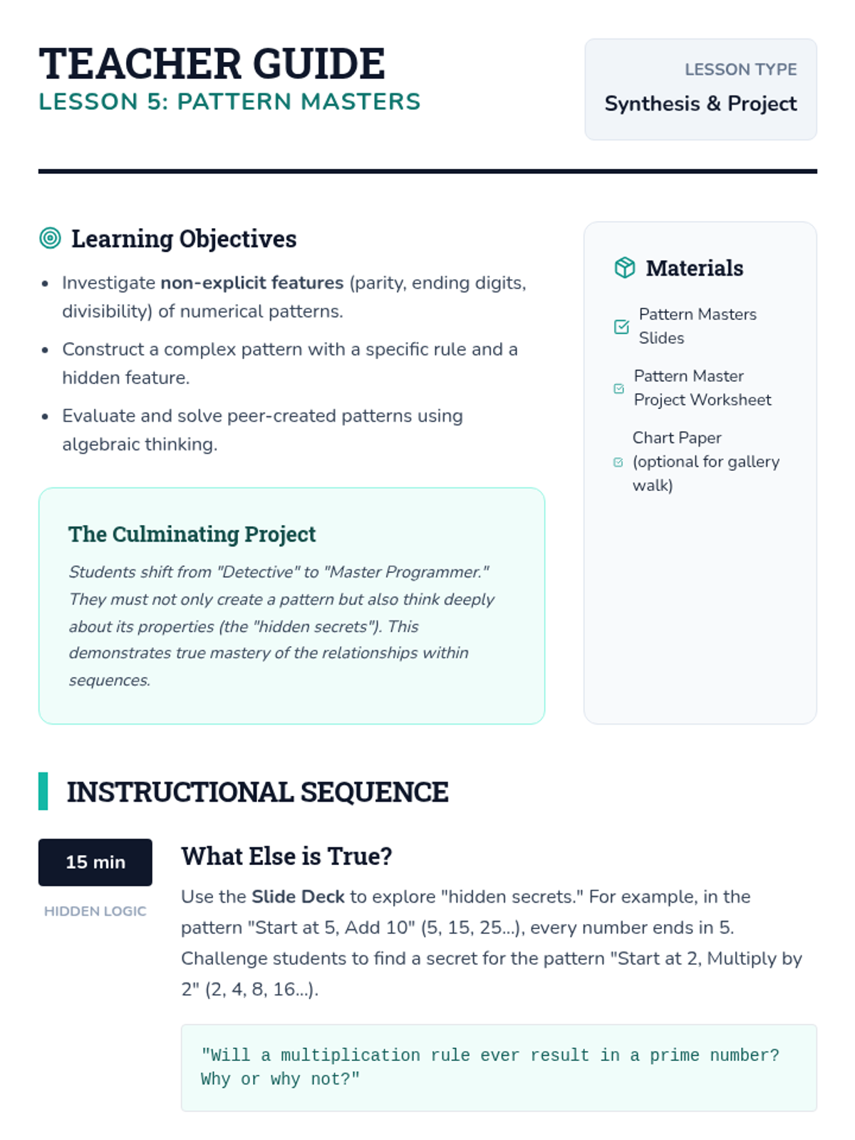 This inquiry-based sequence focuses on algebraic thinking by exploring numerical patterns and functional relationships. Students progress from simple repeating and growing patterns to identifying explicit rules and using them to predict future terms.