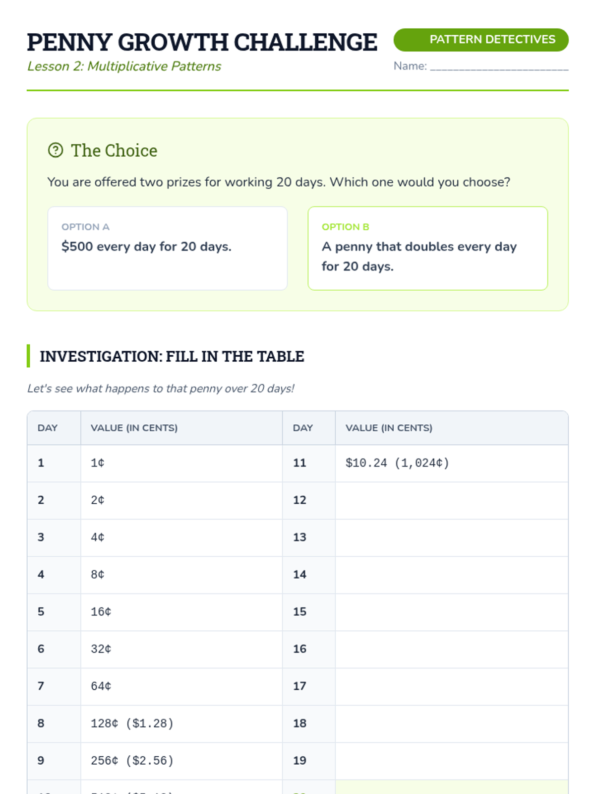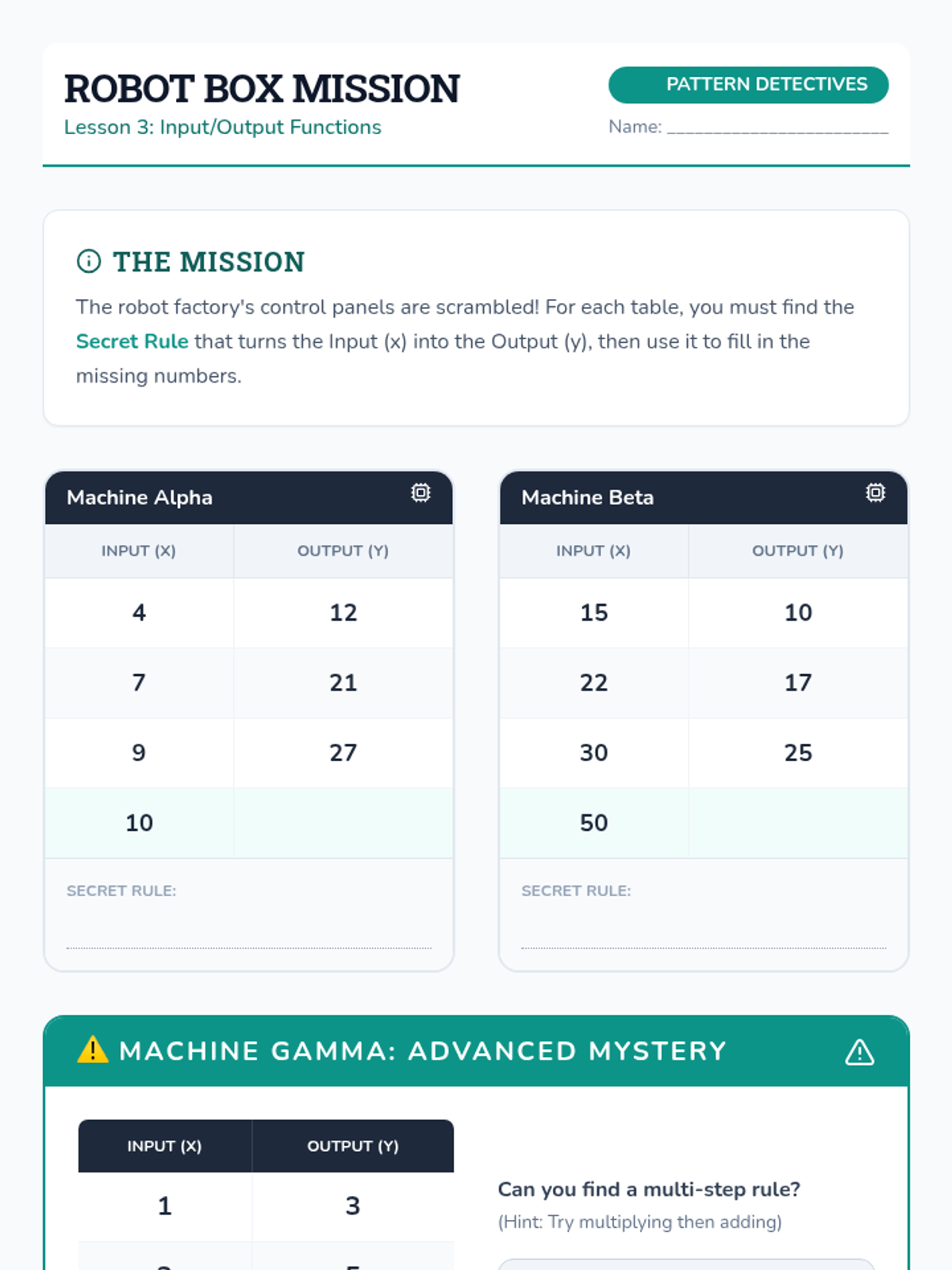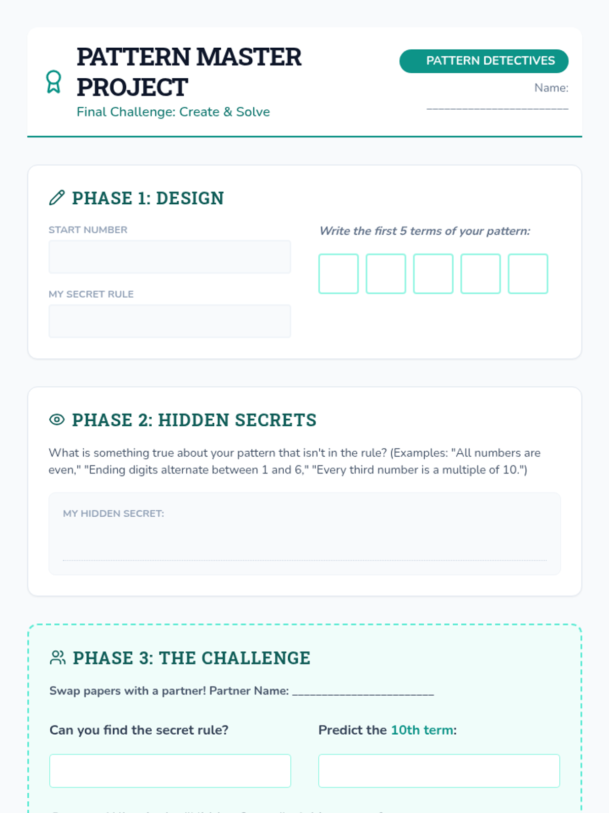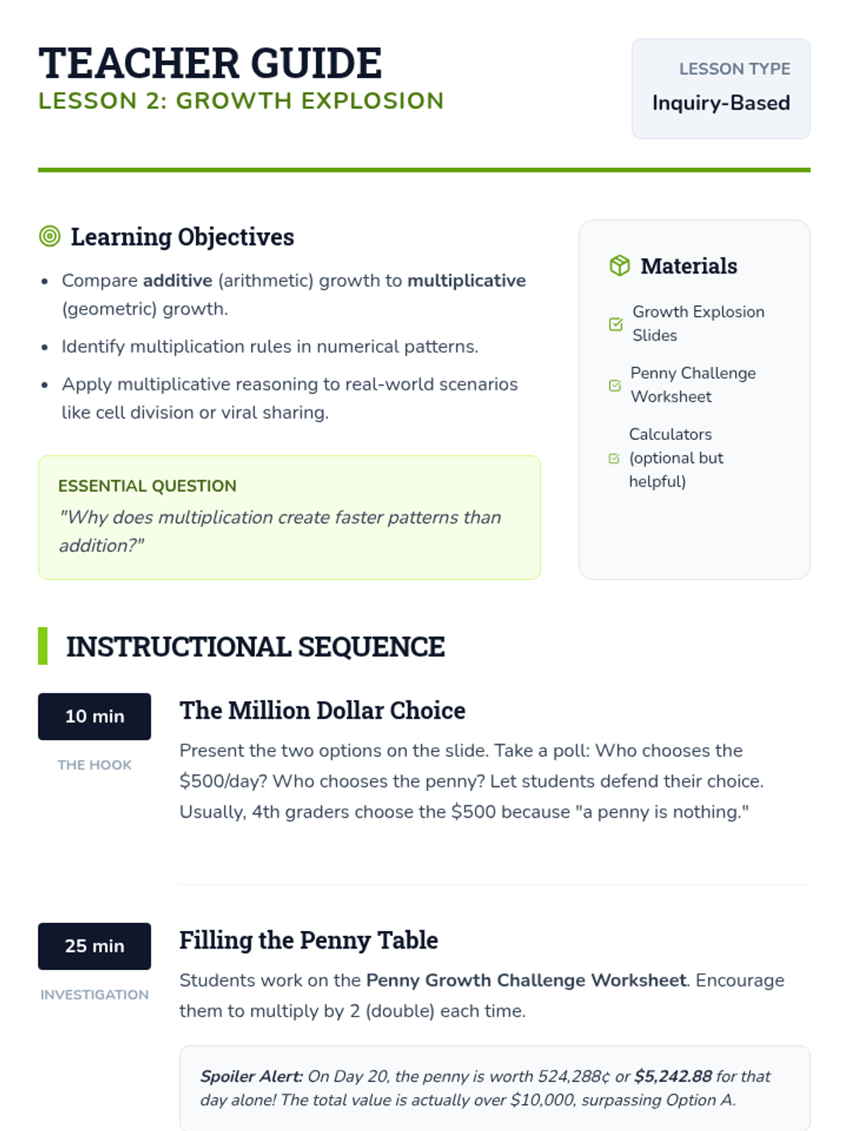 This inquiry-based sequence focuses on algebraic thinking by exploring numerical patterns and functional relationships. Students progress from simple repeating and growing patterns to identifying explicit rules and using them to predict future terms.