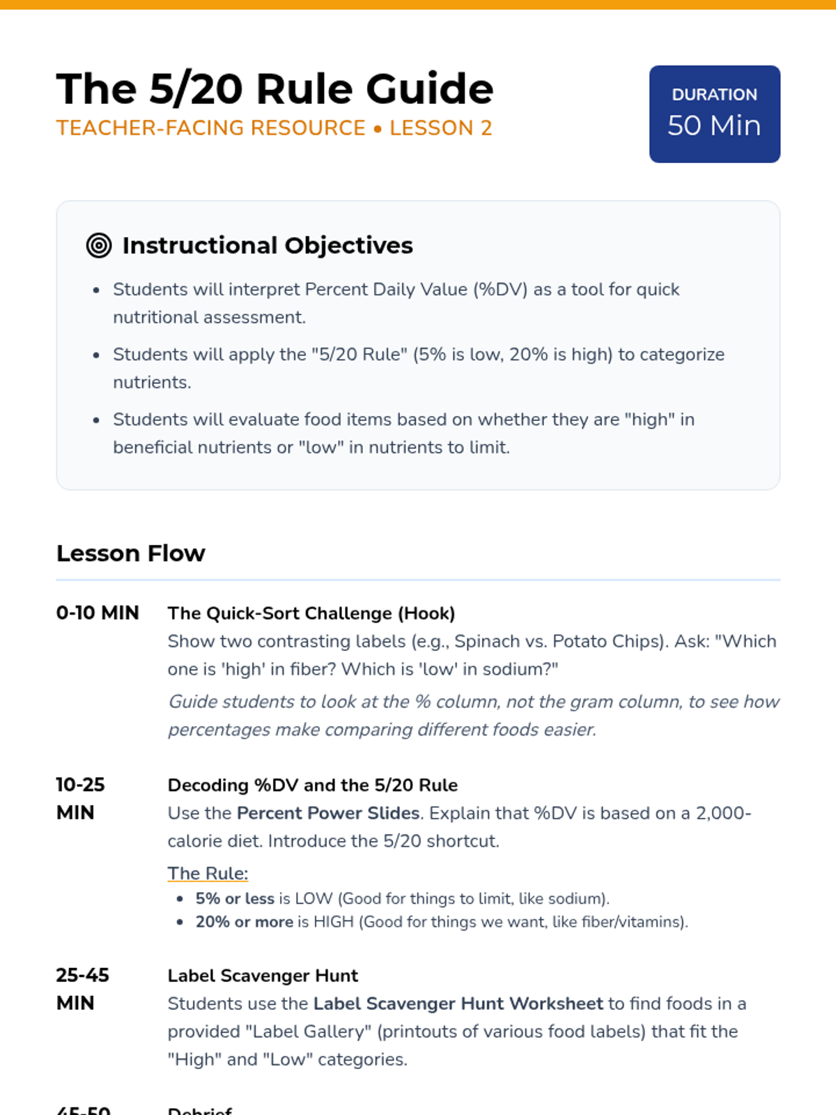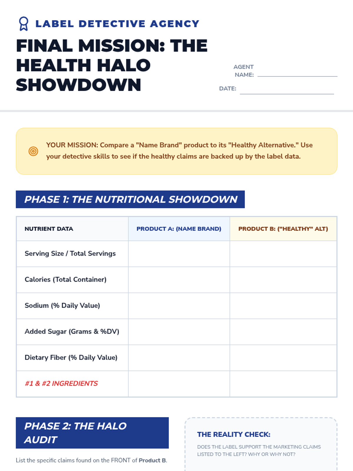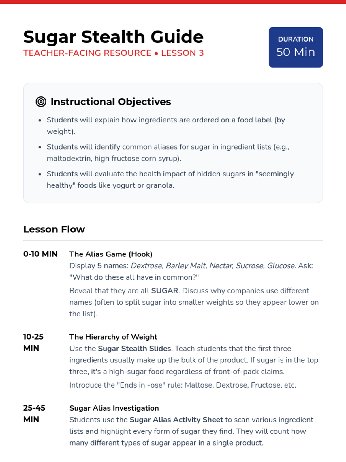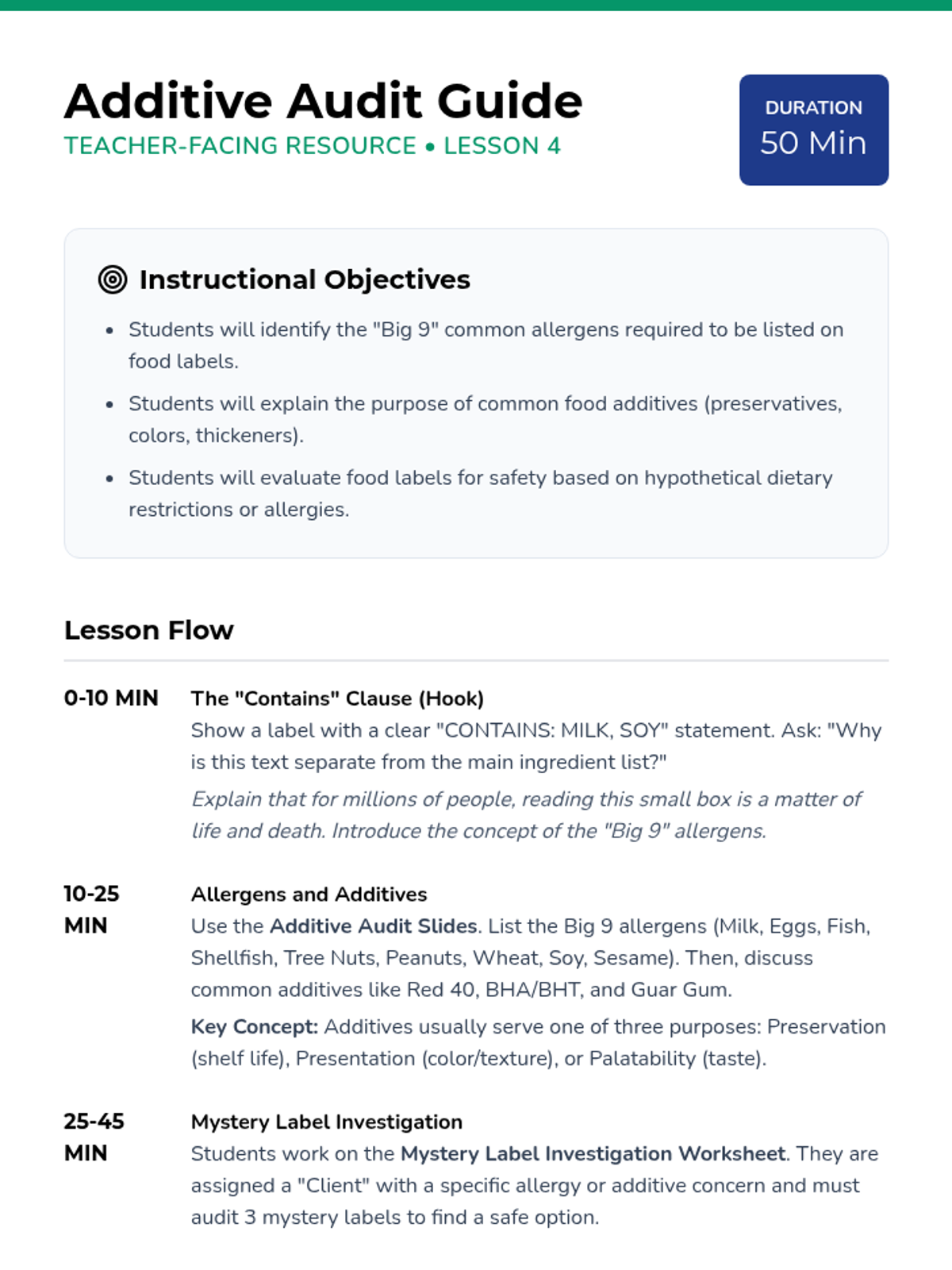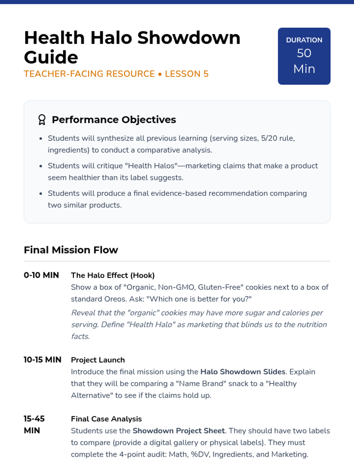 A comprehensive 8th-grade sequence that transforms students into 'Nutrition Detectives.' Students learn to look past front-of-package marketing by mastering serving size math, interpreting % Daily Values, identifying hidden sugars, evaluating additives/allergens, and critiquing health claims to make evidence-based dietary choices.