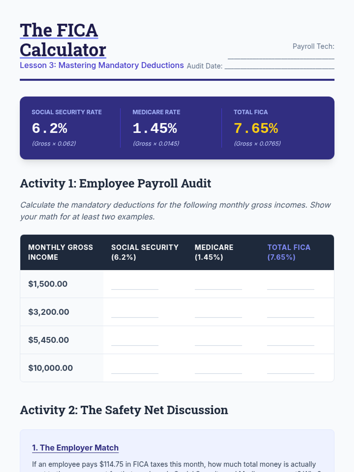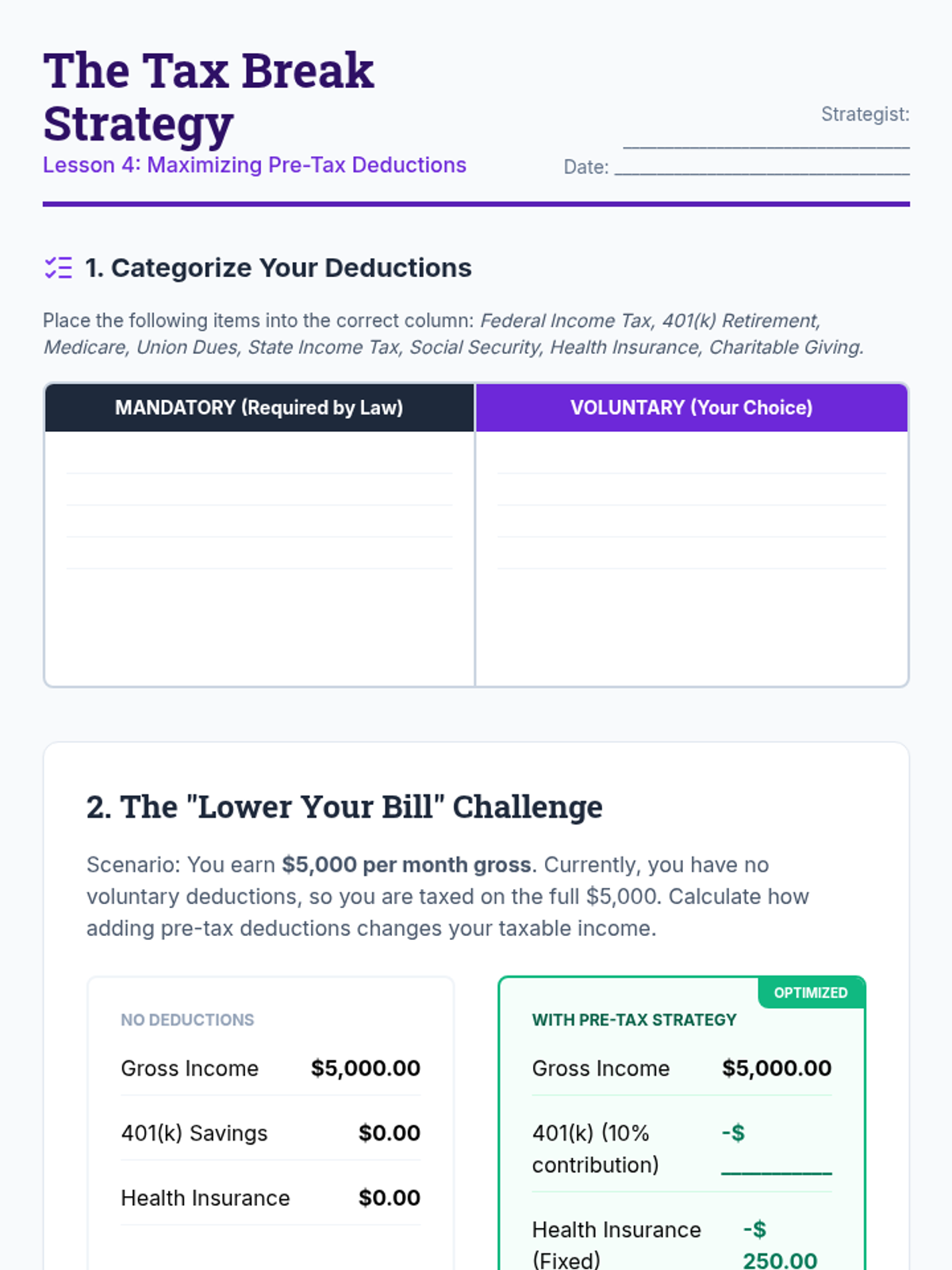This sequence immerses 10th-grade students in the mechanics of workplace compensation, tracking the journey from gross salary to take-home pay. Students master tax form completion, calculate mandatory and voluntary deductions, and learn to audit paystubs for accuracy, equipping them with essential technical financial literacy for their future careers.