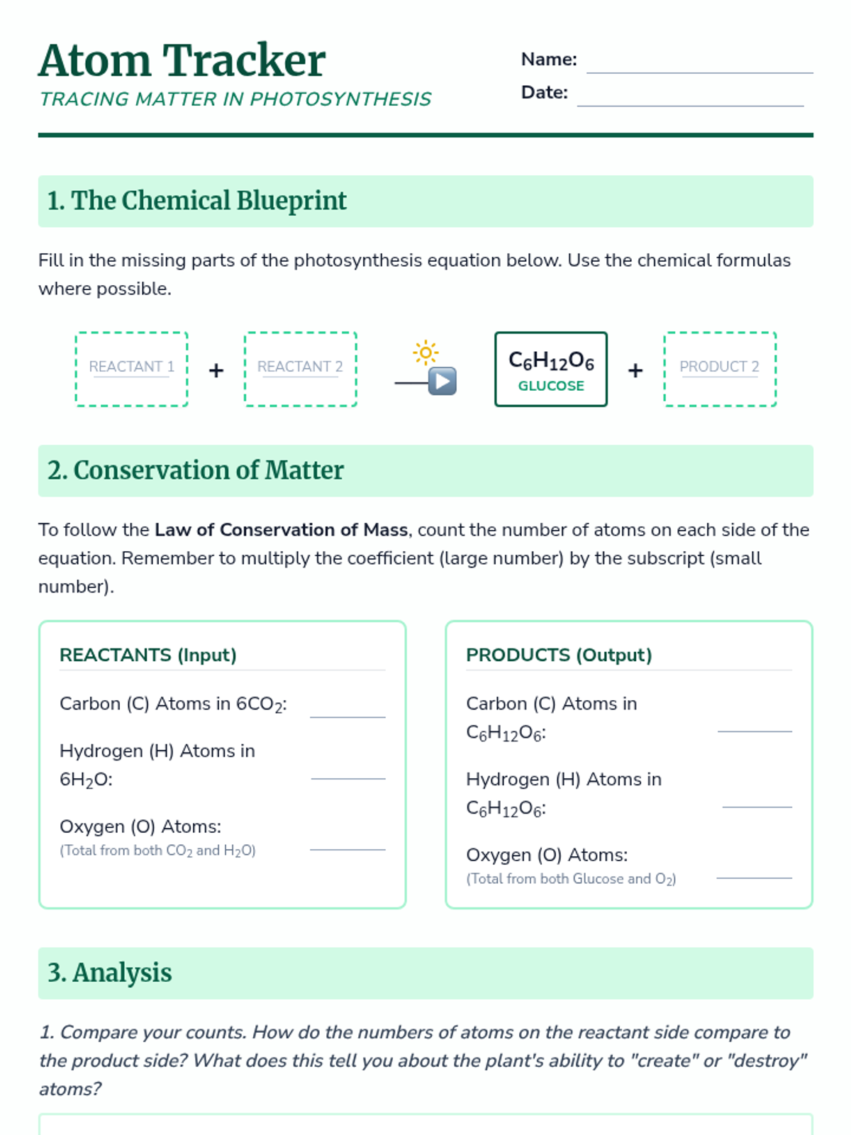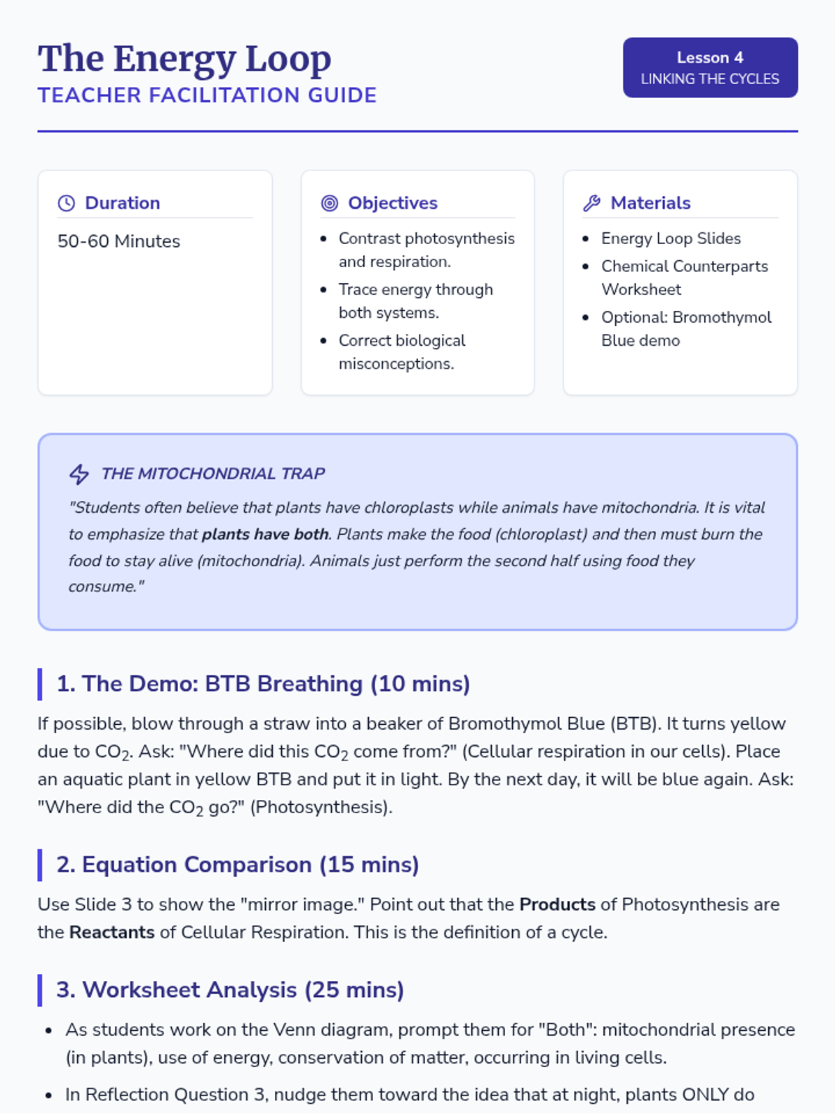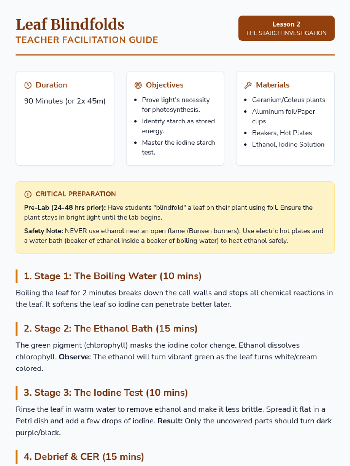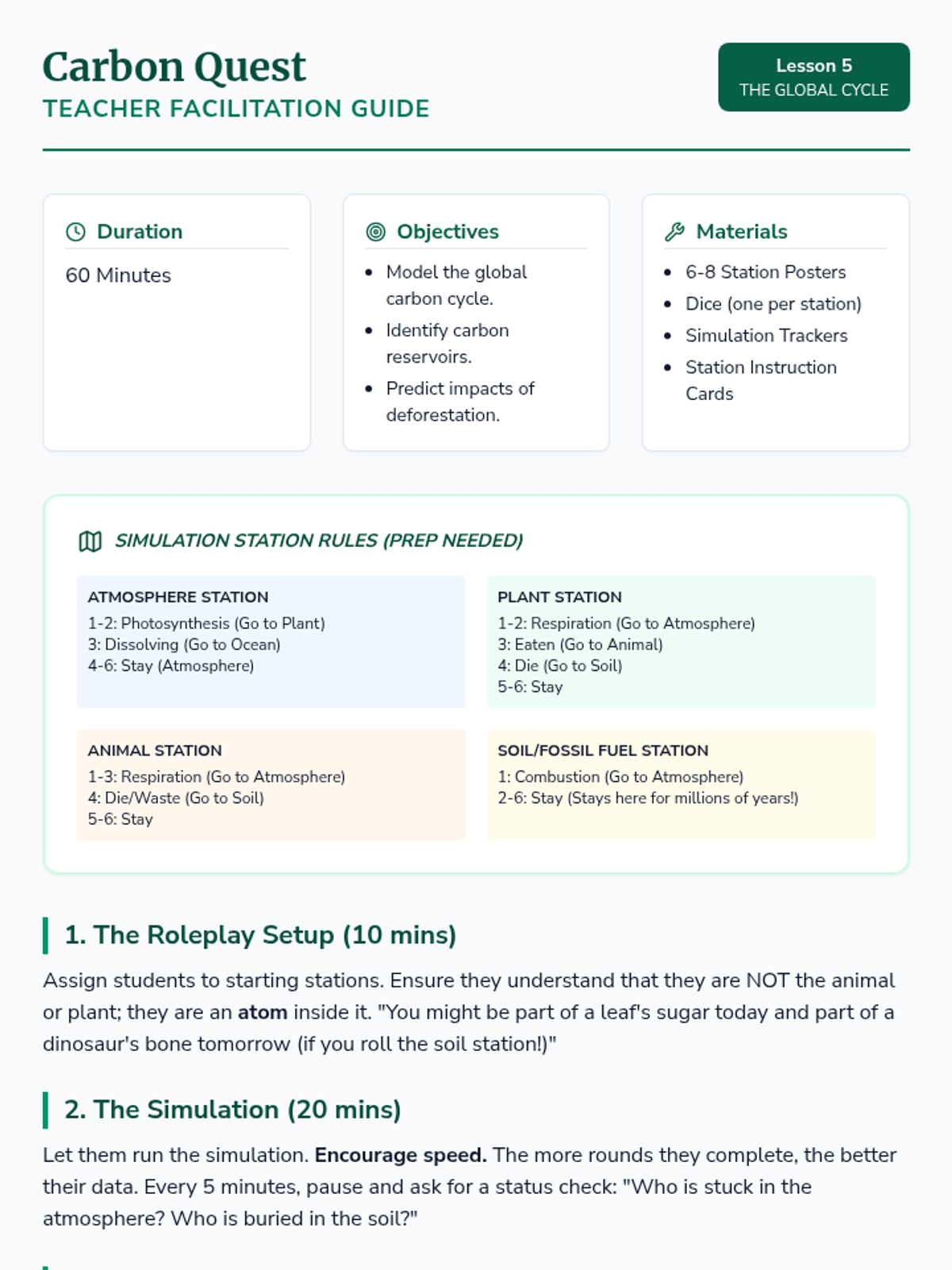 An inquiry-driven sequence for 8th-grade students to explore photosynthesis, energy transformation, and the cycling of matter in ecosystems. Students investigate the chemical equation of photosynthesis, conduct hands-on experiments with light and starch, measure photosynthetic rates using aquatic plants, and connect these processes to cellular respiration and the global carbon cycle.