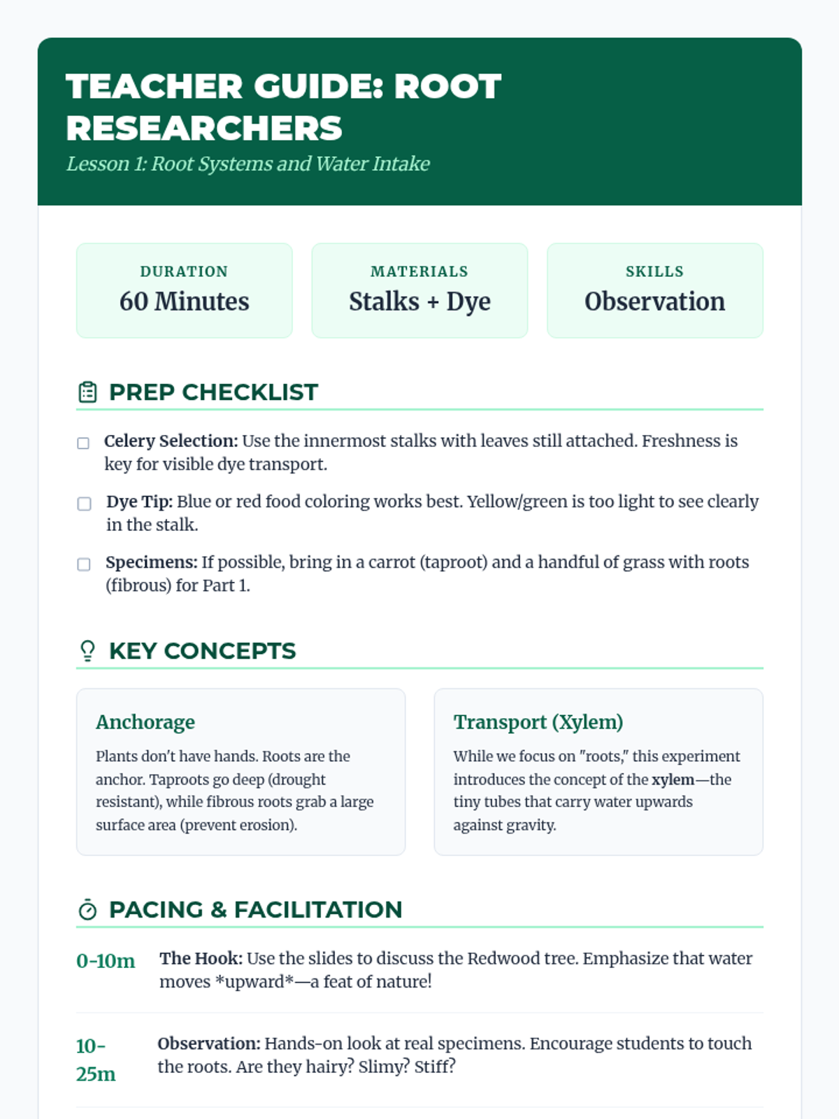 A comprehensive 4th-grade science sequence exploring plant structures and functions. Students investigate roots, stems, leaves, and flowers through hands-on experiments, culminate in a design challenge for extreme environments.