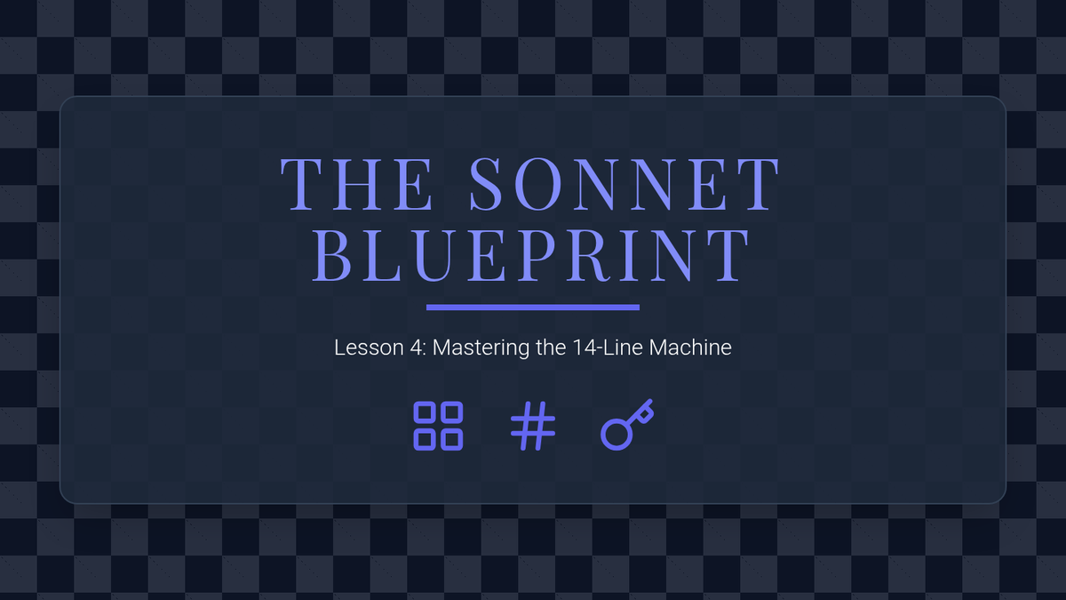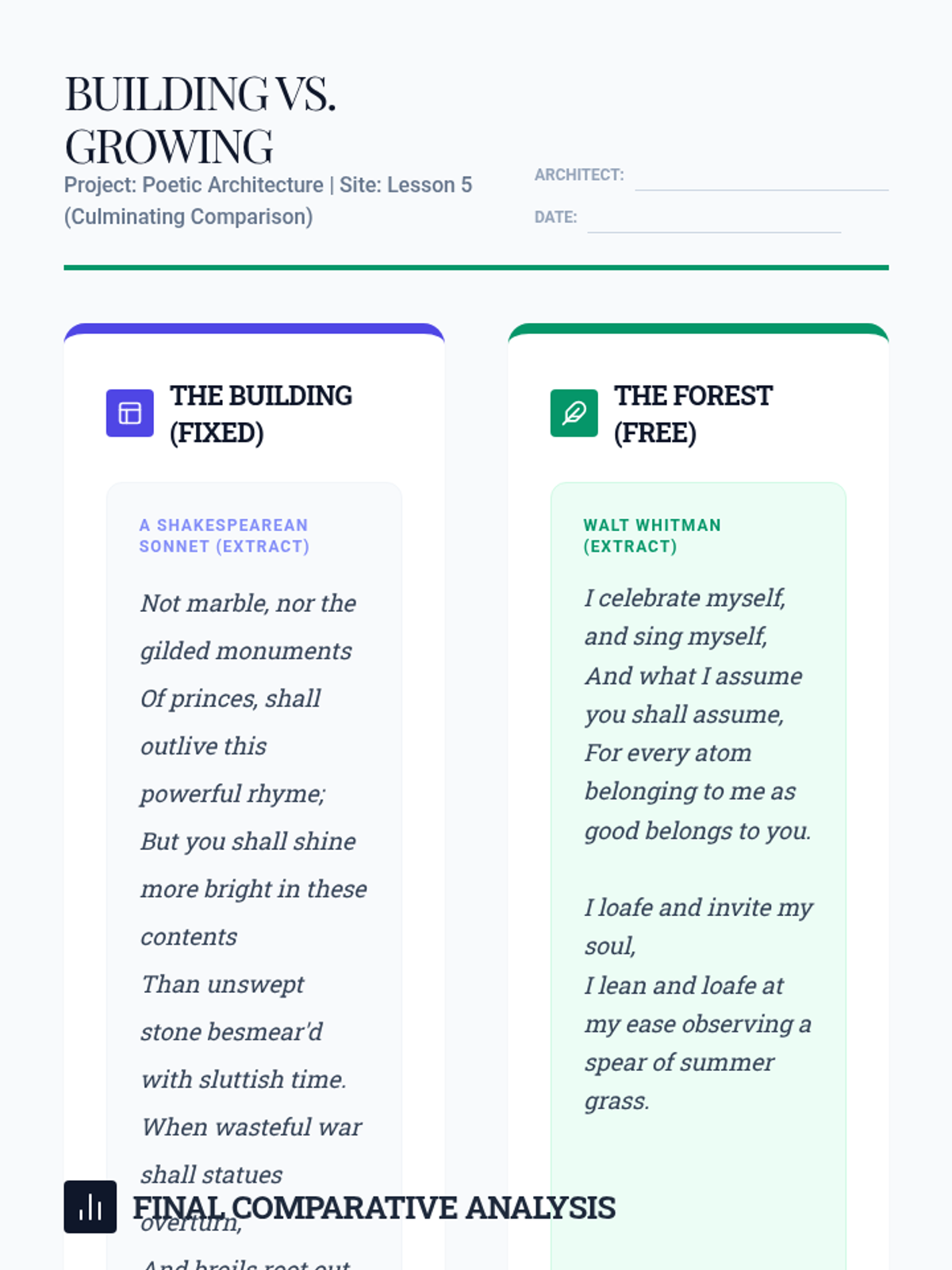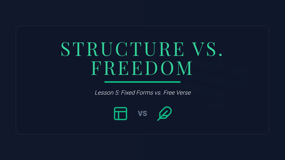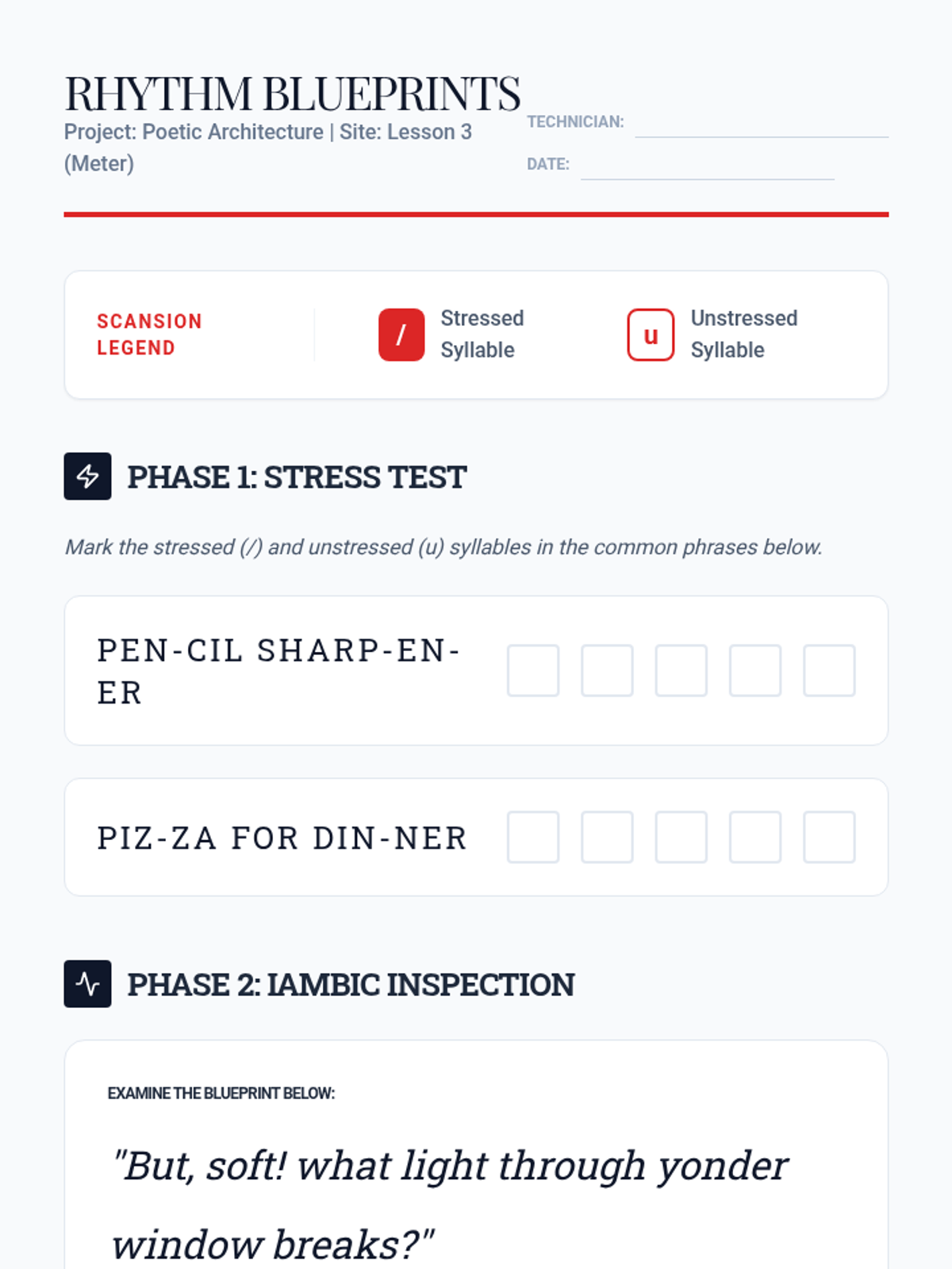 An architectural approach to analyzing poetic structure, covering line breaks, stanzas, rhyme schemes, meter, and fixed forms like the sonnet. Students learn to view poems as carefully constructed buildings where form supports meaning.