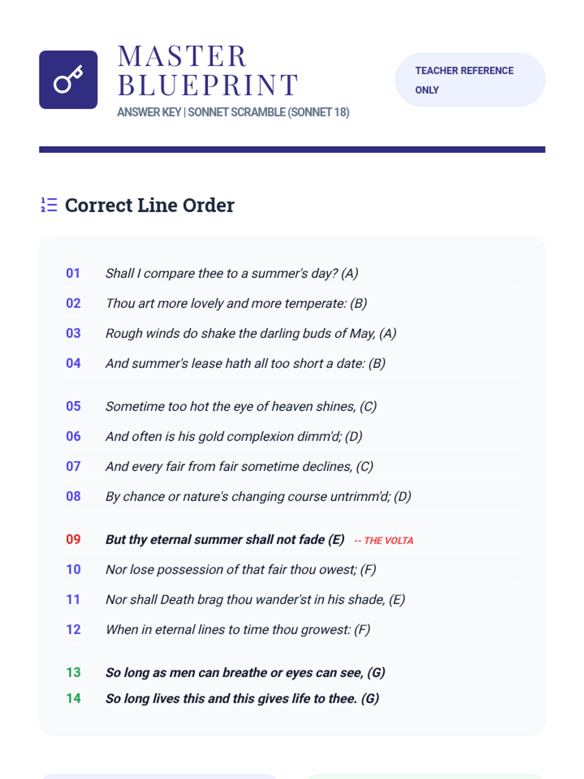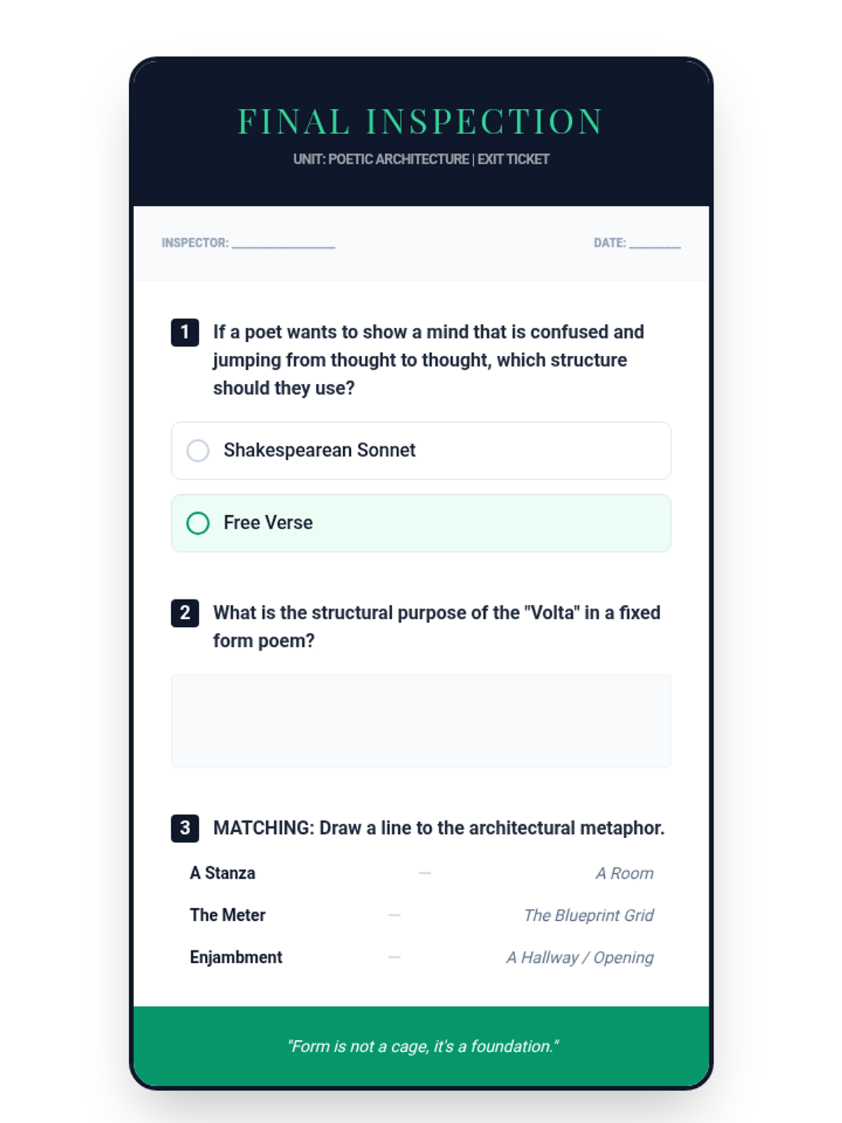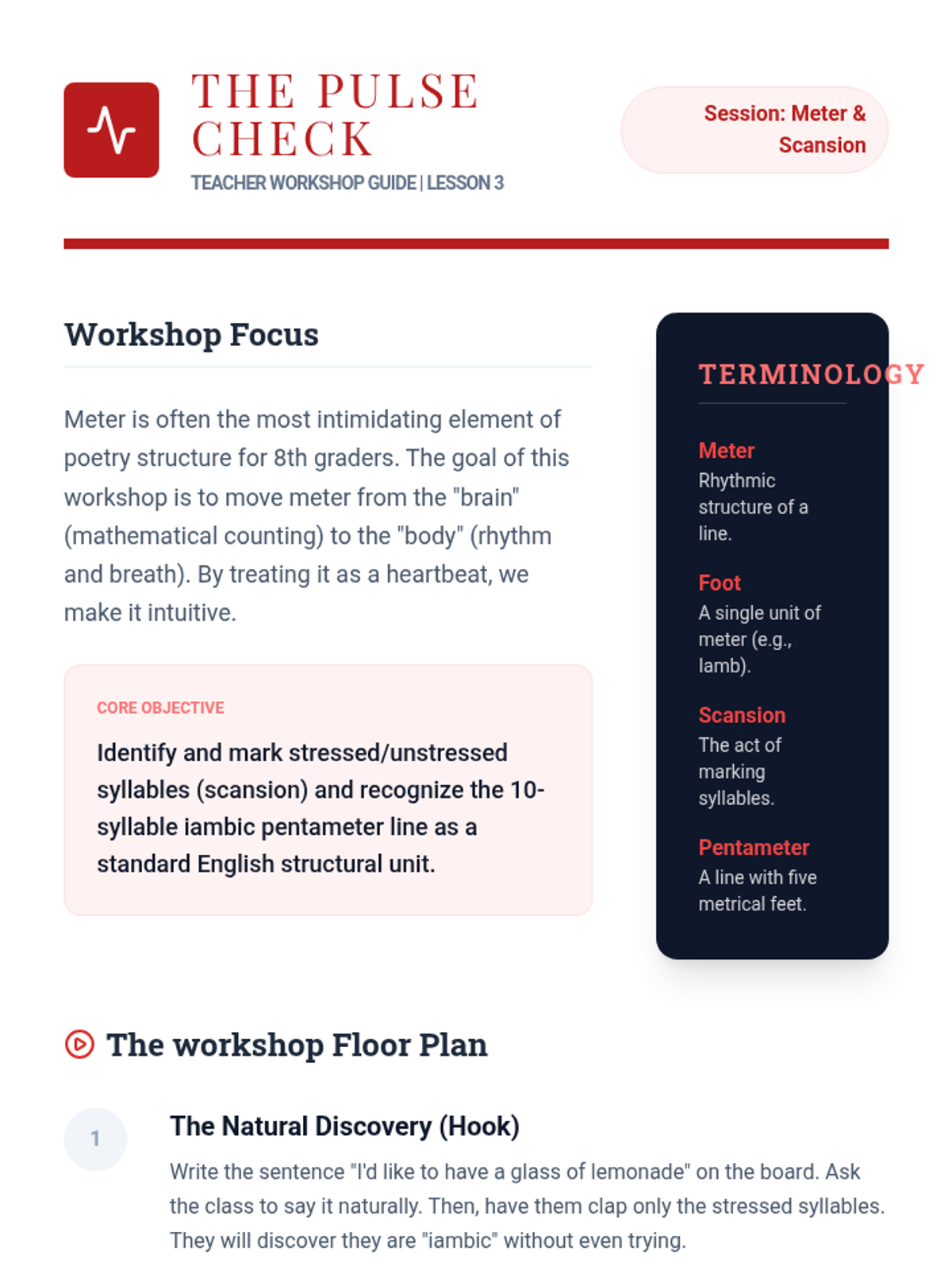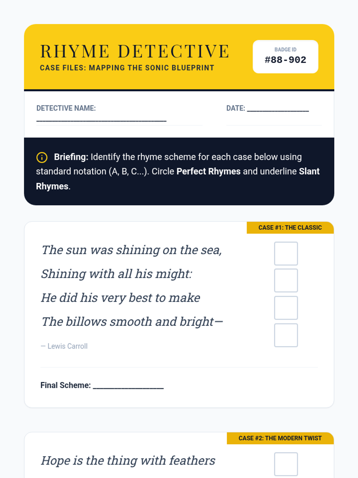 An architectural approach to analyzing poetic structure, covering line breaks, stanzas, rhyme schemes, meter, and fixed forms like the sonnet. Students learn to view poems as carefully constructed buildings where form supports meaning.