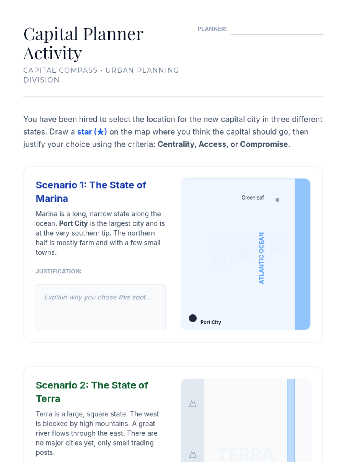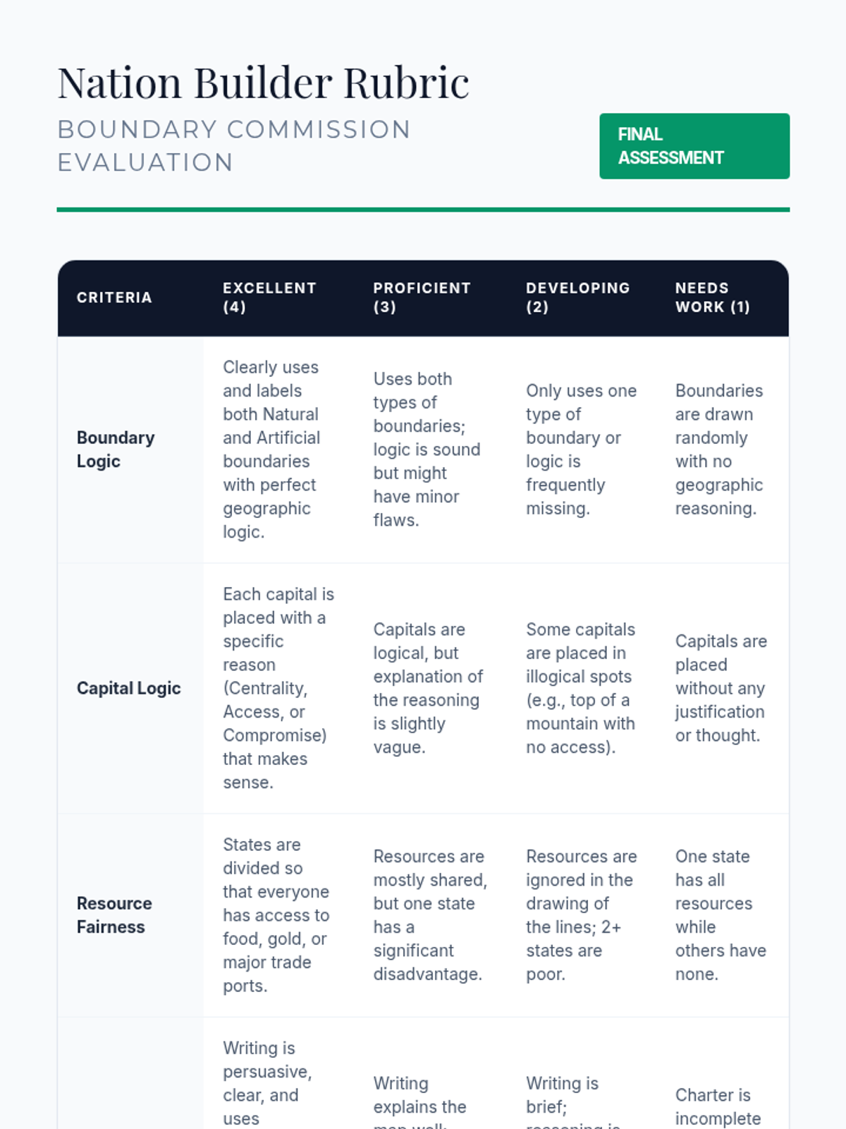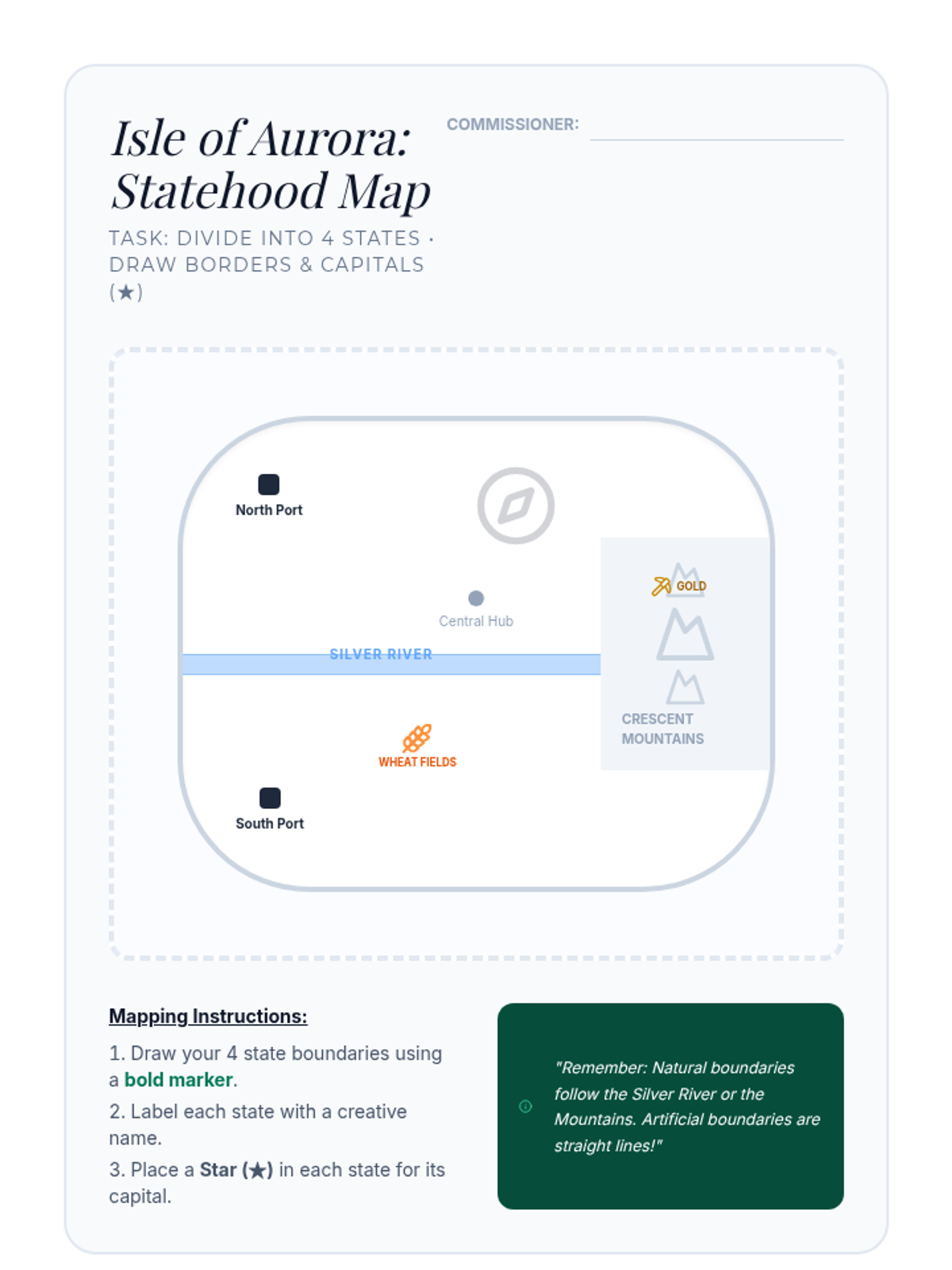 An inquiry-driven geography sequence for 6th graders exploring the 'why' behind political maps. Students analyze the history of state lines, natural vs. artificial borders, and the strategic logic of capital city placement, culminating in a redistricting simulation.