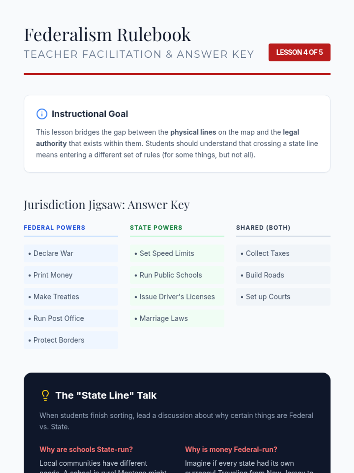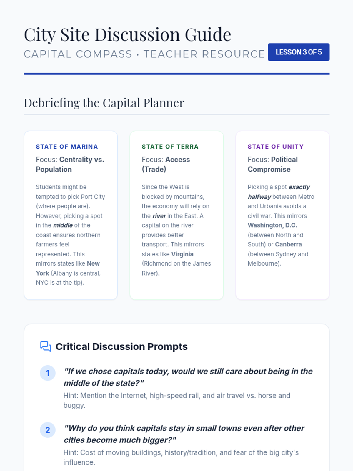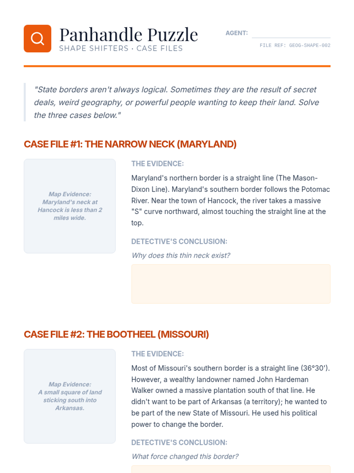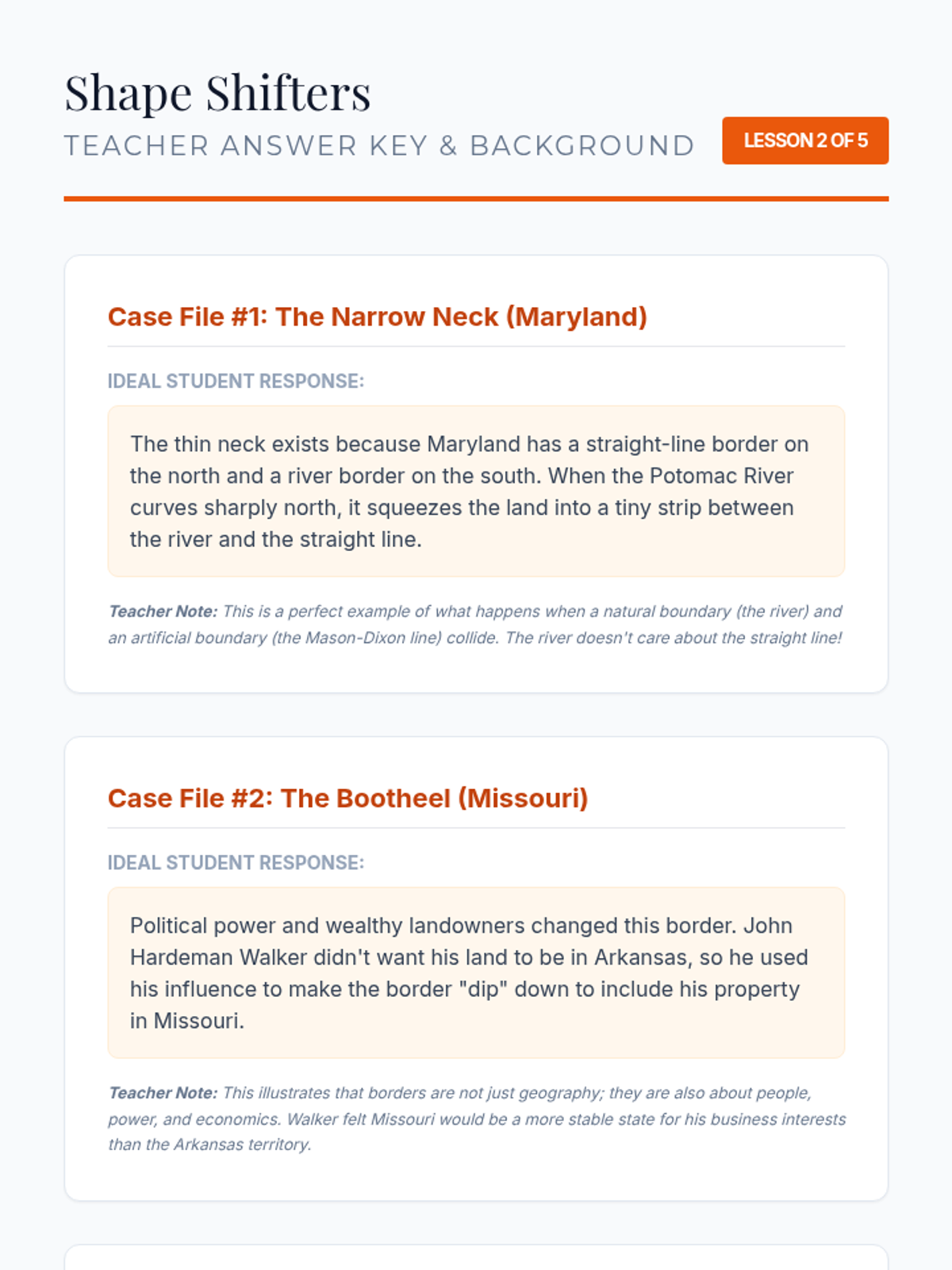 An inquiry-driven geography sequence for 6th graders exploring the 'why' behind political maps. Students analyze the history of state lines, natural vs. artificial borders, and the strategic logic of capital city placement, culminating in a redistricting simulation.