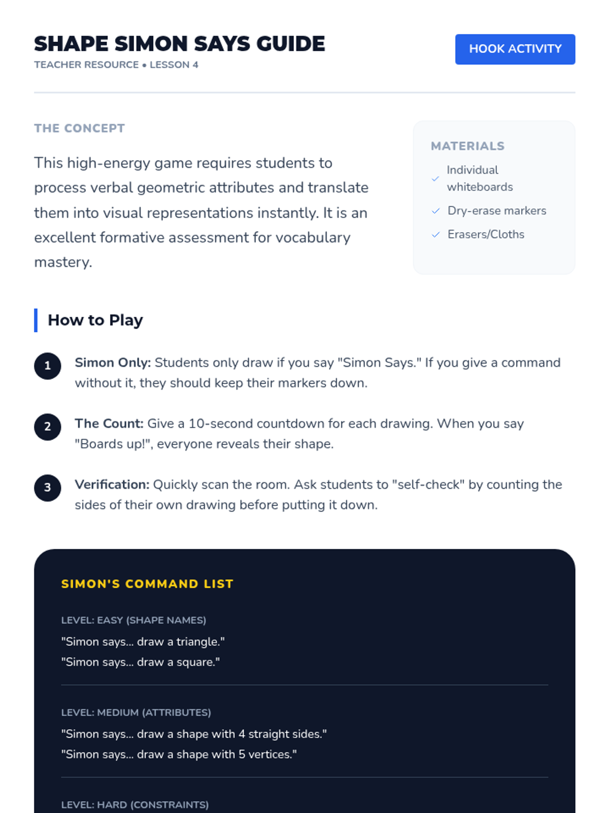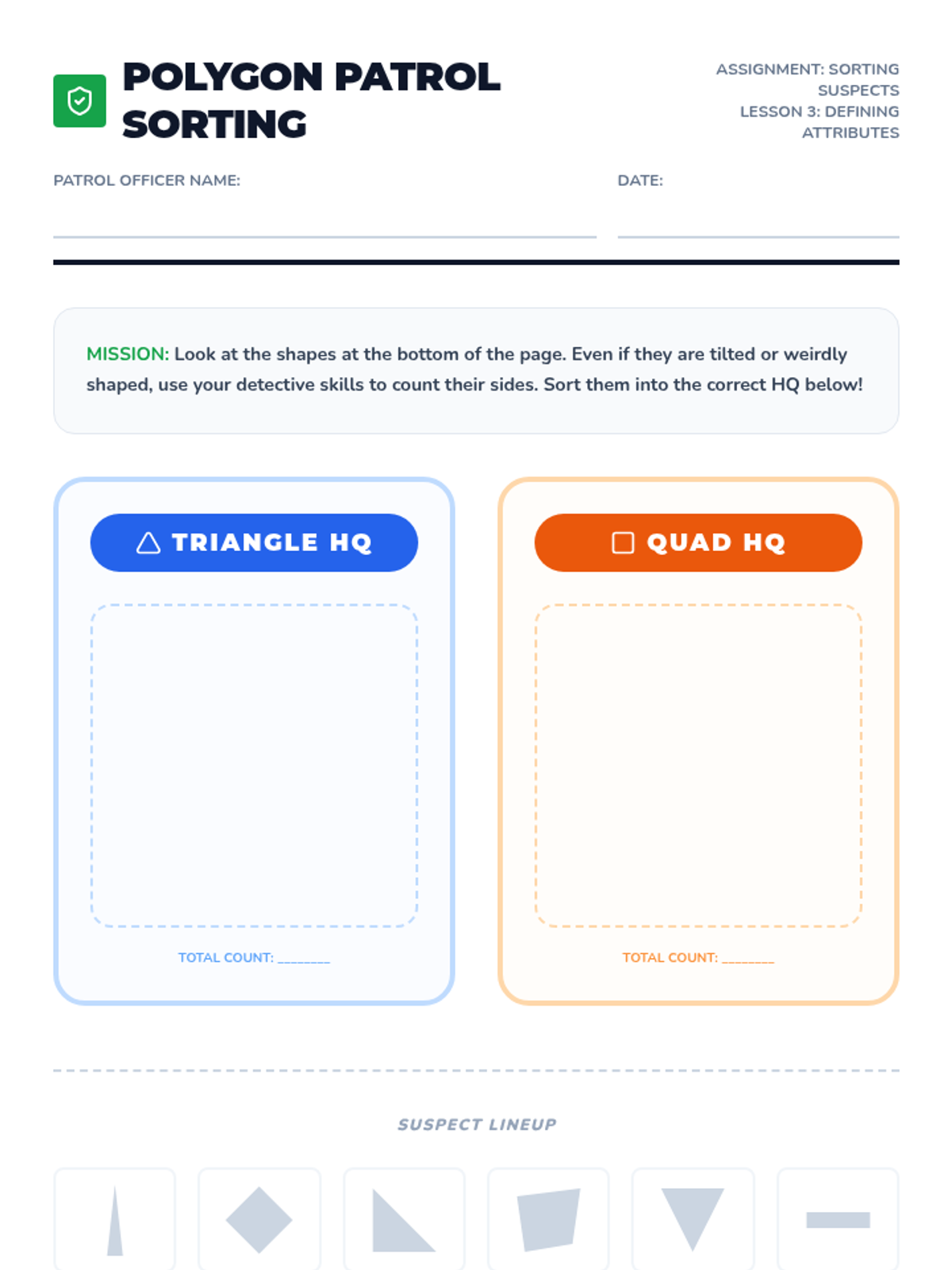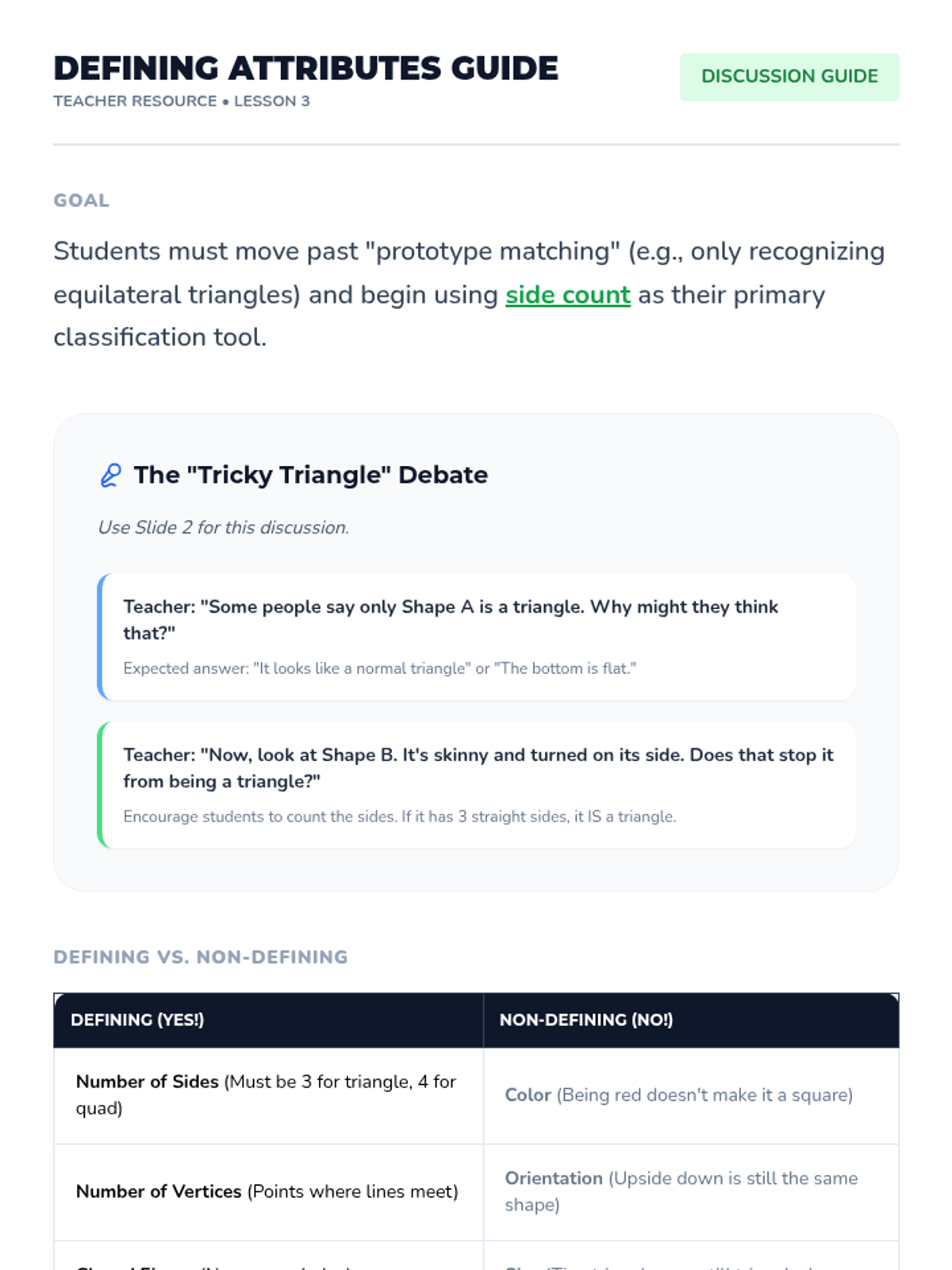 A comprehensive geometry sequence for 2nd grade focusing on the defining attributes of two-dimensional polygons, including sides, vertices, and classification of triangles, quadrilaterals, pentagons, and hexagons.