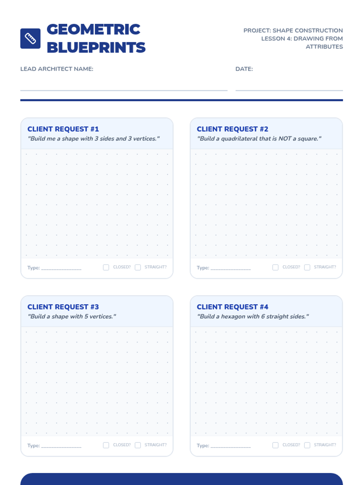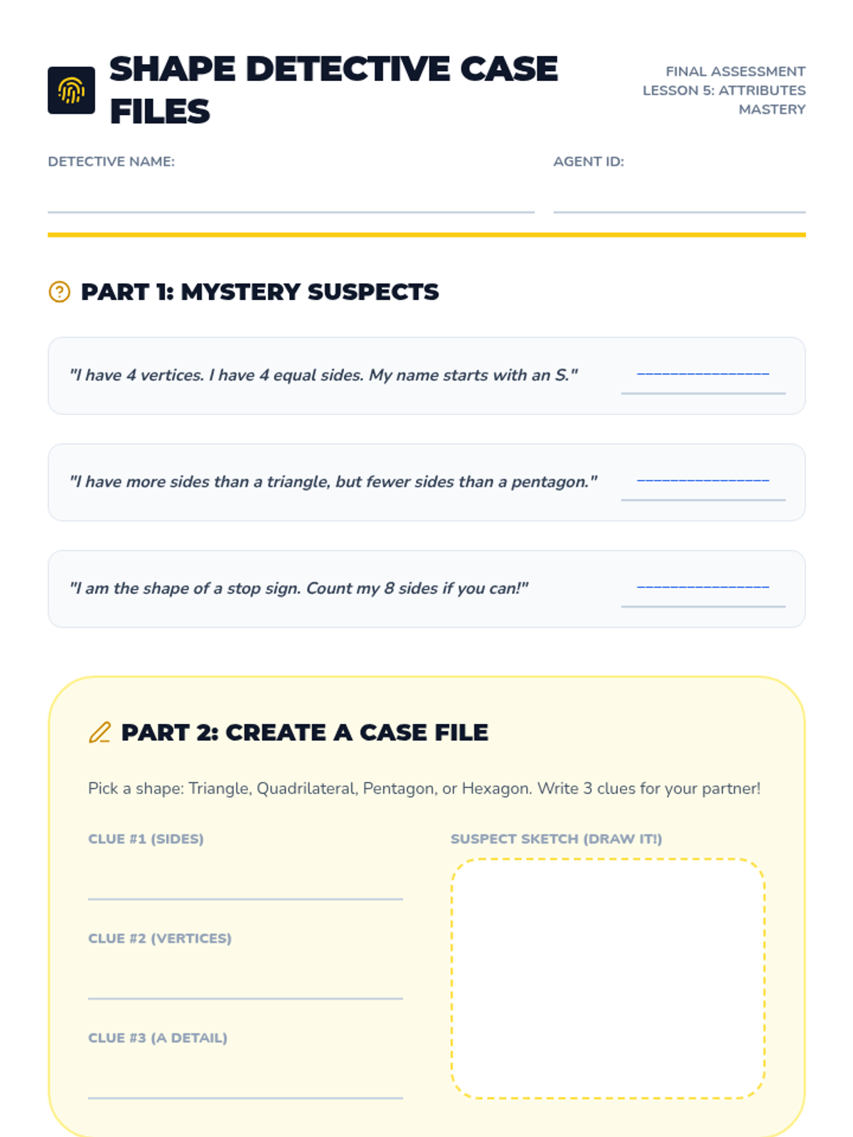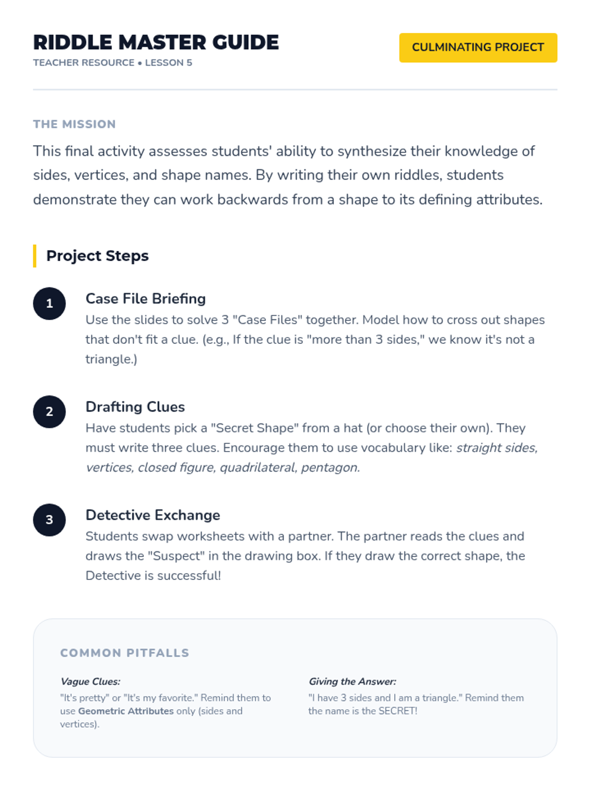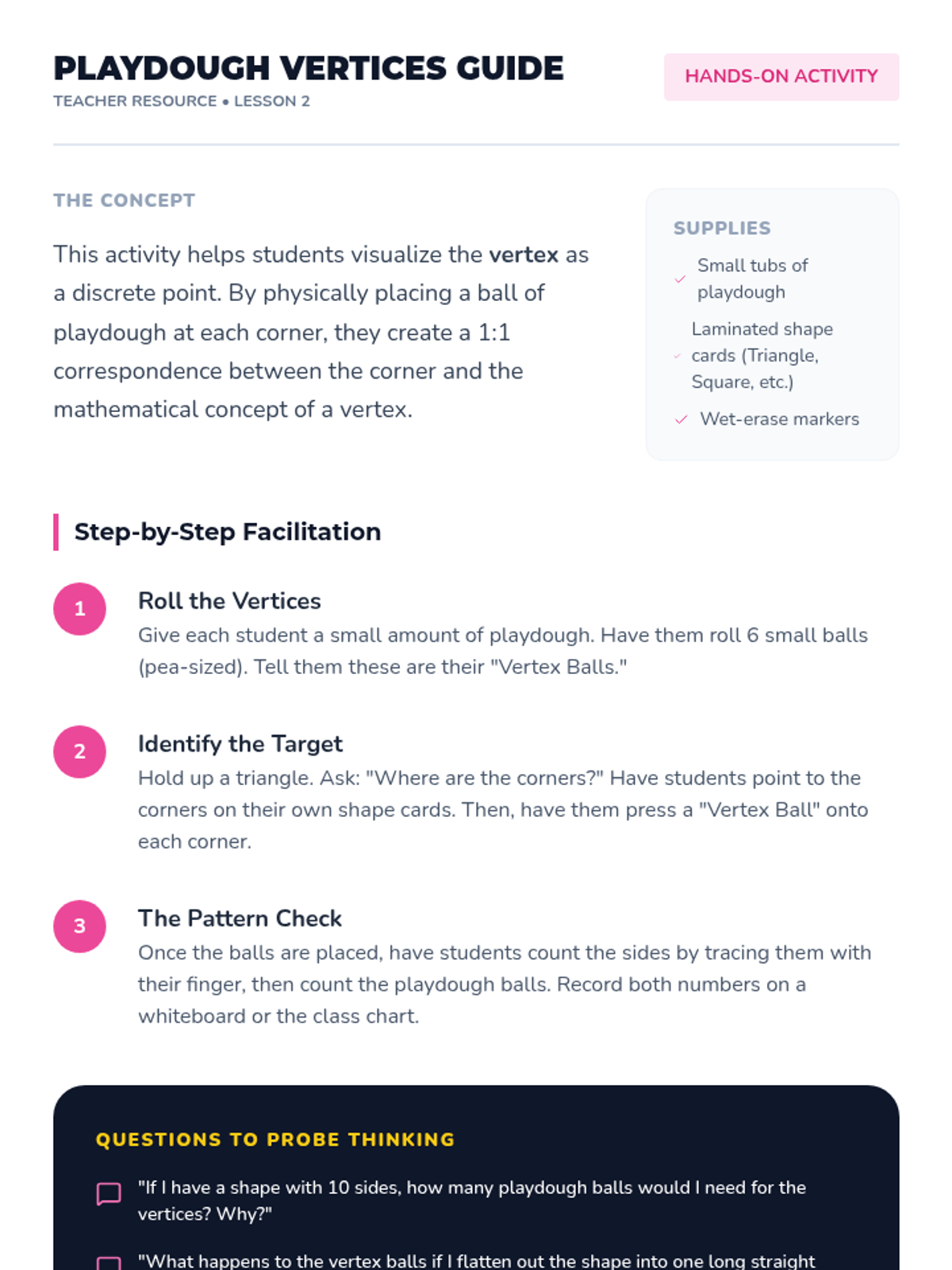 A comprehensive geometry sequence for 2nd grade focusing on the defining attributes of two-dimensional polygons, including sides, vertices, and classification of triangles, quadrilaterals, pentagons, and hexagons.