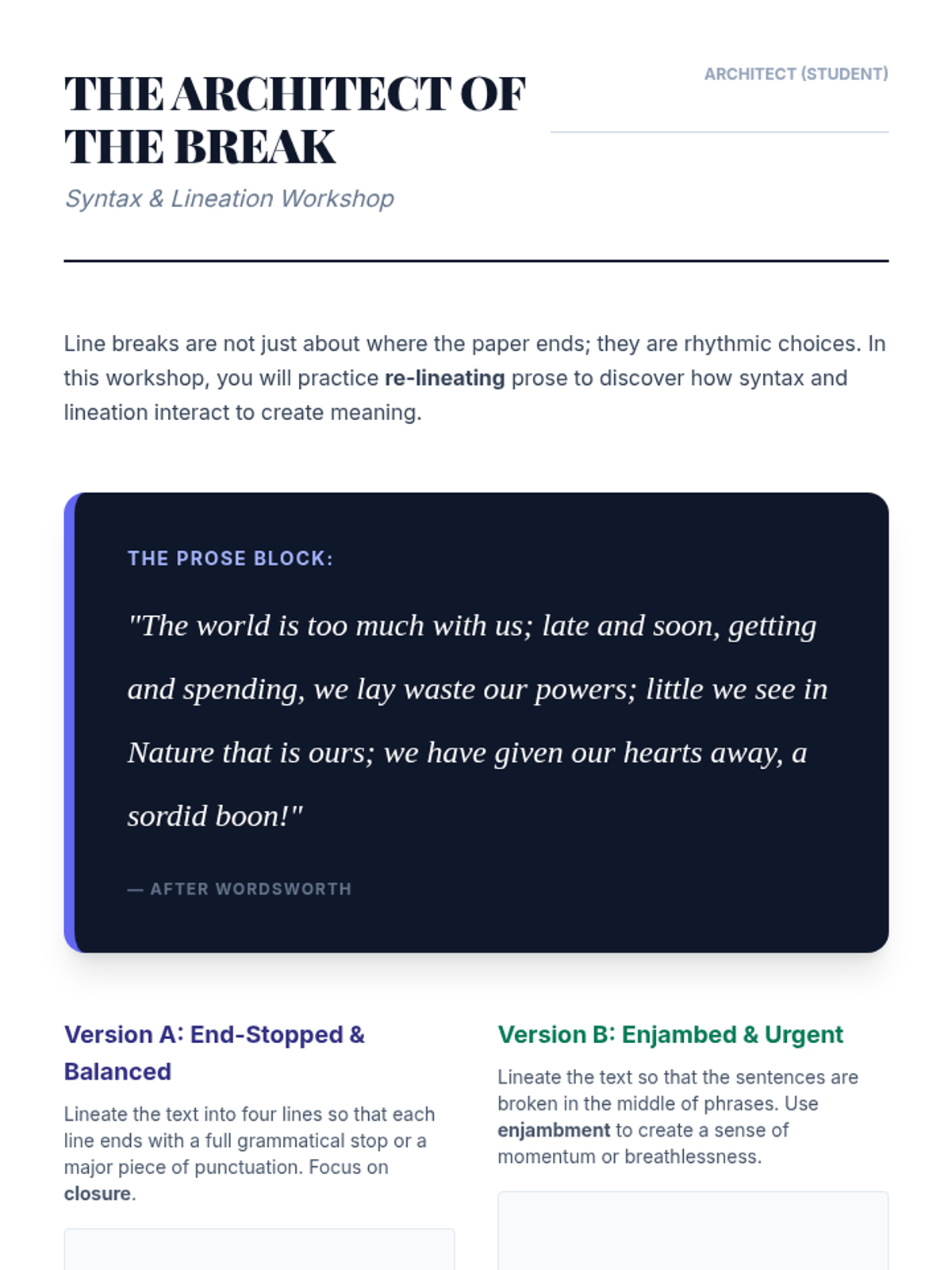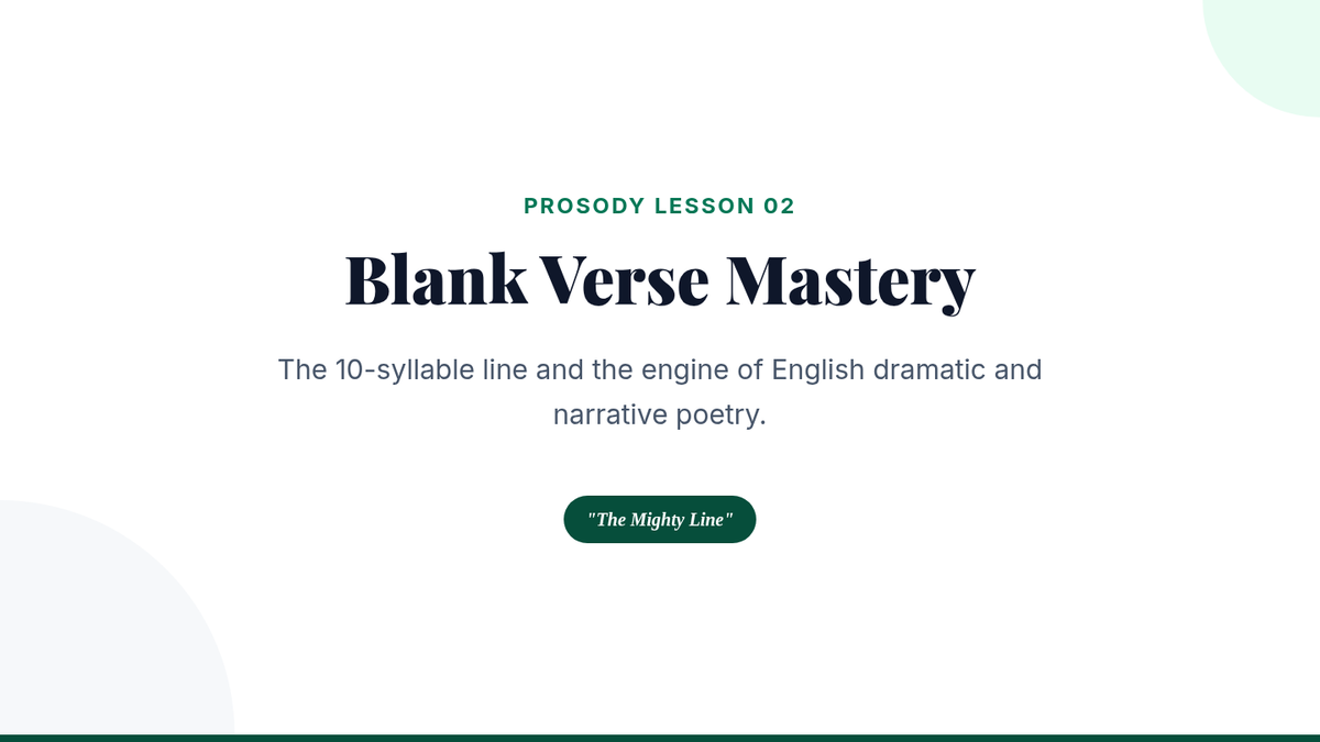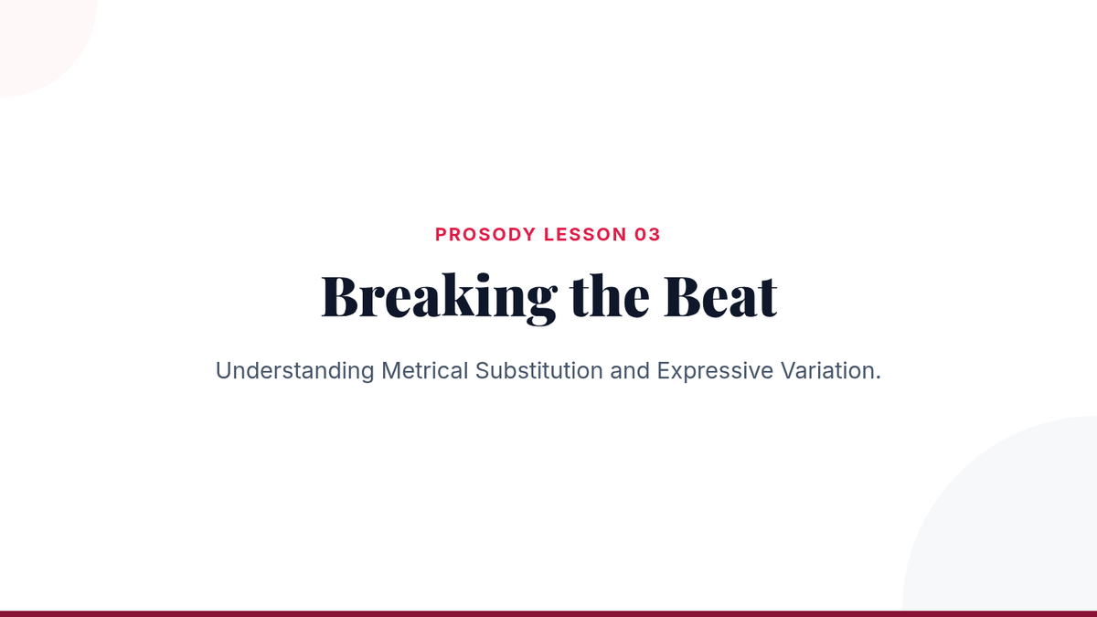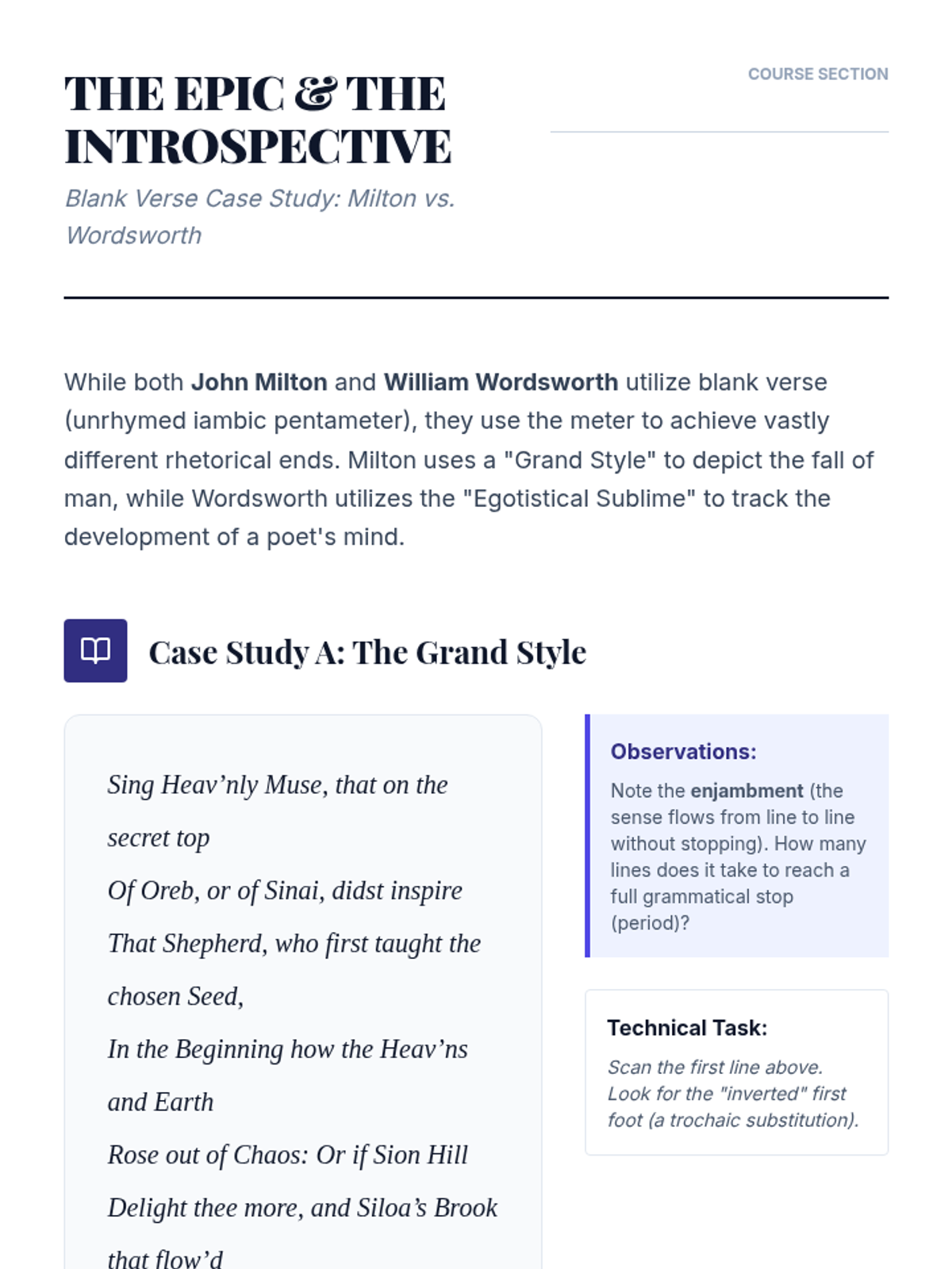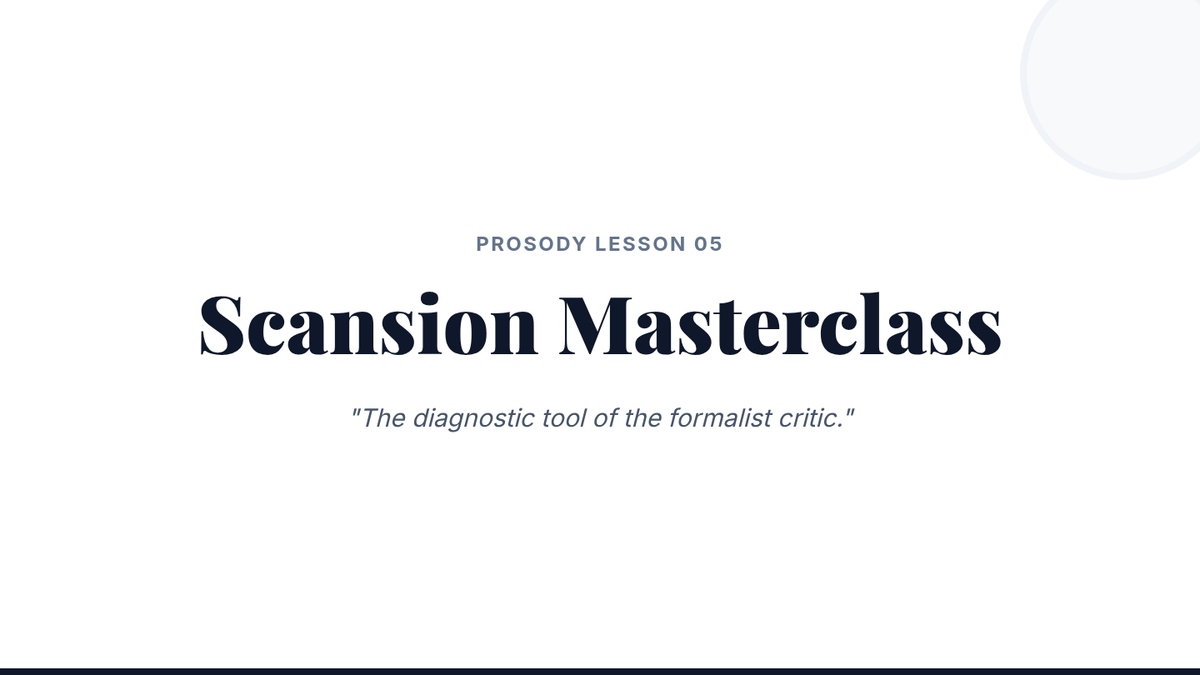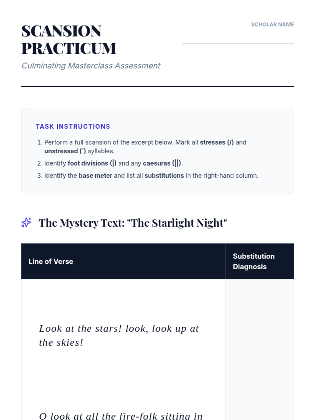 A rigorous undergraduate-level exploration of English prosody, focusing on the mechanics of metrical structures, scansion techniques, and the rhetorical implications of formal verse. Students move from basic foot identification to complex analysis of substitutions, caesuras, and the tension between meter and natural speech.