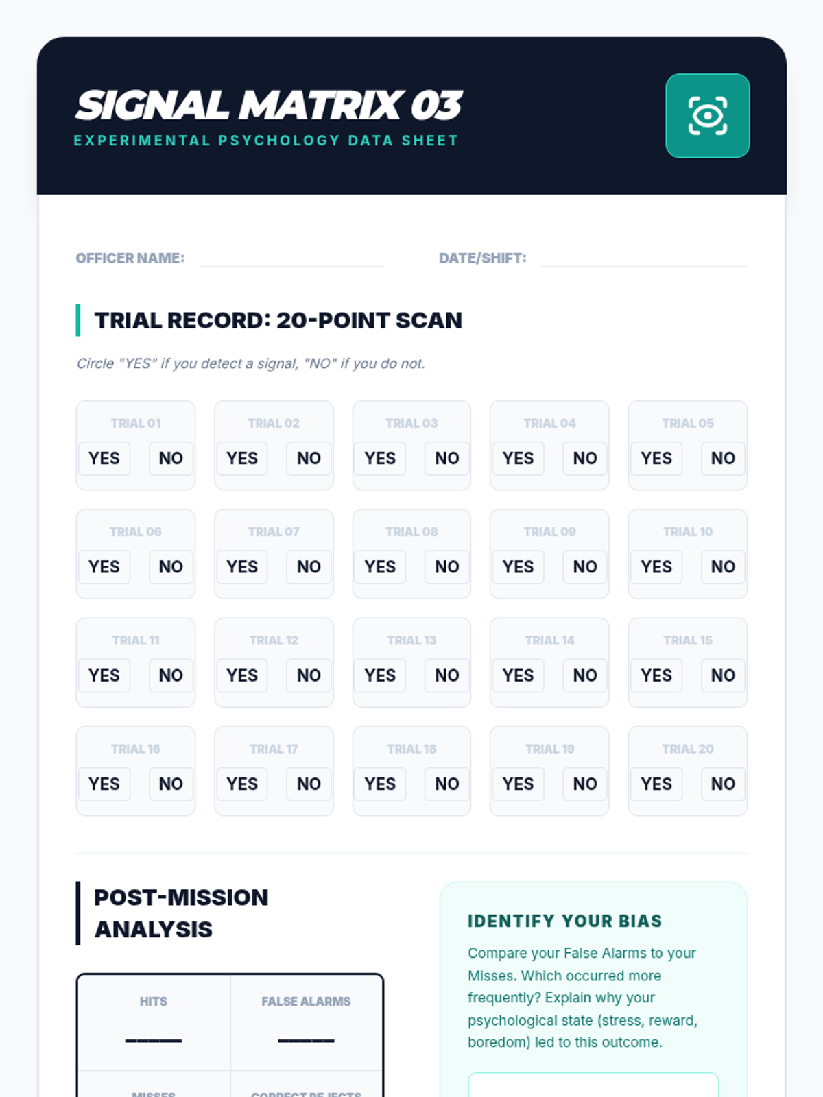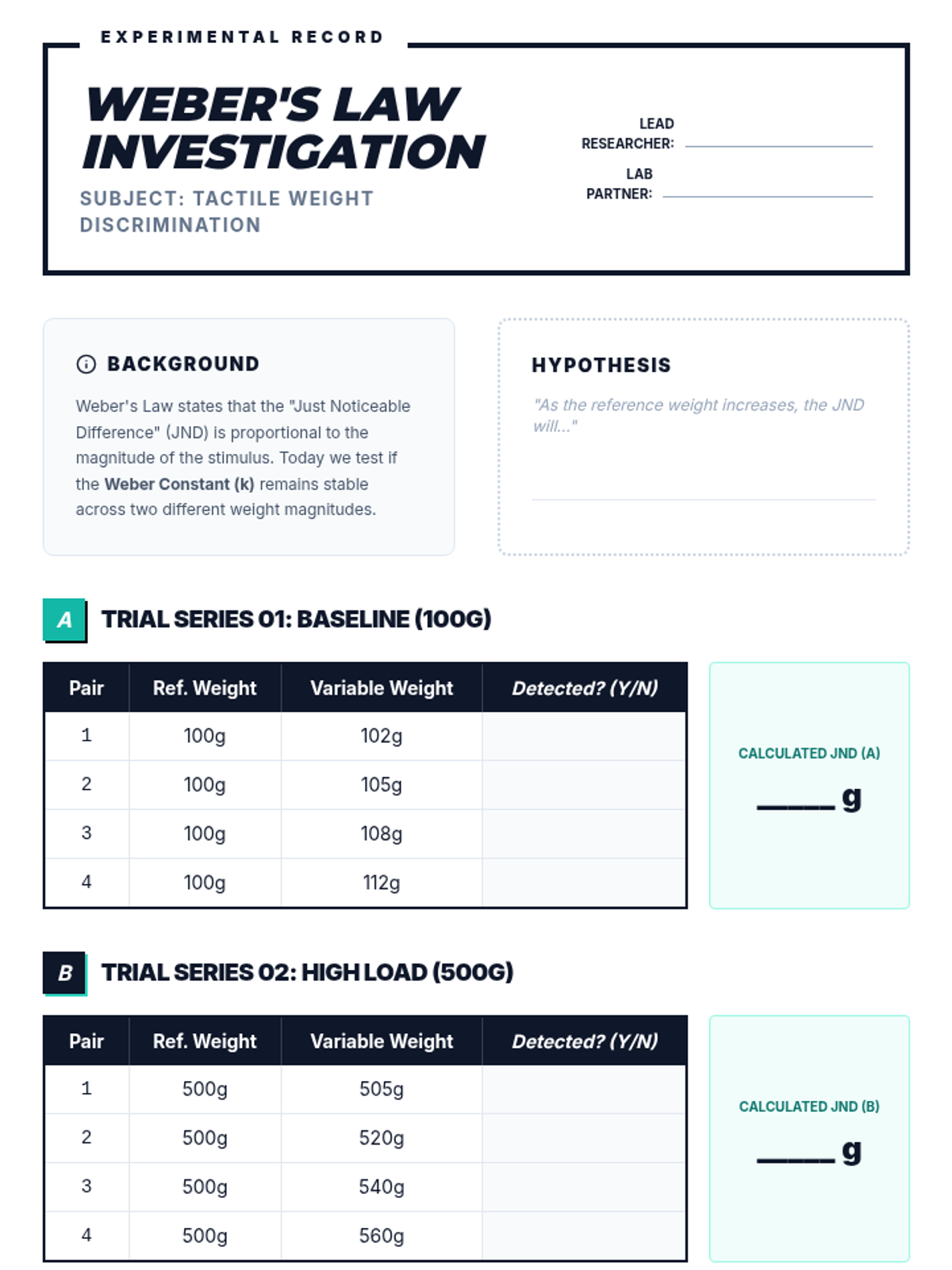 A comprehensive 12th-grade psychology unit exploring the quantitative relationship between physical stimuli and sensory experience. Students investigate transduction, absolute and difference thresholds (Weber's Law), Signal Detection Theory, and sensory adaptation through experimental labs and data analysis.
