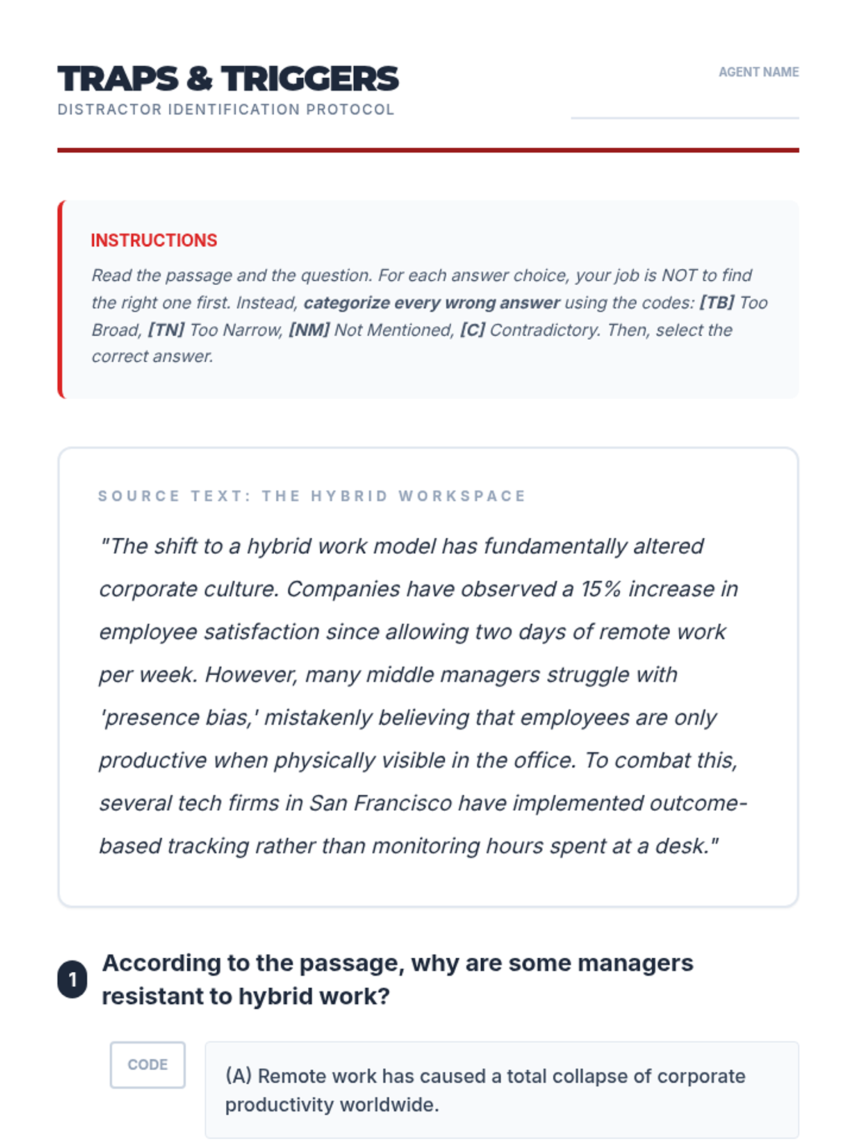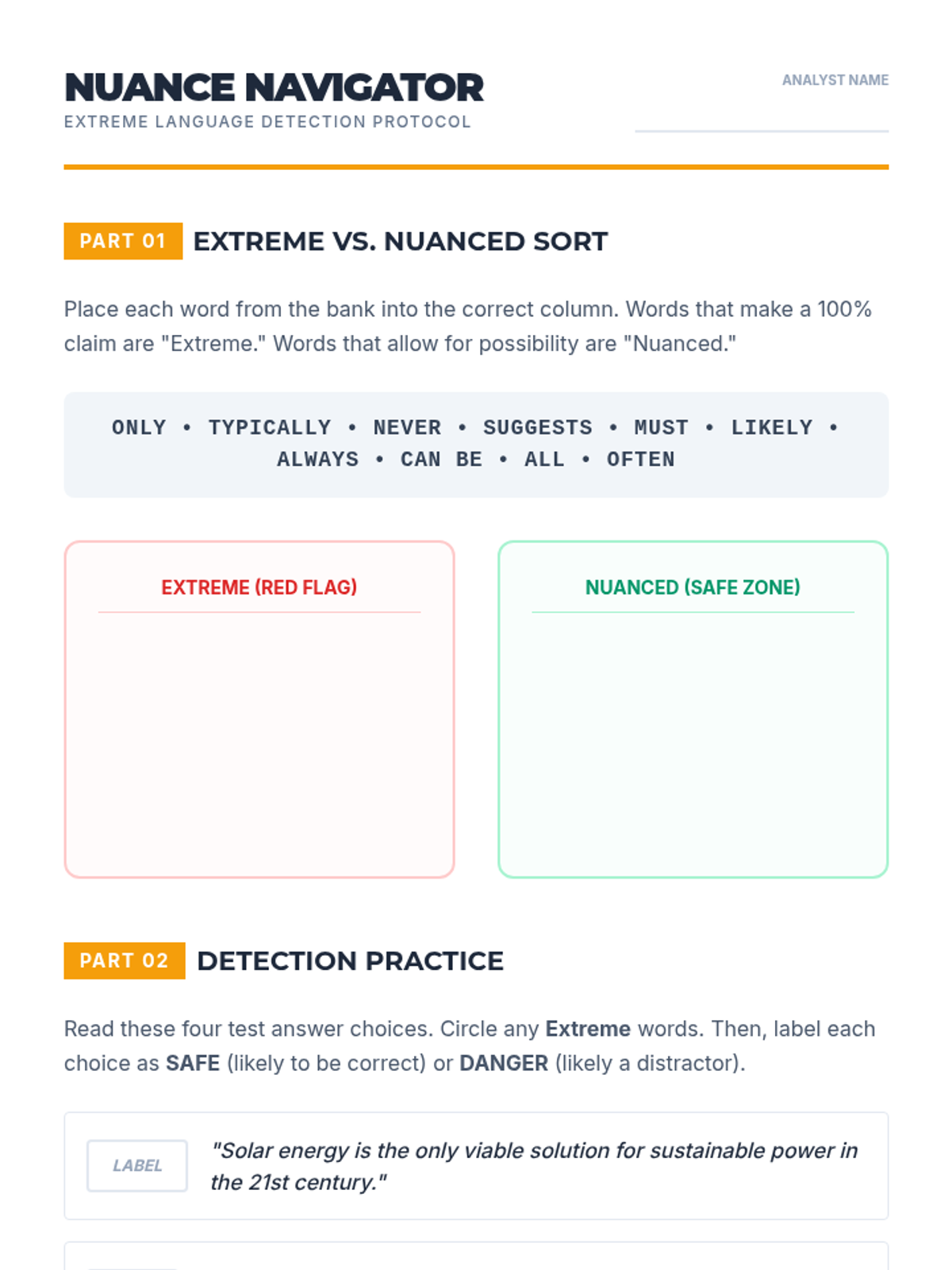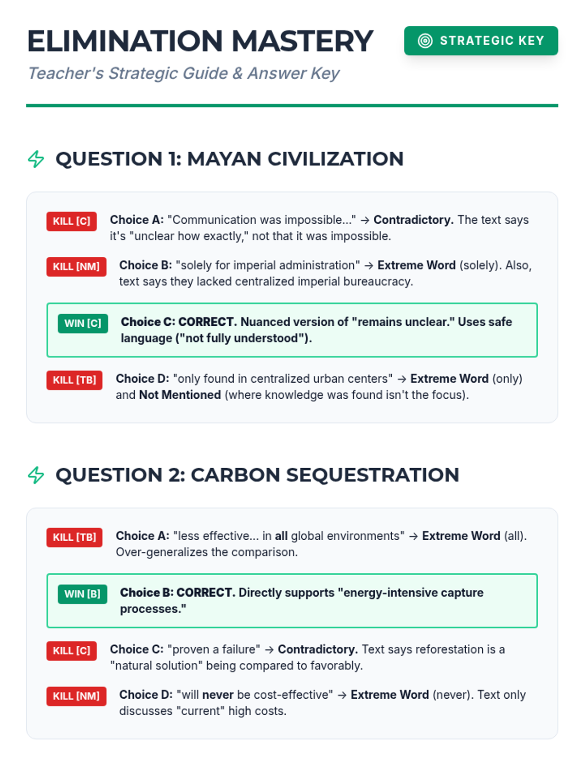 A comprehensive unit for undergraduate ESL students to deconstruct the logic of standardized tests, focusing on question stems, distractor categorization, absolute language detection, and the process of elimination.