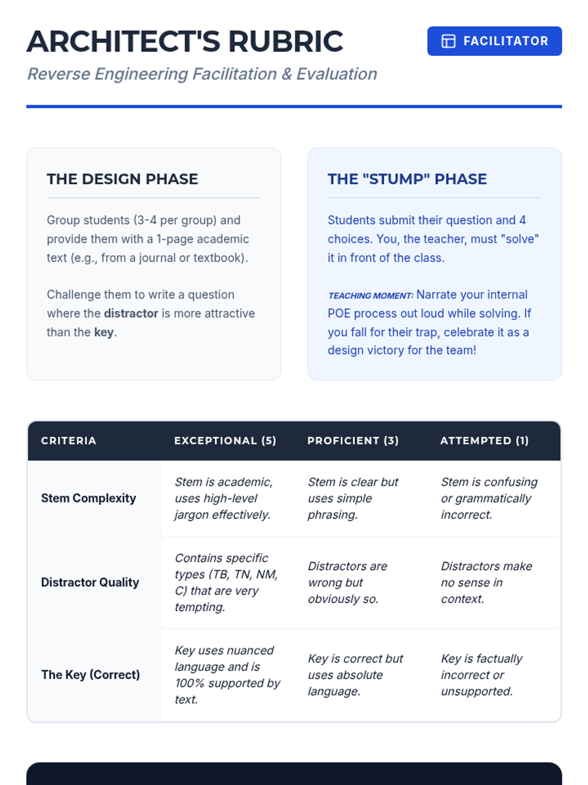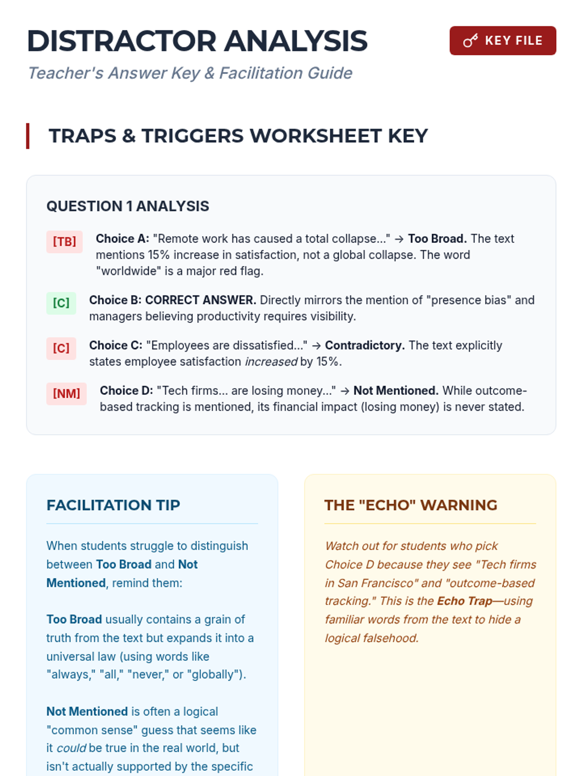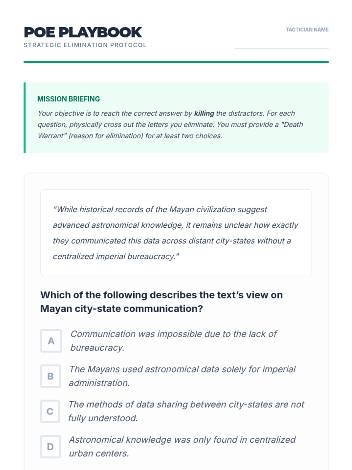 A comprehensive unit for undergraduate ESL students to deconstruct the logic of standardized tests, focusing on question stems, distractor categorization, absolute language detection, and the process of elimination.